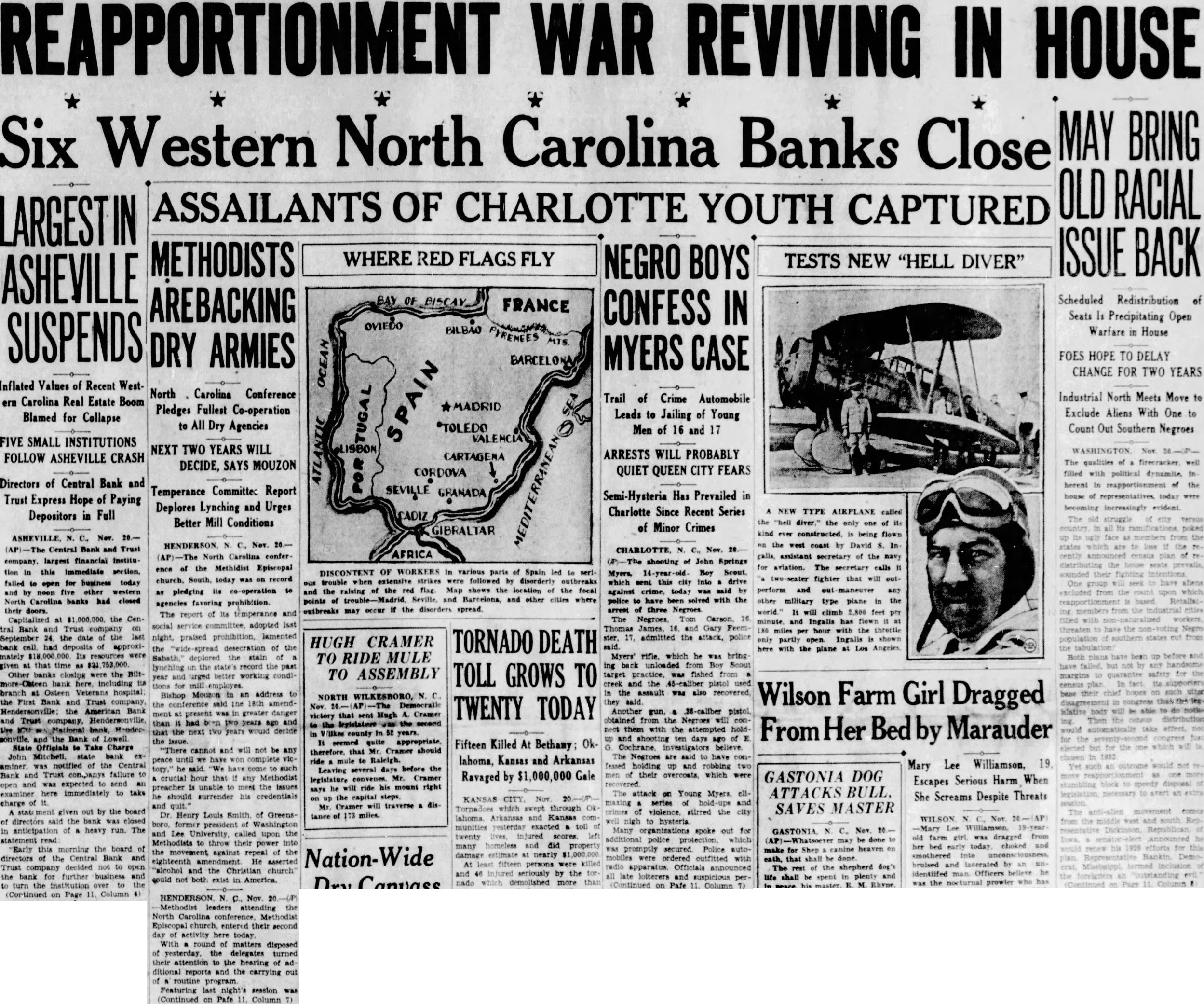 SUSPENDS REAPPORTIONMENT WAR REVIVING IN HOUSE MAY BRING Six Western North Carolina Banks Close OLD RACIAL ASSAILANTS OF CHARLOTTE YOUTH CAPTURED ISSUE BACK METHODISTS WHERE RED FLAGS FLY NEGRO BOYS TESTS NEW "HELL DIVER" ASHEVILLE AREBACKING DRY ARMIES OF Scheduled Redistribution of BISCAY FRANCE CONFESS IN Seats Is Precipitating Open OVIEDO BILBAO Warfare in House MYERS CASE FOES HOPE TO DELAY BARCELONA OCEAN CHANGE FOR TWO YEARS Inflated Values of Recent Western Carolina Real Estate Boom Blamed for Collapse FIVE SMALL INSTITUTIONS FOLLOW ASHEVILLE CRASH Directors of Central Bank and Trust Express Hope of Paying Depositors in Full Central Bank and Trust financial this to for business today by noon five other western Carolina banks had closed their doors. the tral and Trust the of the bank of Its resources were given time as were the Biltat the First and the American Officials to Take state exof the Central and failure and to an to take charge of given out by the board directors said the bank closed in run. The statement read this the board of directors of the Bank and Trust to open the bank for business and to turn the over to the (Cortinued on Page Column North Carolina Conference Pledges Fullest Co-operation to All Dry Agencies NEXT TWO YEARS WILL DECIDE, SAYS MOUZON Temperance Committee Report Deplores Lynching and Urges Better Mill Conditions Nov. North Carolina of the Methidist on as agencies The of and last the of the the state's record working condiyear for mill to at present in and that the would the and be any we to Dr. Louis former Lee the to their the against repeal the eighteenth He asserted and the could not exist in HENDERSON leaders North Carolina entered their day activity With round of matters disposed yesterday, the turned their attention to the of ditional reports and the out of routine Featuring last session was (Continued on Pafe 11. Column 7) Trail of Crime Automobile Leads to Jailing of Young Men of 16 and 17 ARRESTS WILL PROBABLY QUIET QUEEN CITY FEARS Semi-Hysteria Has Prevailed in Charlotte Since Recent Series of Minor Crimes which this against police solved the The target and the they Another from the the and shooting days The to stirred to outfitted and on Pafe 7) Industrial North Meets Move to Exclude Aliens With One to Count Out Southern Negroes