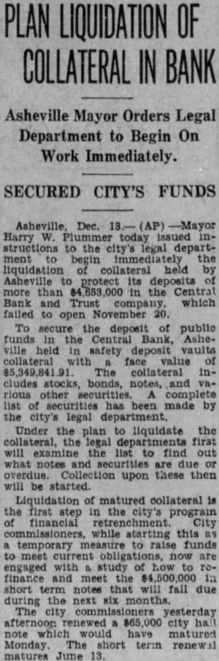 PLAN LIQUIDATION OF COLLATERAL IN BANK Asheville Mayor Orders Legal Department to Begin On Work Immediately. SECURED CITY'S FUNDS Asheville, Dec. (AP) -Mayor Harry issued inthe legal departliquidation collateral held Asheville its $4,653,000 the Central and Trust failed open November 20. To secure the deposit public the Central Bank, Asheville in safety deposit vaults value The collateral inrious other complete made by the city's legal department. Under the plan liquidate the the legal will list to find are upon will be started. matured collateral is step in the city's program financial retrenchment. while this raise to are engaged with study of how finance $4,500,000 that will fall due six The renewed city would have Monday. short term renewal matures June