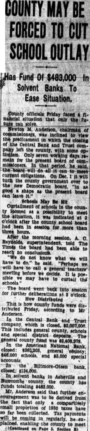 COUNTY MAY BE FORCED TO CUT SCHOOL OUTLAY Has Fund Of $483,000 In Solvent Banks To Ease Situation. County officials Friday faced A nancial situation that the ture can Newton of was to the predicament the the Bank and Trust comleft the seven days main for the present board of commissioners. that period. he will to On Dec. the turn the county over new shape the present board can leave Schools May Be loomed as possibility to meet the was o'clock after the county school board had in session for more than After the morning told Times the board had been able to no do not know what will have to said will call general sible decide. posmay to curtail the The went back session for at o'clock How Distributed This how county funds tributed Anderson. Friday, according to Mr In the Central Bank and Trust which closed. $3,007,000 includes general county, schools and district In was the National county: schools, and special the $134,000. In solvent banks in Asheville and county has funds totaling Mr. Anderson said that further enthe fact was be derived from that only 1930 taxes so far been will coming he enabling the county to (Continued on Page 5. Section