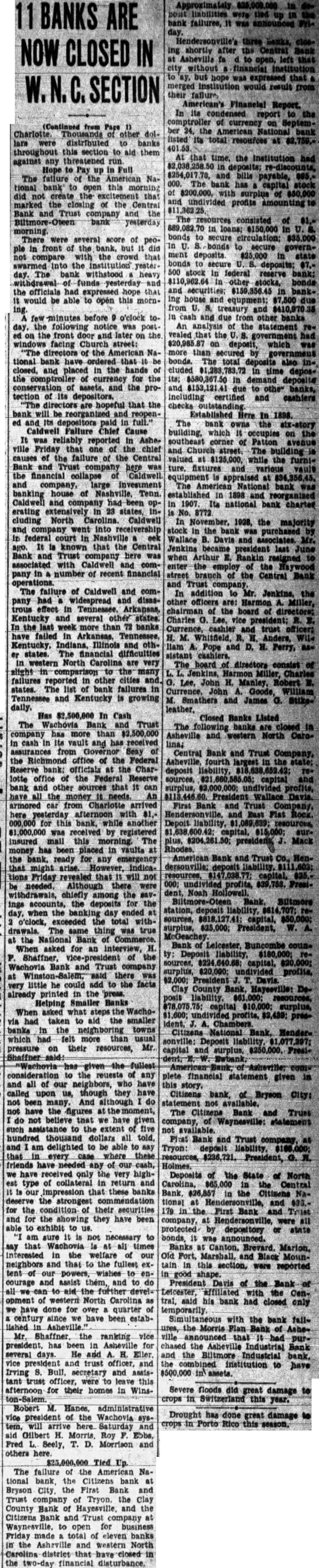 11 BANKS ARE NOW CLOSED IN SECTION (Continued from Page Charlotte Thousands dolwere distributed banks throughout this section aid them against threatened run Pay The of the American tional open this did marked of the Trust and bank yesterday morning. There were several acore of peoin front of the but compare the crowd that day. The withstood heavy the officials had would able to open this morn- few minutes before o'clock tothe following was on the door and later on the windows facing Church street: "The the National bank have closed, and the hands of the for the and the protection of "The hopeful that the bank will be reorganized and reopened its depositors paid Failure Chief Cause ville chief the of the and the Caldwell and investment banking of Tenn Caldwell company extensively 23 states, cluding North Caldwell and went into in federal ago. known that Trust here was and pany failure of Caldwell and widespread and Kentucky and states. In the more 72 banks Illinois North are the failures cities The failures in Tennessee and Kentucky is growing daily. Has $2,500,000 In Cash The Trust has in cash and has received the office of the Federal Reserve officials the Charlotte office the Federal Reserve and other sources that can the money needs. car from Charlotte afternoon with for this 1,000,000 was by insured The has been bank, ready for any emergency might Friday revealed that will not be Although there were withdrawals, chiefly among the savings accounts, the deposits for when the banking day ended the withThe thing was true asked for an and Trust company said little he could add the facts very already printed the Helping Smaller Banks When what steps the Wachovia had taken aid smaller towns which had on resources, Mr. pressure Shaffner fullest reuests any all our neighbors, who called though they have not been many. although have the at moment, believe we have assistance extent five thousand all and am delighted be able to that hightype return and these banks the strongest for the condition their securities and for they have been am not necessary to say Wachovia all the our neighbors and that the extent enand to all development of western North Carolina we have done for quarter century since we have been estabMr. vice has several He and Eller vice trust and Irving and tant trust this afternoon for their in WinsRobert M. Hanes, administrative vice president the Wachovia will arrive Saturday aid Gilbert Roy Ebbs, Fred Seely, T. Morrison and others The the Nathe Bryson the and the Clay County and the Citizens company at Waynesville, to open for business Friday made total eleven banks in the and western North Carolina district that closed in the two-day financial disturbance. were failures, was three closshortly Central without but merged would result from American's Financial Report. total at At that time, the Institution had in deposits; and bills 000. capital stock $50,000 and undivided profits consisted of in loans: $150,000 bonds secure circulation; $35,000 bonds secure government deposits 500 stock in federal reserve bank: securities: $159,356.45 banking house equpment; U. treasury and in cash and due from other banks An analysis the statement the government had deposit, which than secured by government also cluded deposits; $580,367.50 deposite and $153,121.41 due banks, including certified and cashiers checks Established In 1898. The owns the six-story building, which occupies on southeast corner Patton avenue and building $125,000, while the furnivarious appraised bank established 1898 1907. national bank charter is No. In November, 1928, the majority stock was purchased Wallace associates. Jenkins president last when Arthur Rankin the the Central Bank Trust addition Mr. the other officers are: Harmon chairman the board of Charles G. Lee, vice president: cashier and trust officer: M. Pope D. H. Perry, The board directors consist Charles Lee, John Manley, Robert Goode, William Smathers and James Closed Banks Listed The following banks Asheville western North CareCentral Bank and Trust Asheville, fourth deposit liability, sources, undivided profits, President Wallace Davis. First Bank and Trust and East Flat Mack American Bank and Henresources, 000; undivided profits, Noah station, sources, $25,000; President, ty: Deposit surplus, President Davis Clay County Deundivided $2,439; presChambers. Citizens National Bank. HenderDeposit liability, capital and plete financial statement given in Citizens bank, Bryson City: statement not available. Citizens Bank and Trues company, statement not First Bank and Trust company, at Tryon: Holmes. Deposits of the State of North Central $26,857 Naand 179 First Bank and were protected depository or state announced. Old Mounthis reported in President of the Bank with his bank had closed only temporarily Simultaneous with the bank the Morris Plan Asheville announced had the Asheville Industrial Bank and the Industrial to have $500,000 in Severe floods did great damage to in this year. Drought has done great damage crops in Porto Rico this season.
