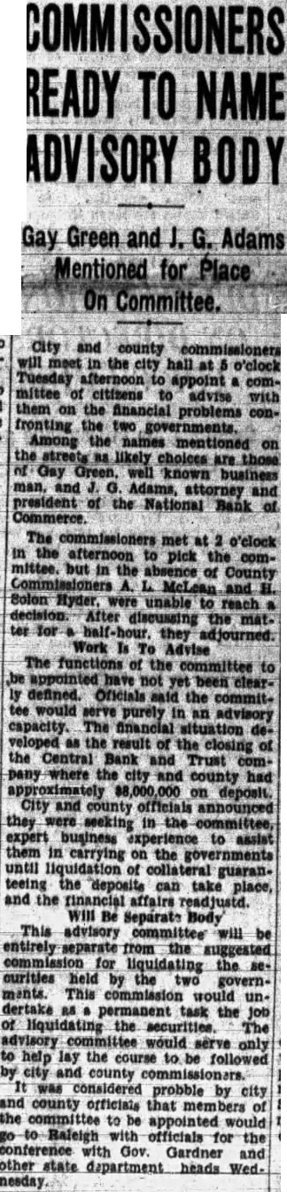 COMMISSIONERS READY TO NAME ADVISORY BODY Gay Green and J. G. Adams Mentioned for Place On Committee. and county will meet the city hall o'clock Tuesday appoint committee of citizens advise with them on the financial problems confronting two Among the on the choices are of Gay known business and and president Commerce of the National Bank The met at o'clock the afternoon the committee. but in the absence of County A. and Solon were unable reach After discussing the ter for Work Is To Advise The to have yet been clear Oficials said the committee would serve purely in an advisory capacity. The financial situation de veloped as the result of the closing of the Central Bank and Trust comwhere city had on deposit. City county officials announced they in the expert business to assist them in carrying on the until liquidation of collateral the can take and the affairs readjustd. Will Be Separate This advisory committee will be entirely the commission for the curities held by the ments. This commission would undertake permanent task the of liquidating the The advisory would serve to help lay the to be followed by city and considered probble by city and county officials that the to committee Raleigh appointed with officials conference Gov. Gardner for and the other state department heads nesday
