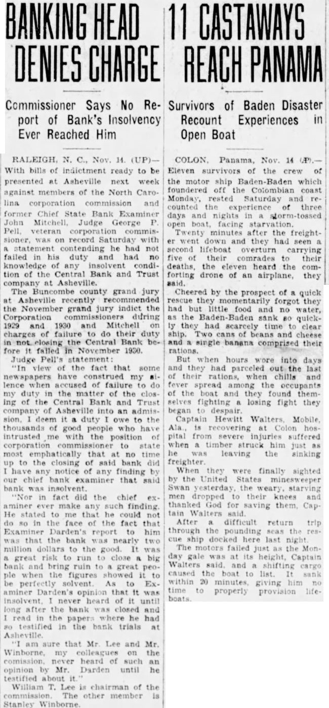 HEAD 11 CASTAWAYS DENIES CHARGE REACH Commissioner Says No Report of Bank's Insolvency Ever Reached Him RALEIGH, N. C., Nov. 14. (UP)With bills of indictment ready to be presented at Asheville next week against members of the North Carolina corporation commission and former Chief State Bank Examiner Mitchell, Judge George Pell, corporation sioner record he had not failed his duty had condition of the Central Bank and Trust at Asheville. The county grand jury Asheville recently the November grand jury indict the Corporation during 1929 and 1930 and Mitchell failure do their duty Central Bank fore falled in November 1930. Judge Pell's "In view the fact that newspapers have my lence accused of failure to do duty the the closIng of Central and Trust an admisowe the thousands of good intrusted with the of to state most emphatically that at no time to the closing said bank did notice any finding our bank examiner that said did the chief any He stated that he could not do the face of the fact that Examiner Darden's report him was that the bank nearly million dollars to the good. It great run close big bank and great peofigures solvent As Examiner opinion was insolvent. heard of long after the bank closed read the where he had testified in the bank trials at Asheville am sure that Lee and Mr. Winborne, the heard an opinion Mr. Darden until he testified about William Lee chairman of the The other member Stanley Survivors of Baden Disaster Recount Experiences in Open Boat COLON Panama, Nov. 14 Eleven the of the ship which foundered off Colombian coast Monday, Saturday counted three days nights open facing starvation. Twenty minutes after the freighter went they seen lifeboat overturn carrying five comrades deaths, the heard the comforting of an airplane, they said. Cheered by the prospect of quick rescue forgot they had but little food and no water, as the sank 80 quickly had clear ship. and cheese single banana comprised their rations. But when hours wore into and they had parceled the their when chills spread among the occupants of the themselves fighting losing fight they Captain Hewitt Walters Mobile pital severe suffered when timber struck him just he leaving the sinking freighter finally sighted by the United their knees and thanked God for saving Captain Walters After difficult return trip through the pounding seas the cue docked last night The motors failed the Monday height, Captain Walters shifting caused the within 20 minutes, giving time to properly provision lifeboats