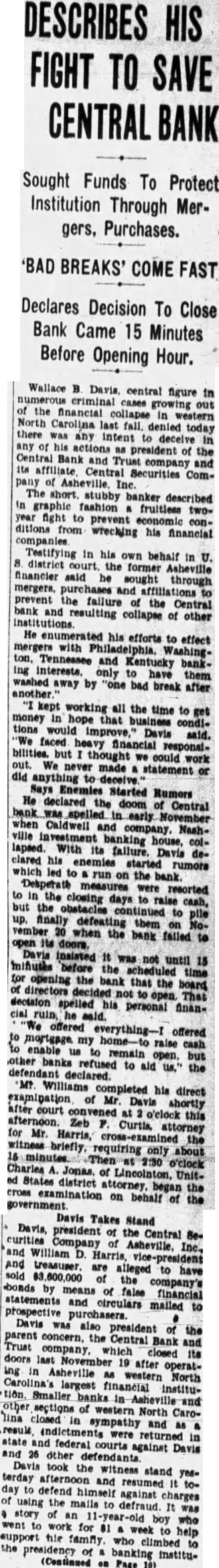 DESCRIBES HIS FIGHT TO SAVE CENTRAL BANK Sought Funds To Protect Institution Through Mergers, Purchases. 'BAD BREAKS' COME FAST Declares Decision To Close Bank Came 15 Minutes Before Opening Hour. Wallace B. Davis central figure in cases growing out of the financial In western North Carolina last fall, denied today there was any to deceive in Central actions president of the and Trust and its affiliate Central Securities Company of Asheville The short stubby banker described fashion fruitless twoyear fight to prevent conditions wrecking his financial in his own behalf in U. 8. district court the former Asheville financier said he sought through mergers, purchases And affiliations to prevent the failure of the Central and resulting collapse of other He his efforts to effect mergers with WashingTennessee and Kentucky only have washed away by "one bad break them after kept in working all the time to get hope that business Davis condi- said. 'We faced bilities. but could work out. We never made statement or did anything to Enemies Started Rumors declared the doom of Central early when Caldwell and company. Nashville banking lapsed. clared With its failure. Davis col- dehis rumors led to on the bank Desperate measures were the the closing days to raise resorted but continued to pile finally defeating vember when the bank them failed on to Davis It was not until 15 before the opening the bank decision directors decided not that the board That spelled his personal financial offered offered mortgage my raise enable open. other defendant banks to aid us." the Williams completed his direct examination of Mr. Davis at o'clock this afternoon. for Mr Harris, Zeb Curtis. attorney cross-examined briefly, requiring only about the 2:30 o'clock cross ed States district began examination on behalf of government Takes Stand president the Central curities Company of are alleged have sold of the bonds by means of false company's financial prospective statements and circulars mailed to Davis was also president of the Trust concern, the Central Bank and company which last after closed operat- its Asheville western North Carolina's largest institution. Smaller banks in and other lina closed sections of western North in sympathy result indictments were returned and in state and 26 and federal against Davis terday Davis the witness stand yes. and resumed day defend against charges of the defraud It was story of boy who went work for week to support the this family who climbed help presidency of banking institu(Continued on Page