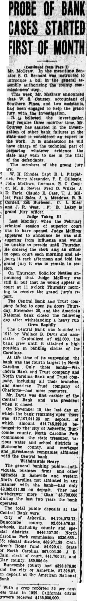 PROBE OF BANK CASES STARTED FIRST OF MONTH (Continued from Page Mr. SenBernard was instructed to introduce the general sembly the county com This week McGraw announced Coursey accountant of Southern Pines, and two had been engaged to help the grand jury with the investigation believed investigation may three Mr Coursey in the investigation bank in the the work. understood will the technical part of preparing whatever evidence the state wish use in the trial the The members of the grand jury Rhodes Capt Fitzpatrick. CoopClaude E. Case, Paul Cordell, Burleson, Kiser and West. Lakey is grand jury III Last Monday when the February was to opened. Judge McElroy appeared announce was sugering from influenza would unable preside Thursday He ordered the and an officer morning and and told the jury was remain in On Thursday Solicitor Nettles McElroy still but that would appear o'clock Thursday morning to receive the grand jury's reCentral Bank and Trust comfailed open doors Thursthe American National closed the following day after withstanding heavy run Rapidly The Central was founded in by Wallace and assoclates Capitalized $25 bank attained high position in banking circles of Carolinas the time of the the largest Carolina Only three chovia company Carolina and Trust including their branches and American Trust of company resources. Mr. was first cashier of the Central and president On the last day on which the open. there was on which amount belonged city Asheville, county North Carolina Park commission. rious and school districts in mortgage and affiliated with the Central Withdrawals The general banking viduals. and other agencies Asheville and western North Carolina not affiliated manner the bank-had only on deposit. had withdrawn than during the last two years the bank The total public deposits at the Central Bank City Buncombe county including county and speNorth Park commission Chilfund. State $67,003.20 clerk and Buncombe county the city deposit at the American National Bank With crop reported 32 per cent than California citrus received