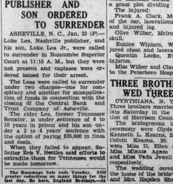 PUBLISHER AND SON ORDERED TO SURRENDER N. Jan. Olive Wilber, Melrose, ASHEVILLE, Luke Lea, Nashville publisher, and his son, Luke Lea Jr., were called chest to surrender in Superior Quentin Locke, Court at but they were injuries. not present and caplases were orto the Peterboro dered issued for their arrest. The Leas called to surrender THREE under for conand another misapplica- WED THREE connection the closing the Central Bank and Trust Saturday in the The elder former of Harrison County. Senator, under of The bridegrooms 10 years prison and his son unceremony Clyde der years' Kenneth Kearns, 23, the option of paying in fines Colvin Kearns, costs. to were Miss D. Ellen When they failed appear, Soefforts Miss Minnie Agnes licitor Zeb Nettles would and Miss Vada Jewell extradite them for Tennessee be made tomorrow. Rummage Tuesday. home of the bride's England Mrs. Hayden