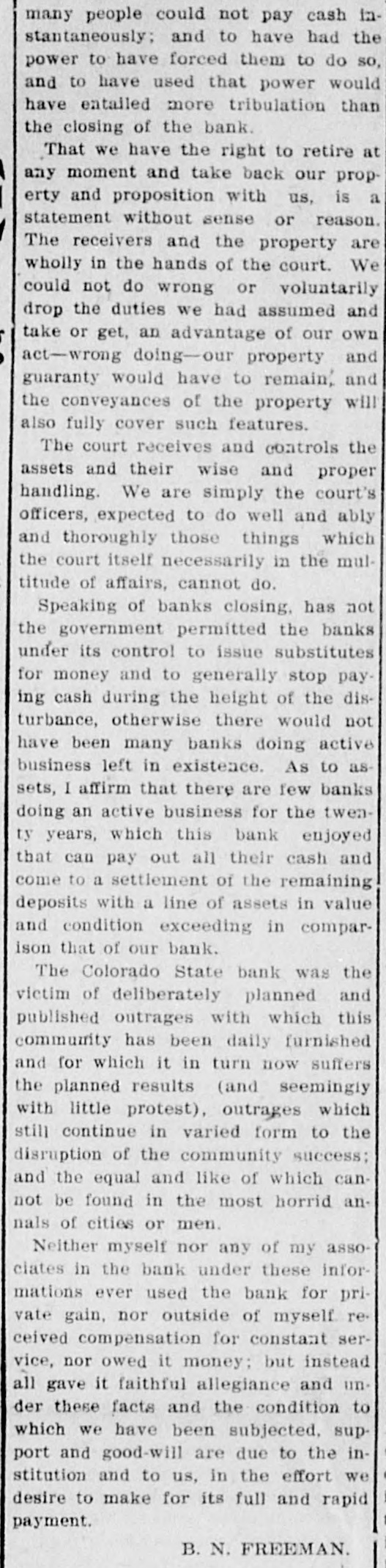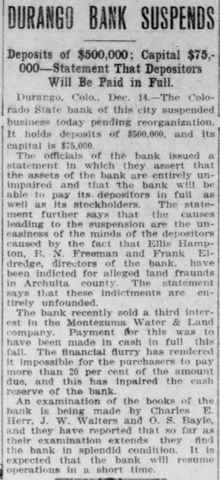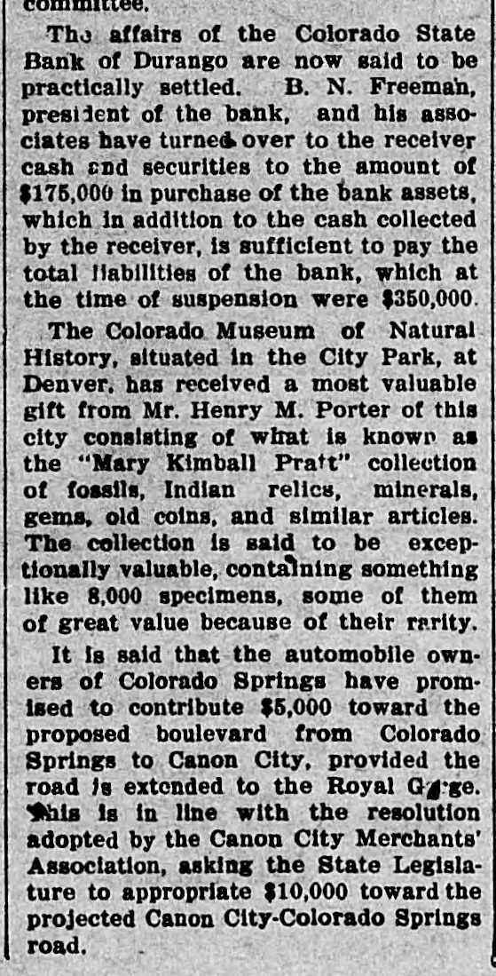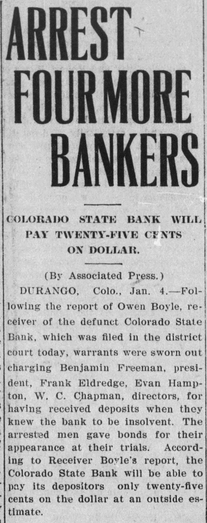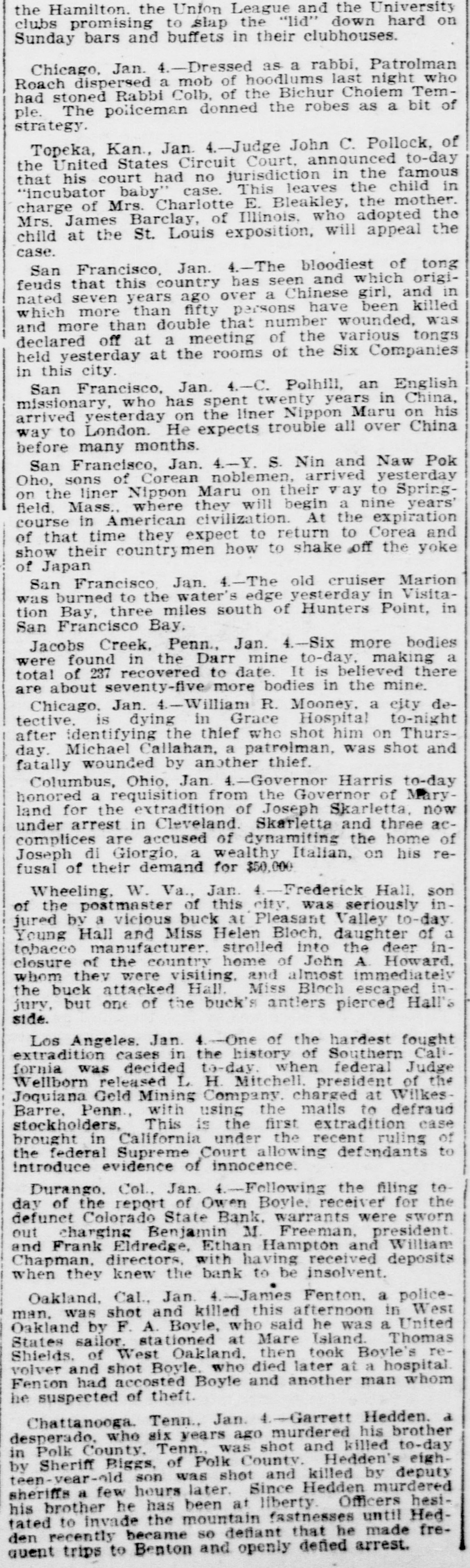 NORTHWEST NOTES Chairman Taggart has appointed John Sunderland of Reno national Democratic committeeman for Nevada to succeed John H. Dennis, deceased. W. F. Dupee, who was shot at Port. land by John Wynne, died shortly after reaching the hospital. A charge of murder will be lodged against Wynne. The First National bank of Saratoga, Wyoming, has been authorized to begin-business with $25,000 capital. I. C. Miller is president and Gustave Jensen cashier. Judge Wolverton, in the federal court at Portland, removed George H. Hill as receiver of the Title Guarantee and Trust company, and appointed K. C. Mears, cashier of the Bankers and Lumbermen's bank, to succeed him. J. Holman Buck, the editor of the Mina. Nevada, Miner, who shot and killed Francis L. Burton at that place, has been released from custody by order of the district attorney, although the coroner's jury failed to exonerate him. A new coal company which hns begun development work on their property in the Rock Springs section of Wyoming, has spent $200,000 in development work the past summer, and reports that nine splendid veins have been uncovered. In the explosion of the engine of a Northern Pacific freight train near Bozeman, Mont., Fireman John Welch was instantly killed and Head Brakeman Veyno seriously injured. Veyno was hurled 100 feet from the engine, and is probably fatally hurt. In the United States court at Carson City, Nevada, Senator Williams and his brother, George B. Williams, indicted for illegally appropriating government land, through their attorney entered a plea of guilty to the five indictments against them. Twenty-three new freight engines, purchased this month by the Salt Lake Route, announcement of which was made by former United States Senator W. A. Clark, president of the line, recently, will be delivered to the company within the next three weeks. Believing that the investigation by the officers of the interior department into the charges of graft against certain officials in connection with the Crow Indian reservation, Montana, was a farce, Judge William H. Hunt of Helena has ordered the federal grand jury to conduct a complete probing of the allegations. The sleeping apartment of Mrs. Jas. A. Wood, wife of the A. Y. P. commissioner general to the Jamestown exposition, was entered at Seattle by burglars, who, after striking Mrs. Wood over the head with a revolver and threatening death if she interfered, robbed her of several valuable pieces of jewelry. The unusual height of the breakers at Santa Cruz, California, resulted in the drowning of John Day of Globe, Arizona, an engineer on the Gila Valley raflroad. He was visiting Santa Cruz, accompanied by his niece, and was fishing from Treasurer pier. The breakers washed him off and he was drowned before help could reach him. Five hundred men, members of the Butte Miners' union, seized a miner at work on the new Bell telephone building as a carpenter and escorted him to their hall. Later the man disappeared. At one time a riot seemed imminent. The Bell company had been boycotted by union labor in Montana because of the strike of linemen and operators, begun last March. The Colorado State bank of Durango, Colo., has suspended business pending reorganization. It holds deposits of $500,000 and its capital is $75,000. The officials of the bank issued a statement in which they assert that the assets of the bank are entirely unimpaired and depositors will be paid in full. Wm. Burner, longshoreman, discovered by his wife on the street in Portland in company of another wowoman, immediately drew a revolver and shot himself. The woman, a Mrs. e*Reign, grasped the revolver from Burner and attempted to shoot herself, but was disarmed by a policeman. The Cherokee-Nevada Copper company has levied an assessment of two cents per share for the purpose of enabling the management to proceed soon after the first of the year with development work. The CherokeeNevada company was formed during the current season, the ground being located in Nevada close to the San Pedro railroad line. Charges on all freight to Goldfield, Nev., must be prepaid by the shipper. Notice to this effect was given by the Salt Lake route to patrons in a circular issued last week. Unsettled financial conditions at Goldfield are, It is explained, the cause of the order. James Brennan, a Buffalo Peak ranchman, who is wanted at Cripple Creek for alleged cattle stealing, fought a running rifle battle with a sheriff's posse near Granite, Colorado,