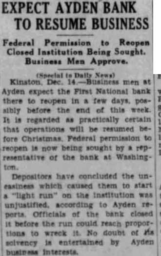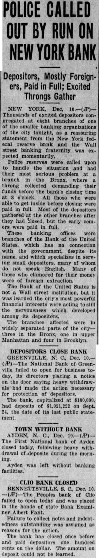 POLICE CALLED OUT BY RUN ON NEW YORK BANK Depositors, Mostly Foreigners, Paid in Full; Excited Throngs Gather NEW YORK, Dec. 10.-(P)Thousands excited depositors congregated at eight branches of one the smaller organizations of the city tonight, reassuring statement from the New York fed. eral reserve bank and the Wall street banking fraternity was expected momentarily. Police called upon to handle and had their most serious problem at branch the Bronx, where throng collected demanding their funds before the bank's closing time at o'clock. those who were able to get inside closing were paid in full. Most of the depositors gathered the other branches after they had closed, but the early comers were paid in full. These banking offices were branches of the Bank the United States, which has no connection with the government, despite its name, and which specializes in serving small depositors, many of whom do not speak English. Many of those who clamored for their money were of foreign extraction The Bank of the United States is not Wall street institution, but was learned the most powerful financial interests acting the nervousness which developed among its depositors, The branches affected were in widely separated parts of the citythree in the Bronx, one in upper Manhattan and four in Brooklyn. DEPOSITORS CLOSE BANK GREENVILLE, C., Dec. National of Greenville failed open for today, its placing a notice on the door saying heavy withdrawmade the action necessary for of depositors. bank, capitalized at $100,000, had deposits of $1,021,222 on Sept. 24, the date of its last public statement. TOWN WITHOUT BANK AYDEN, N. C., Dec. The First National bank of Ayden closed today, following heavy withdrawal of deposits during the morning. Ayden was left without banking facilities. CLIO BANK CLOSED Dec. 10. Peoples bank of Clio failed to open today and was placed in the hands of state Bank Examiner Albert Fant. Failure to collect notes and indebtedness assigned as reasons for the action. The bank has closed once before and paid one hundred cents on dollar. The amount on deposit could not be learned.