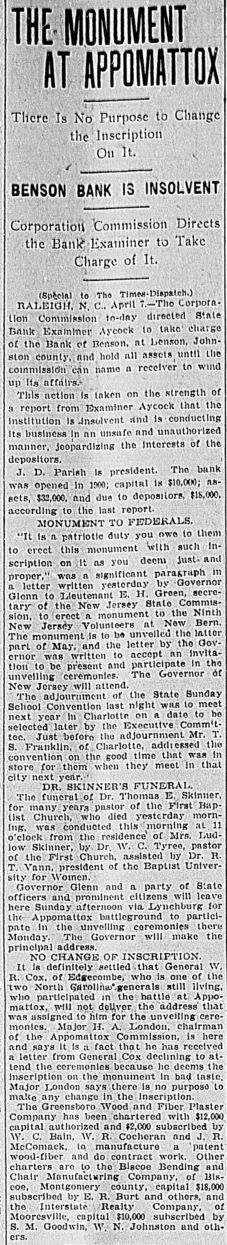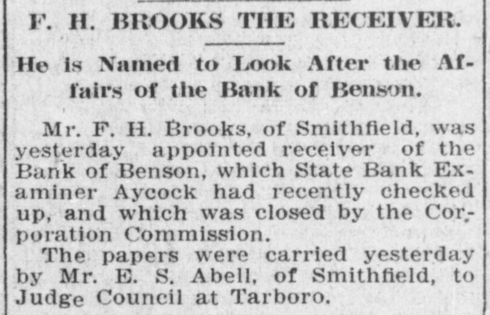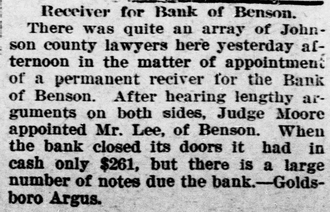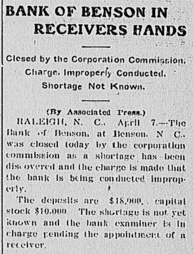 ROYAL BAKING POWDER ABSOLUTELY PURE MERCHANTS' TAX BENSON BANK FAILS County Commissioners InShortage the Cause, But the Amount Has Not sist Upon the Enforcement of This Law. Been Disclosed. The Bank of Benson has failed. and The Board of County Commissionits doors were closed yesterday by ers held their last meeting of this month, unless there is a called meetorder of the Corporation Commission. ing yesterday afternoon. The most The amount of the shortage has not important action of the day with them been disclosed, but it was of such sum was the act adopted compelling the that might have been made up, and merchants to pay the "merchants tax" the commission gave the officials a fair chance to do this. allowing them thirty for 1904. The clerk presented an abstract from Schedule B., taxes for days to supply the deficiency. The 1904, which was accepted, and turned bank failed to do this, and the comover to the sheriff for collection. The mission yesterday ordered its doors merchants have not as yet listed their closed, and Mr. Jno. W. Aycock, State gross sales for 1904, and the board Bank Examiner, was appointed teminsists that the merchants must comporary receiver. ply with the law. The section known The following statement was made as the merchants tax, in the old reveby Mr. H. C. Brown, Clerk of the Commission: nue act was omitted in that of 1905. that tax being abolished by the Legis"It appearing to the Corporation Commission that the bank of Benson lature. But this does not prevent the collection of the tax on merchants for was insolvent, and was conducting its business in an unsafe and unauthor1904, under the old law, and the county is after the money. ized manner, and was jeopardizing the Each merchant under the act shall interests of its depositors, Jno. W. Aycock, bank examiner, was authorized pay annually on the whole volume of to take charge of the assets of the gross sales, according to the following schedule: bank, and hold the same until a reOn $50,000 or less, forty cents on ceiver could be appointed according to law. each thousand: on the excess over $50,000 to $75,000, thirty cents, on "Upon a report made by the former each thousand on the excess over bank examiner, Mr. Jno. O. Ellington, $75,000 to $125,000, twenty-five cents the commission gave the bank thirty on each thousand: on the excess over days, in accordance with law. to put its matters in better shape. Upon the $125,000, twenty cents on each thousand. examination by Mr. Jno. W. Aycock Mr. H, G. Holding. superintendentit appeared that the bank was not yet elect of Wake county roads, presented in proper condition, and so it was a binder from the United States Fidelordered closed. "The assets and liabilities of the ity and Guaranty Company, for $2,000. signed by W. B. Jones, general agent. bank at the last examination were The binder is to be replaced by a bond $28,000, the deposits were $18,000, and from that company. The binder was the capital stock was $10,000. The accepted. shortage of the bank, and the amount The chairman and clerk of the of bad paper, have not yet been disclosed. board were appointed a special committee to examine the plumbing in the "J. D. Parrish, of Benson, is presibasement of the court house, ascertain dent of the bank: J. F. Lee is cashier what repairs are necessary and have pro tem; and A. Parrish is assistant the work done. cashier.
