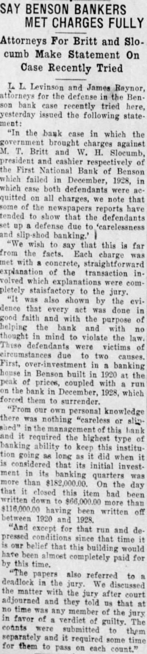 SAY BENSON BANKERS MET CHARGES FULLY Attorneys For Britt and Slocumb Make Statement On Case Recently Tried L L Levinson and James Raynor, attorneys for the defense in the Benson bank case recently tried here, yesterday issued the following statement: "In the bank case in which the brought against M. T. Britt and W. H. Slocumb, president and cashier respectively of the First National Bank of Benson which failed in December, 1928, in which case both defendants were acquitted on all charges, we note that some of the newspapers reports have tended to show that the defendants set up a defense due to 'carelessness and slip-shod banking.' "We wish to say that this is far from the facts. Each charge was met with concrete, straightforward explanation of the transaction involved which explanations were completely staisfactory to the jury. "It was also shown by the evidence that every act was done in good faith and with the purpose of helping the bank and with no thought in mind to violate the law. These defendants were victims of eircumstances due to two causes. First, over-investment in banking house in Benson built in 1920 at the peak of prices, coupled with run on the bank in December, 1928, which forced them to surrender. "From our own personal knowledge there was nothing "careless or slin. shed" in the management of this bank and it required the highest type of banking ability to keep this institution going as long as it did when it is considered that its initial investment in its banking quarters was more than $182,000.00. On the day that it closed this item had been written down to $66,000.00 more than $116,000.00 having been written off between 1920 and 1928. "And except for that run and depressed conditions since that time it our belief that this building would have been almost completely paid for by this time. "The papers also referred to deadlock in the jury. We discussed the matter with the jury after court adjourned and they told us that at no time was any member of the jury in favor of verdict of guilty. The counts were submitted to them separately and it required some time for them to pass on each count."
