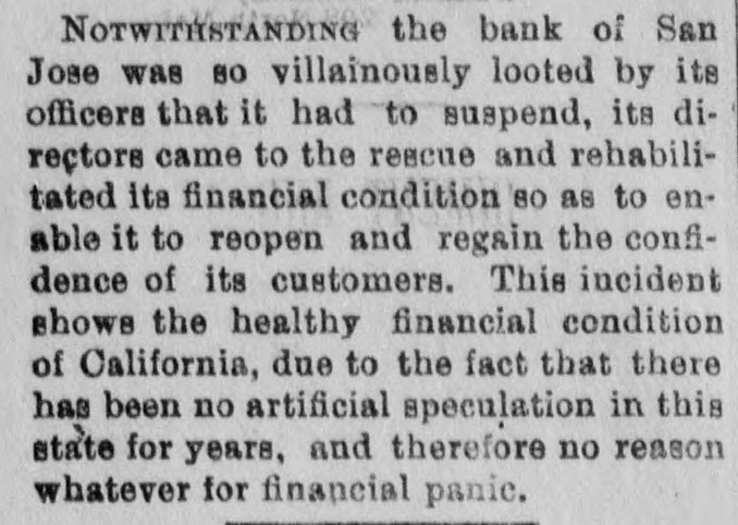 NOTWITHSTANDING the bank of San Jose was 80 villainously looted by its officers that it had to suspend, its directors came to the rescue and rehabilitated its financial condition 80 as to enable it to reopen and regain the confidence of its customers. This incident shows the healthy financial condition of California, due to the fact that there has been no artificial speculation in this state for years, and therefore no reason whatever for financial panic.