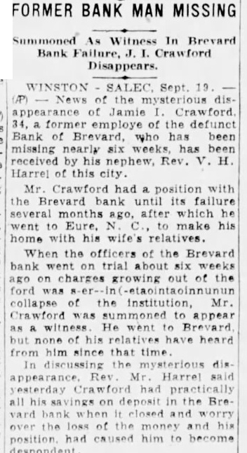 FORMER BANK MAN MISSING Summoned As Witness In Brevard Bank Failure, Crawford Disappears. WINSTON SALEC, Sept. 19. (AP) of the mysterious disappearance of Jamie Crawford former employe of the defunct Bank of Brevard, who has been missing nearly six weeks. has been received by his nephew, Rev. v. H. of this Mr. Crawford had a position with the Brevard bank until its failure several months ago, after which he went to Eure. make his home with his wife's relatives. When the officers of the Brevard bank went on trial about six weeks ago on charges growing out of the ford was collapse of the institution, Mr. Crawford was summoned to appear as witness He to Brevard but relatives have heard from him since that time discussing the mysterious Harrel had his savings on deposit in the Breclosed and worry the the money and his position caused him to become