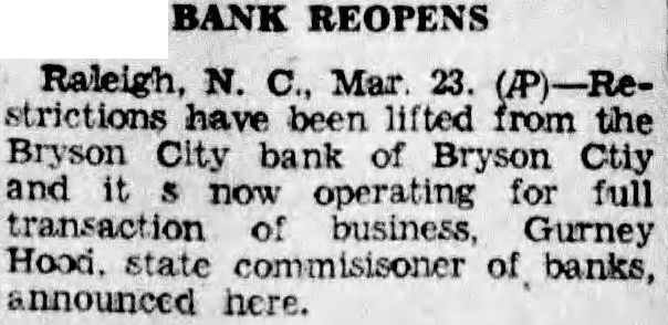 Restrictions were imposed on the Bryson bank by the banking commissioner (later lifted).