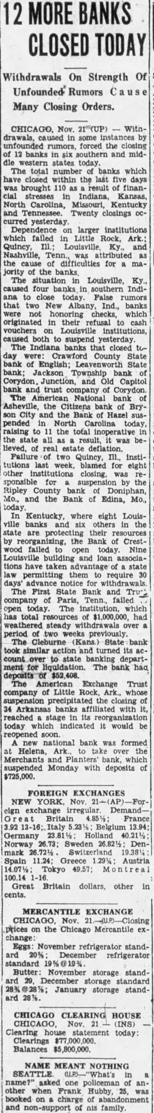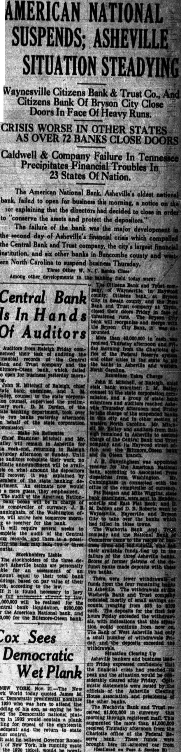 (Continued from Page Charlotte Thousands dolwere distributed banks throughout this section aid them against threatened run Pay The of the American tional open this did marked of the Trust and bank yesterday morning. There were several acore of peoin front of the but compare the crowd that day. The withstood heavy the officials had would able to open this morn- few minutes before o'clock tothe following was on the door and later on the windows facing Church street: "The the National bank have closed, and the hands of the for the and the protection of "The hopeful that the bank will be reorganized and reopened its depositors paid Failure Chief Cause ville chief the of the and the Caldwell and investment banking of Tenn Caldwell company extensively 23 states, cluding North Caldwell and went into in federal ago. known that Trust here was and pany failure of Caldwell and widespread and Kentucky and states. In the more 72 banks Illinois North are the failures cities The failures in Tennessee and Kentucky is growing daily.