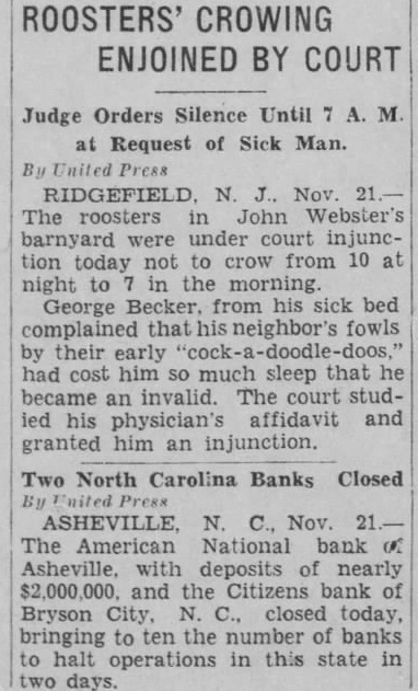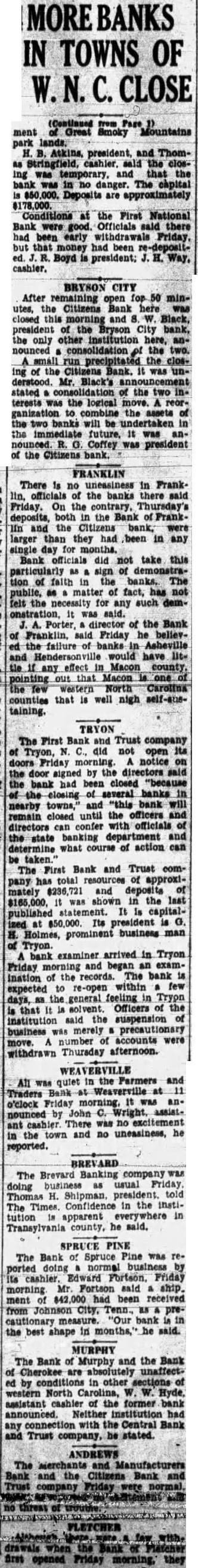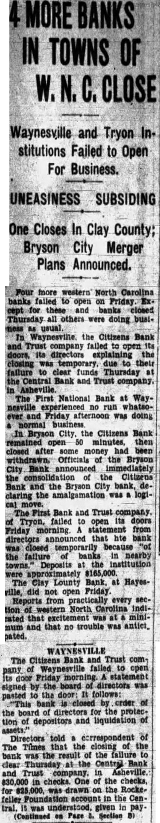 Closed Banks Listed The following banks Asheville western North CareCentral Bank and Trust Asheville, fourth deposit liability, sources, undivided profits, President Wallace Davis. First Bank and Trust and East Flat Mack American Bank and Henresources, 000; undivided profits, Noah station, sources, $25,000; President, ty: Deposit surplus, President Davis Clay County Deundivided $2,439; presChambers. Citizens National Bank. HenderDeposit liability, capital and plete financial statement given in Citizens bank, Bryson City: statement not available. Citizens Bank and Trues company, statement not First Bank and Trust company, at Tryon: Holmes. Deposits of the State of North Central $26,857 Naand 179 First Bank and were protected depository or state announced. Old Mounthis reported in President of the Bank with his bank had closed only temporarily Simultaneous with the bank the Morris Plan Asheville announced had the Asheville Industrial Bank and the Industrial to have $500,000 in