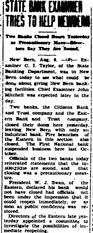 Bern. Aug. the State Banking New today to could about giving facilities. Chief Examiner John Mitchell was expected later in the the Citizens Bank Trust company and the EastBank and Trust company. closed their doors here yesterday. leaving Bern only Industrial Five branches this section also First National bank suspended business here last OcOfficials of the two banks today reiterated that the and that measPresident Swan. of the declared his bank would closed had officials not been under the impression that reopen immediately. public confidence was Directors of the Eastern late yesthe possibilities of reopening.