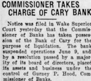 COMMISSIONER TAKES CHARGE OF CARY BANK Notice was filed in Wake Superior Court yesterday that the Commissioner of Banks has taken possession of the Bank of Cary for the purpose of liquidation. The bank suspended operations June 9, and, by resolution passed by majority of its board of directors, placed its assets and business under the control of Gurney P. Hood, Commissioner of Banks.