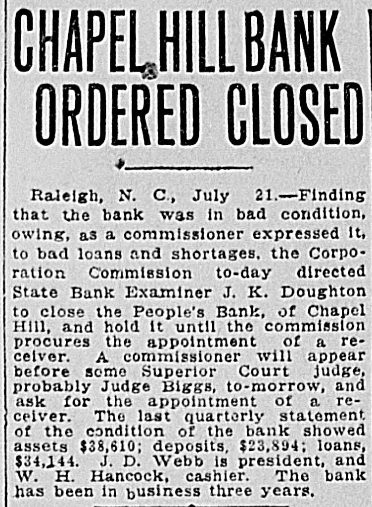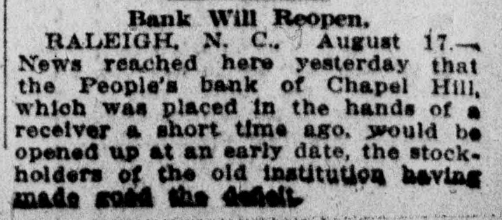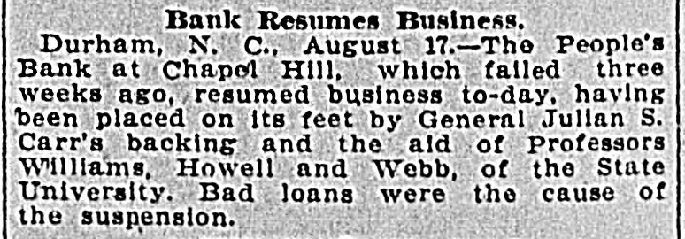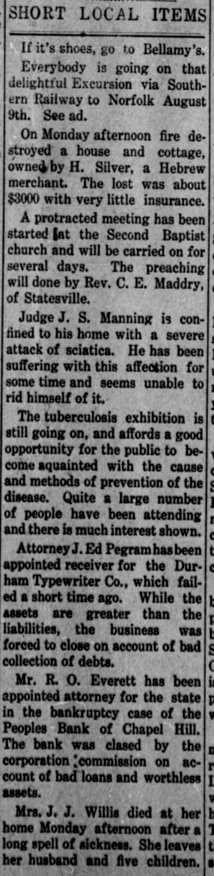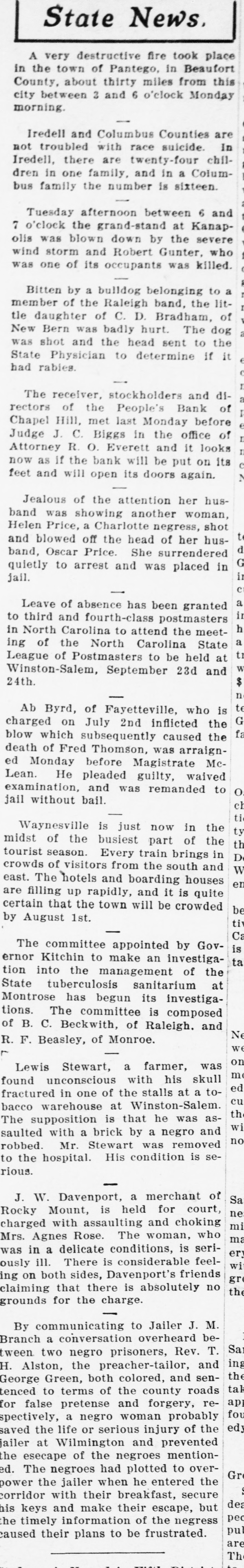 State News. A very destructive fire took place in the town of Pantego, in Beaufort County, about thirty miles from this city between 3 and 6 o'clock Monday morning. Iredell and Columbus Counties are not troubled with race suicide. In Iredell, there are twenty-four children in one family, and in a Columbus family the number is sixteen. Tuesday afternoon between 6 and 7 o'clock the grand-stand at Kanapolis was blown down by the severe wind storm and Robert Gunter, who was one of its occupants was killed. Bitten by a bulldog belonging to a member of the Raleigh band, the little daughter of C. D. Bradham, of New Bern was badly hurt. The dog was shot and the head sent to the State Physician to determine if it e had rables. o Il The receiver, stockholders and dia rectors of the People's Bank of I Chapel Hill, met last Monday before e Judge J. C. Biggs in the office of Il Attorney R. O. Everett and it looks Il now as if the bank will be put on its c feet and will open its doors again. N Jealous of the attention her husband was showing another woman, Helen Price, a Charlotte negress, shot t and blowed off the head of her husd band, Oscar Price. She surrendered G quietly to arrest and was placed in in jail. c a Leave of absence has been granted in to third and fourth-class postmasters h in North Carolina to attend the meeta of the North Carolina State ti League of Postmasters to be held at W Winston-Salem, September 23d and 24th. $ n te Ab Byrd, of Fayetteville, who is charged on July 2nd inflicted the G fa low which subsequently caused the leath of Fred Thomson, was arraignMonday before Magistrate McLean. He pleaded guilty, waived examination, and was remanded to O ail without bail. ch ti Waynesville is just now in the ty nidst of the busiest part of the th ourist season. Every train brings in D rowds of visitors from the south and W The hotels and boarding houses en filling up rapidly, and it is quite ertain that the town will be crowded be August 1st. ti Ca The committee appointed by Govis rnor Kitchin to make an investigata into the management of the tate tuberculosis sanitarium at Iontrose has begun its investigaThe committee is composed B. C. Beckwith, of Raleigh. and Ne F. Beasley, of Monroe. we on Lewis Stewart, a farmer, was m unconscious with his skull ed ractured in one of the stalls at a tocu acco warehouse at Winston-Salem. th he supposition is that he was aswi aulted with a brick by a negro and no obbed. Mr. Stewart was removed the hospital. His condition is seious. J. W. Davenport, a merchant of Sa ne tocky Mount, is held for court, mi harged with assaulting and choking ma Agnes Rose. The woman, who in a delicate conditions, is seriery wi usly ill. There is considerable feelon both sides, Davenport's friends gr laiming that there is absolutely no the rounds for the charge. I By communicating to Jailer J. M. ranch a conversation overheard beSa veen two negro prisoners, Rev. T. ing Alston, the preacher-tailor, and the eorge Green, both colored, and sentak enced to terms of the county roads app false pretense and forgery, refou ectively, a negro woman probably edy the life or serious injury of the iler at Wilmington and prevented esecape of the negroes mentionThe negroes had plotted to overGre