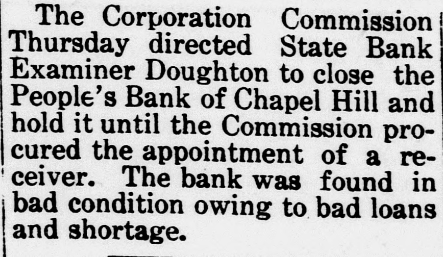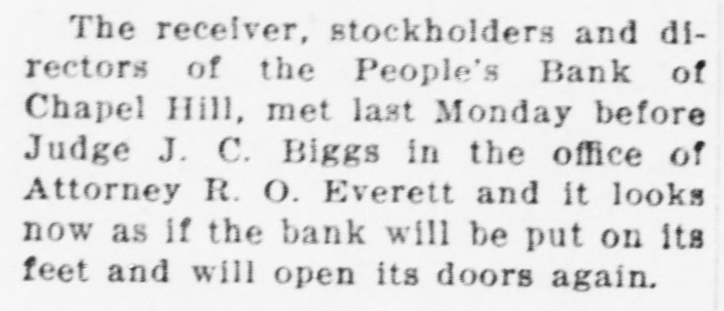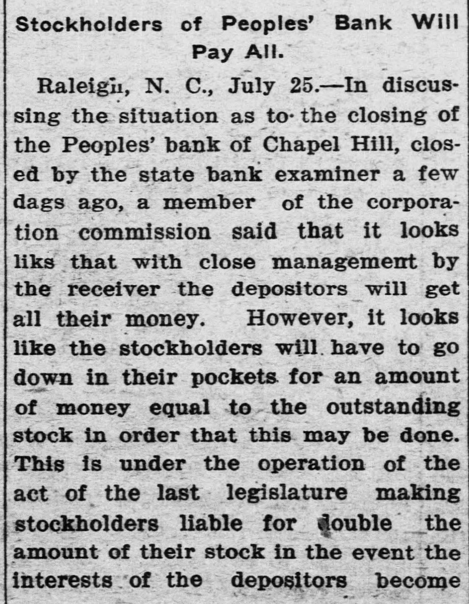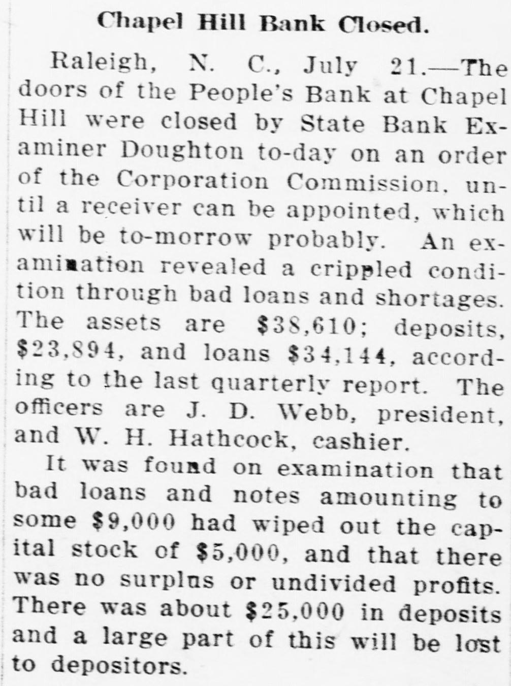State News. A very destructive fire took place in the town of Pantego, in Beaufort County, about thirty miles from this city between 3 and 6 o'clock Monday morning. Iredell and Columbus Counties are not troubled with race suicide. In Iredell, there are twenty-four children in one family, and in a Columbus family the number is sixteen. Tuesday afternoon between 6 and 7 o'clock the grand-stand at Kanapolis was blown down by the severe wind storm and Robert Gunter, who was one of its occupants was killed. Bitten by a bulldog belonging to a member of the Raleigh band, the little daughter of C. D. Bradham, of New Bern was badly hurt. The dog was shot and the head sent to the State Physician to determine if it e had rables. o Il The receiver, stockholders and dia rectors of the People's Bank of I Chapel Hill, met last Monday before e Judge J. C. Biggs in the office of Il Attorney R. O. Everett and it looks Il now as if the bank will be put on its c feet and will open its doors again. N Jealous of the attention her husband was showing another woman, Helen Price, a Charlotte negress, shot t and blowed off the head of her husd band, Oscar Price. She surrendered G quietly to arrest and was placed in in jail. c a Leave of absence has been granted in to third and fourth-class postmasters h in North Carolina to attend the meeta of the North Carolina State ti League of Postmasters to be held at W Winston-Salem, September 23d and 24th. $ n te Ab Byrd, of Fayetteville, who is charged on July 2nd inflicted the G fa low which subsequently caused the leath of Fred Thomson, was arraignMonday before Magistrate McLean. He pleaded guilty, waived examination, and was remanded to O ail without bail. ch ti Waynesville is just now in the ty nidst of the busiest part of the th ourist season. Every train brings in D rowds of visitors from the south and W The hotels and boarding houses en filling up rapidly, and it is quite ertain that the town will be crowded be August 1st. ti Ca The committee appointed by Govis rnor Kitchin to make an investigata into the management of the tate tuberculosis sanitarium at Iontrose has begun its investigaThe committee is composed B. C. Beckwith, of Raleigh. and Ne F. Beasley, of Monroe. we on Lewis Stewart, a farmer, was m unconscious with his skull ed ractured in one of the stalls at a tocu acco warehouse at Winston-Salem. th he supposition is that he was aswi aulted with a brick by a negro and no obbed. Mr. Stewart was removed the hospital. His condition is seious. J. W. Davenport, a merchant of Sa ne tocky Mount, is held for court, mi harged with assaulting and choking ma Agnes Rose. The woman, who in a delicate conditions, is seriery wi usly ill. There is considerable feelon both sides, Davenport's friends gr laiming that there is absolutely no the rounds for the charge. I By communicating to Jailer J. M. ranch a conversation overheard beSa veen two negro prisoners, Rev. T. ing Alston, the preacher-tailor, and the eorge Green, both colored, and sentak enced to terms of the county roads app false pretense and forgery, refou ectively, a negro woman probably edy the life or serious injury of the iler at Wilmington and prevented esecape of the negroes mentionThe negroes had plotted to overGre