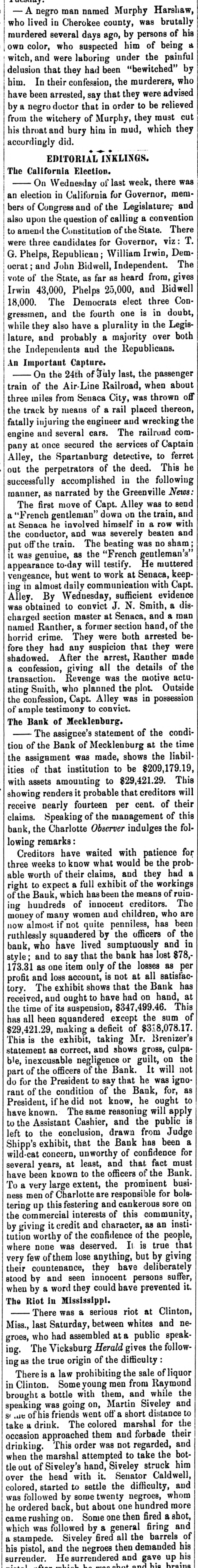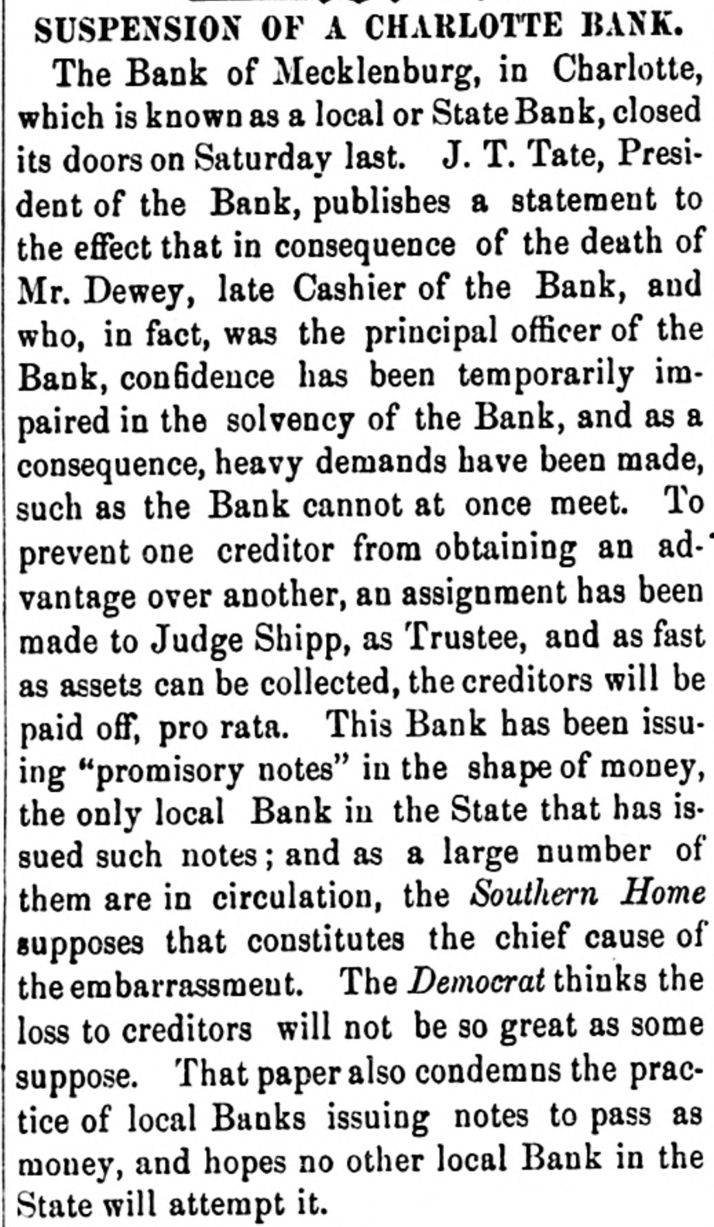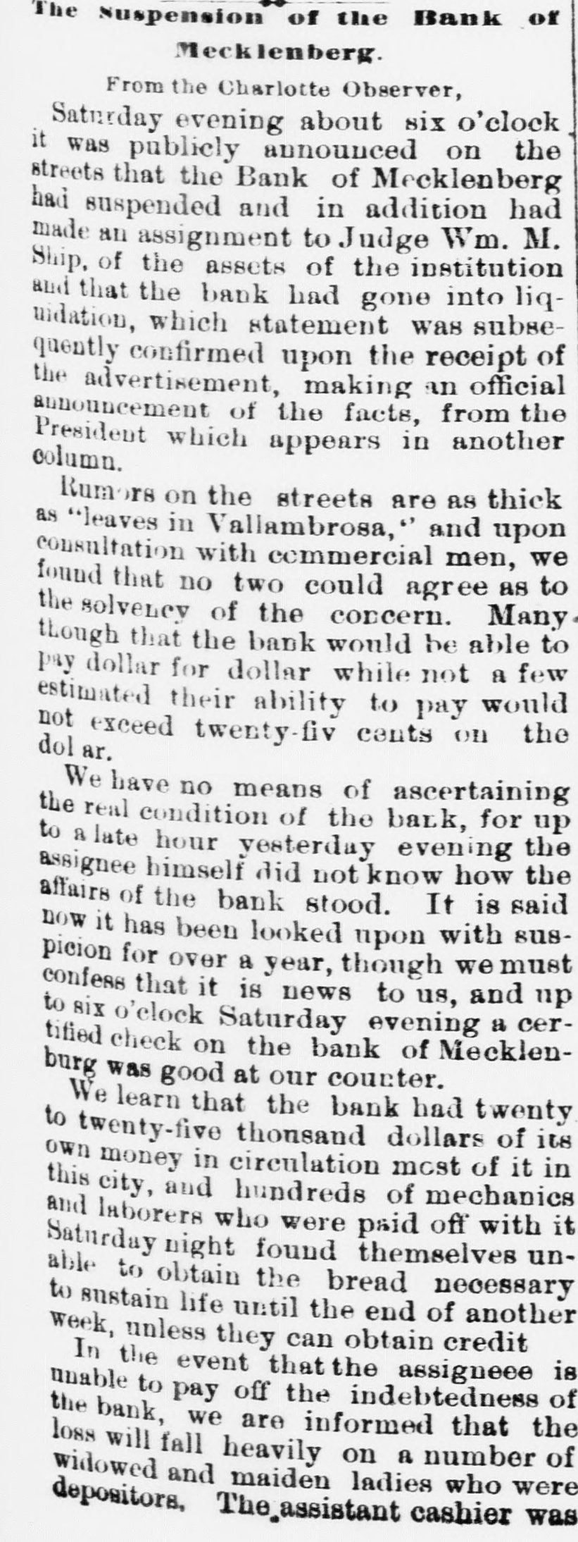 Creditors have waited with patience for three weeks to know what would be the probable worth of their claims, and they had a right to expect a full exhibit of the workings of the Bauk, which has been the means of ruining hundreds of innocent creditors. The money of many women and children, who are now almost if not quite penniless, has been ruthlessly squandered by the officers of the bank, who have lived sumptuously and in style; and to say that the bank has lost $78,173.31 as one item only of the losses as per profit and loss account, is not at all satisfactory. The exhibit shows that the Bank has received, and ought to have had on hand, at the time of its suspension, $347,499.46. This has all been squandered except the sum of $29,421.29, making a deficit of $318,078.17. This is the exhibit, taking Mr. Brenizer's statement as correct, and shows gross, culpable, inexcusable negligence or guilt, on the part of the officers of the Bank. It will not do for the President to say that he was ignorant of the condition of the Bank, for, as President, if he did not know, he ought to have known. The same reasoning will apply to the Assistant Cashier, and the public is left to the conclusion, drawn from Judge Shipp's exhibit, that the Bank has been a wild-cat concern, unworthy of confidence for several years, at least, and that fact must have been known to the officers of the Bank. To a very large extent, the prominent business men of Charlotte are responsible for bolstering up this festering and cankerous sore on the commercial interests of this community, by giving it credit and character, as an institution worthy of the confidence of the people, where none was deserved. It is true that very few of them lose anything, but by giving their countenance, they have deliberately stood by and seen innocent persons suffer, when by a word they could have prevented it.