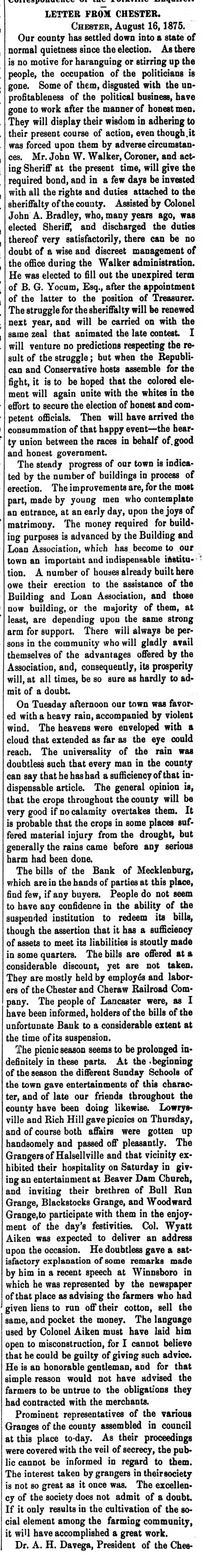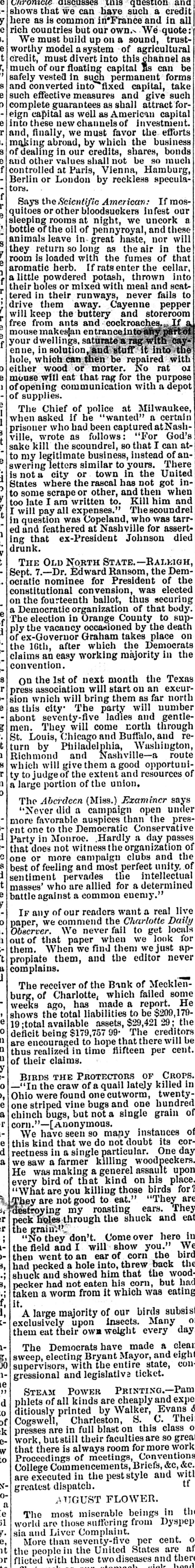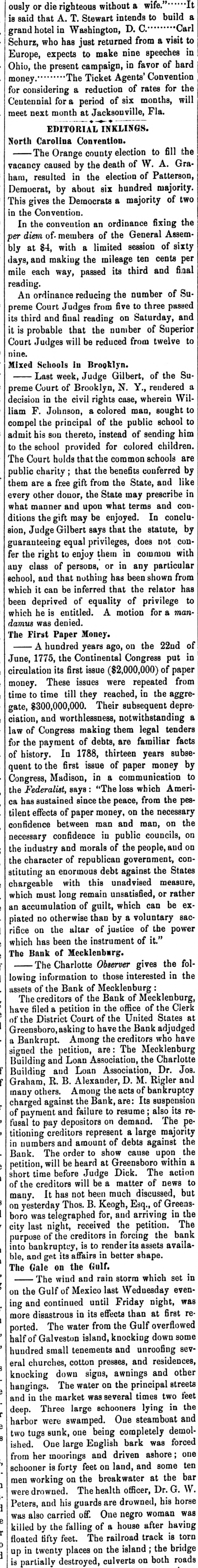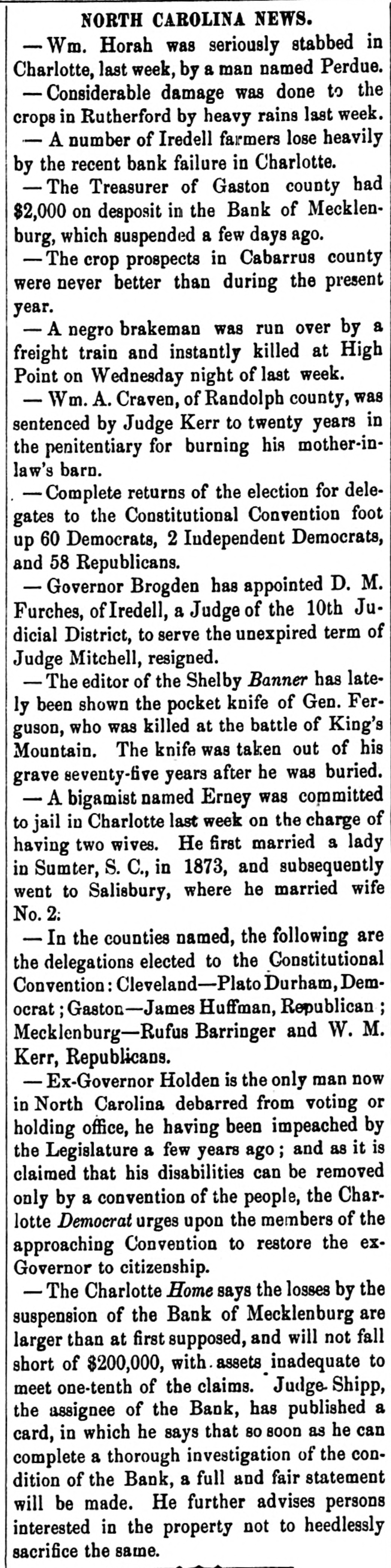 Creditors have waited with patience for three weeks to know what would be the probable worth of their claims, and they had a right to expect a full exhibit of the workings of the Bauk, which has been the means of ruining hundreds of innocent creditors. The money of many women and children, who are now almost if not quite penniless, has been ruthlessly squandered by the officers of the bank, who have lived sumptuously and in style; and to say that the bank has lost $78,173.31 as one item only of the losses as per profit and loss account, is not at all satisfactory. The exhibit shows that the Bank has received, and ought to have had on hand, at the time of its suspension, $347,499.46. This has all been squandered except the sum of $29,421.29, making a deficit of $318,078.17. This is the exhibit, taking Mr. Brenizer's statement as correct, and shows gross, culpable, inexcusable negligence or guilt, on the part of the officers of the Bank. It will not do for the President to say that he was ignorant of the condition of the Bank, for, as President, if he did not know, he ought to have known. The same reasoning will apply to the Assistant Cashier, and the public is left to the conclusion, drawn from Judge Shipp's exhibit, that the Bank has been a wild-cat concern, unworthy of confidence for several years, at least, and that fact must have been known to the officers of the Bank. To a very large extent, the prominent business men of Charlotte are responsible for bolstering up this festering and cankerous sore on the commercial interests of this community, by giving it credit and character, as an institution worthy of the confidence of the people, where none was deserved. It is true that very few of them lose anything, but by giving their countenance, they have deliberately stood by and seen innocent persons suffer, when by a word they could have prevented it.