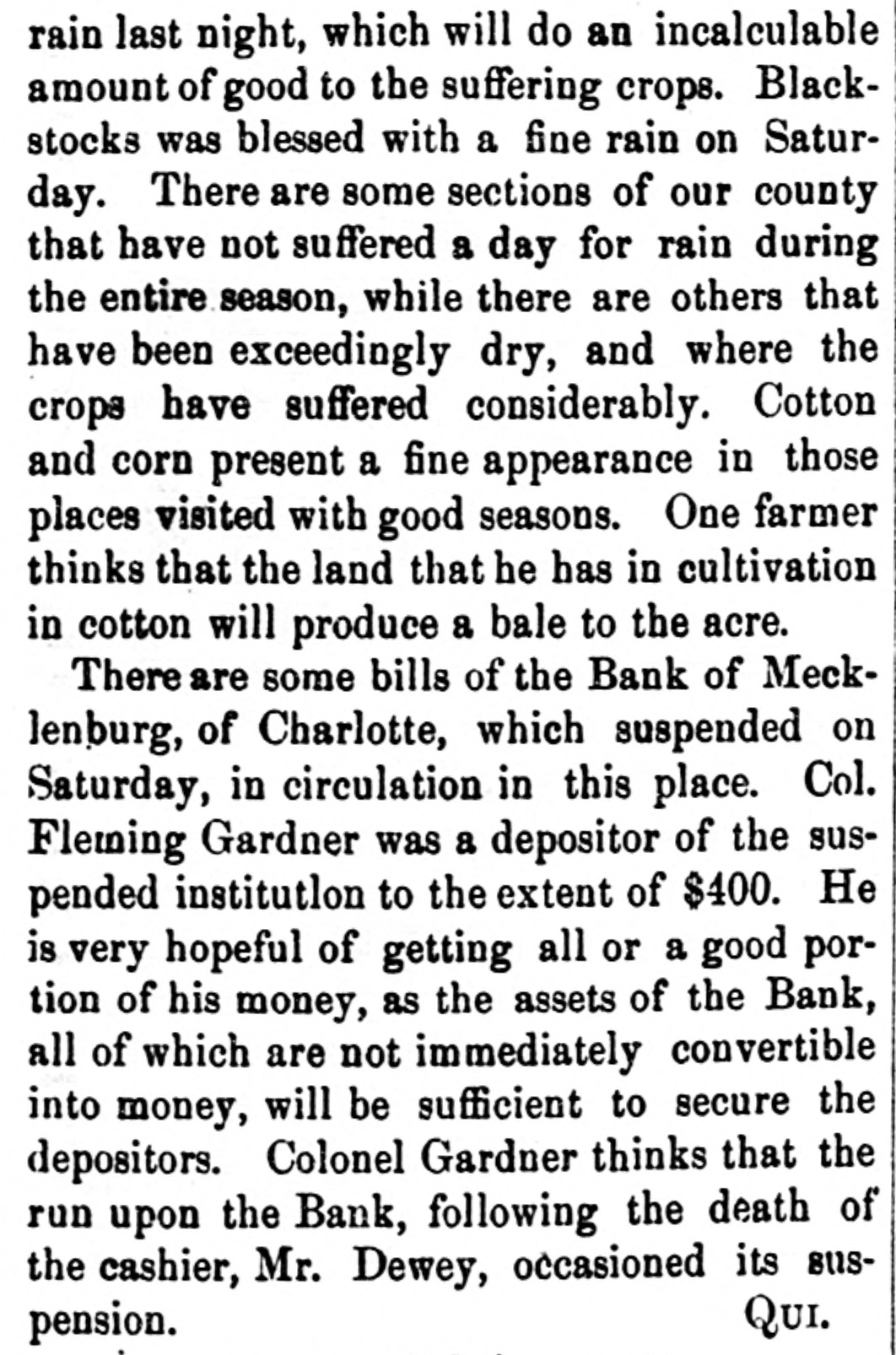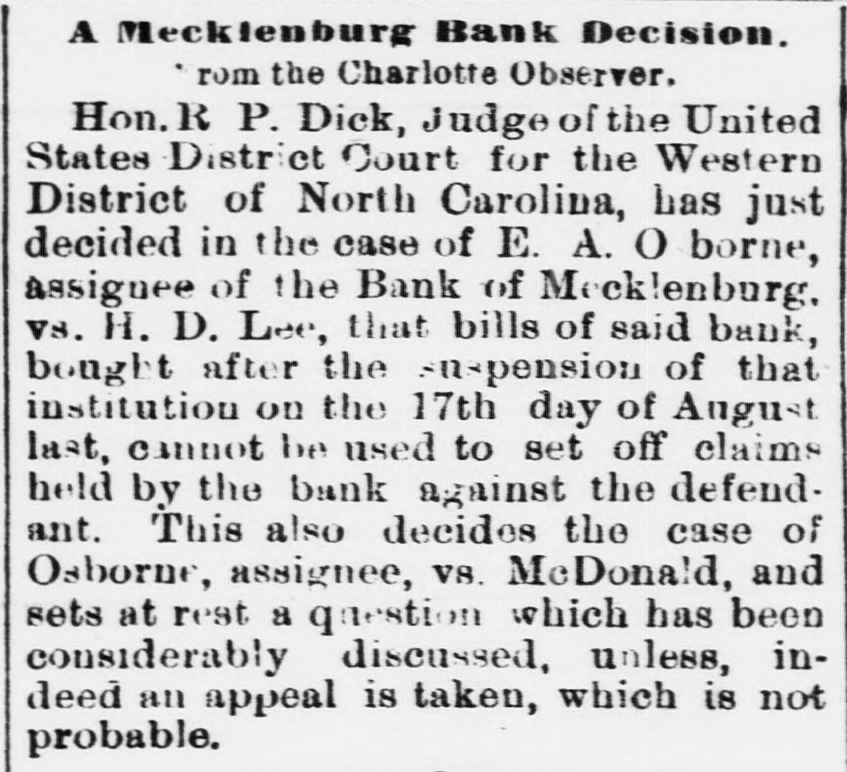 The assignee's statement of the condition of the Bank of Mecklenburg at the time the assignment was made, shows the liabilities of that institution to be $209,179.19, with assets amounting to $29,421.29. This showing renders it probable that creditors will receive nearly fourteen per cent. of their claims. Speaking of the management of this bank, the Charlotte Observer indulges the following remarks:
