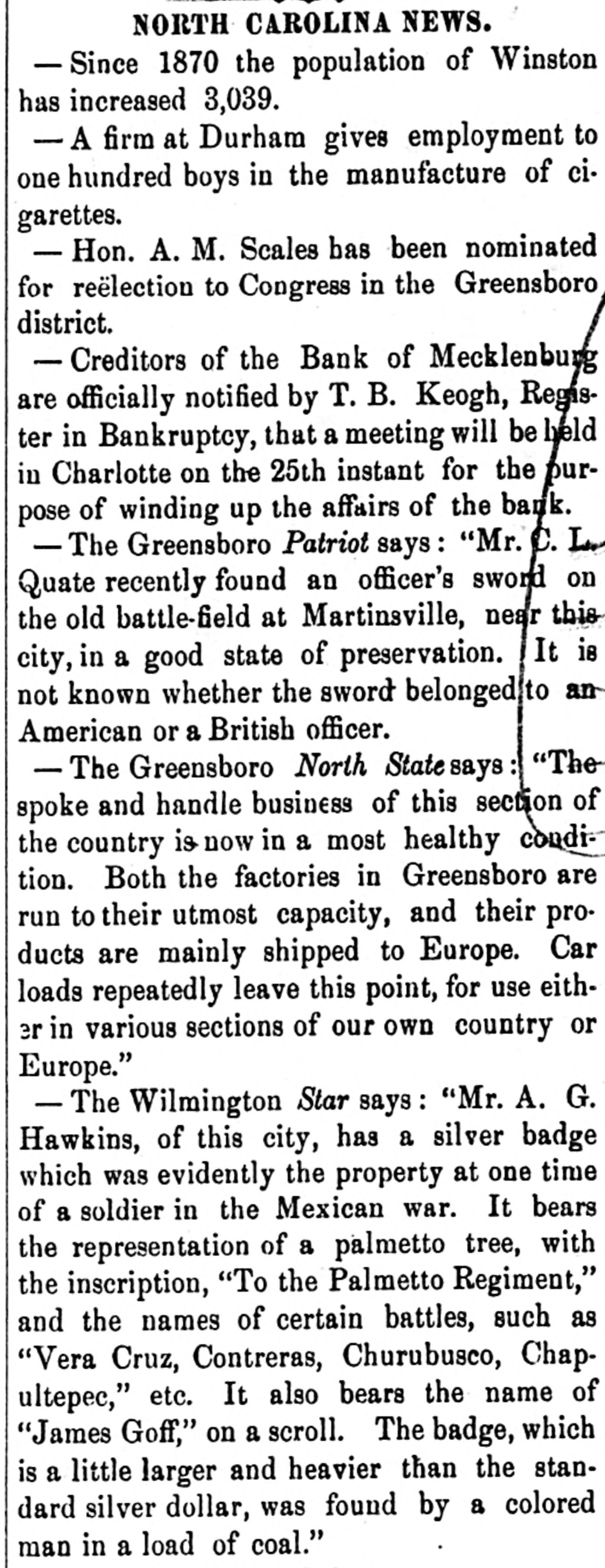 NORTH CAROLINA NEWS. - Since 1870 the population of Winston has increased 3,039. - A firm at Durham gives employment to one hundred boys in the manufacture of cigarettes. - Hon. A. M. Scales has been nominated for reëlection to Congress in the Greensboro district. - Creditors of the Bank of Mecklenburg are officially notified by T. B. Keogh, Register in Bankruptcy, that a meeting will be held in Charlotte on the 25th instant for the purpose of winding up the affairs of the bank. - The Greensboro Patriot says: "Mr. C. L. Quate recently found an officer's sword on the old battle-field at Martinsville, near this city, in a good state of preservation. It is not known whether the sword belongedito an American or a British officer. - The Greensboro North State says "The spoke and handle business of this section of the country is now in a most healthy condition. Both the factories in Greensboro are run to their utmost capacity, and their products are mainly shipped to Europe. Car loads repeatedly leave this point, for use either in various sections of our own country or Europe." - The Wilmington Star says : "Mr. A. G. Hawkins, of this city, has a silver badge which was evidently the property at one time of a soldier in the Mexican war. It bears the representation of a palmetto tree, with the inscription, "To the Palmetto Regiment," and the names of certain battles, such as "Vera Cruz, Contreras, Churubusco, Chapultepec," etc. It also bears the name of "James Goff," on a scroll. The badge, which is a little larger and heavier than the standard silver dollar, was found by a colored man in a load of coal."