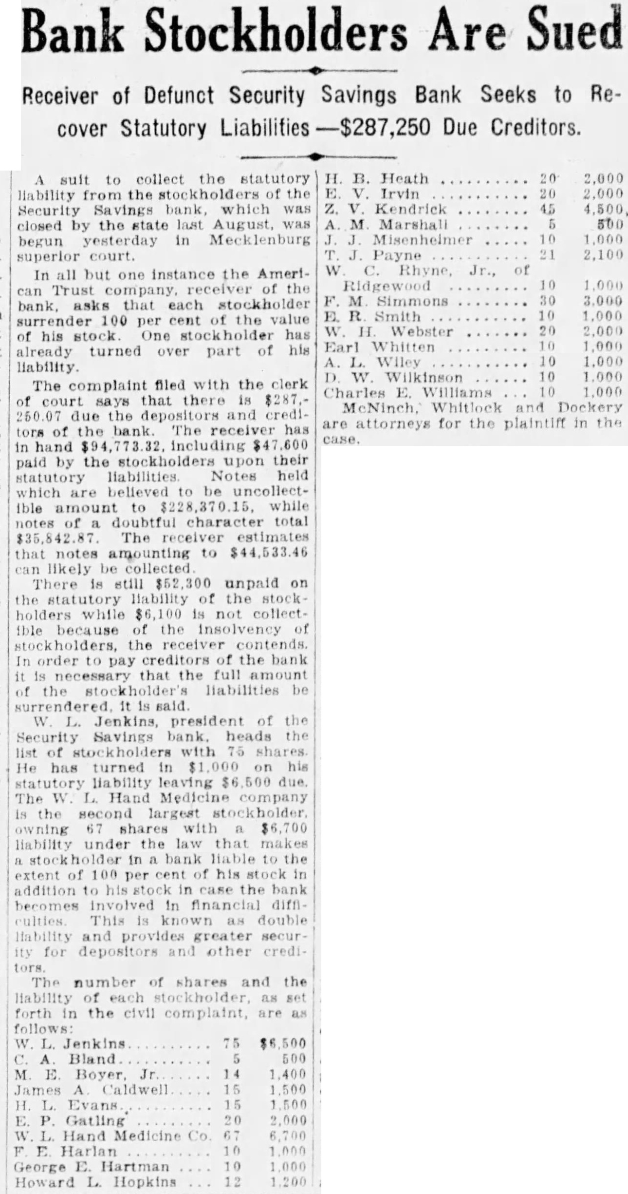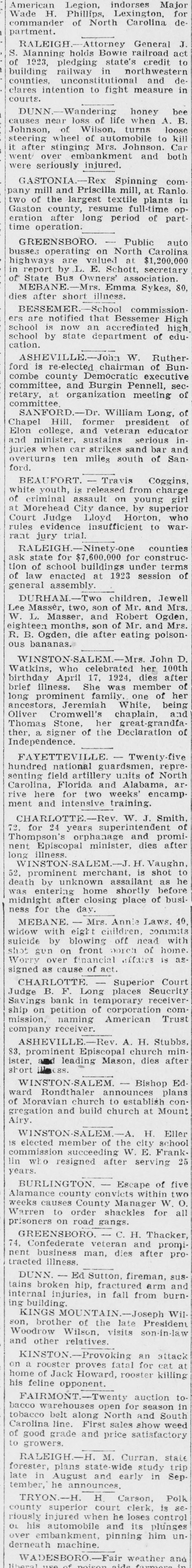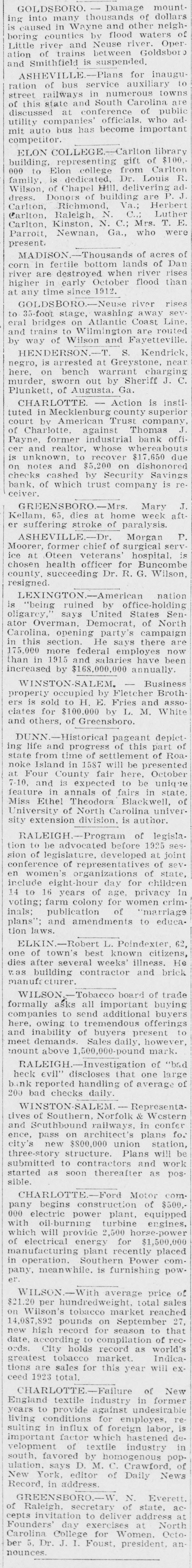 RALEIGH.-As result of tremendous increase in activity of boll weevil in recent weeks, state's cotton crop has been reduced about 50,000 bales, with prospect now being for crop of 780,000 bales, according to Frank Parker, state federal agricultural statistician. CHARLOTTE.-Claude E. Hobbs, Jr., eleven, son of Mr. and Mrs. C. E. Dobbs, is dangerously wounded in stomach by discharge of small rifle with which Badger Hobbs, eight, brother, was playing. After operation at hospital, surgeor S say child's condition is grave. CHARLOTTE. American Trust company. of Charlotte, receiver, formally advises stockholders in defunct Security Safety bank, of Charlotte, that they will lose all stock holdings and additional equal amount while depositors will su'fer heavy losses. Investigation discloses affairs of defunct bank. of which W. L. Jenkins was president, are in badly involved condition. SALISBURY.-C. P. Barringer, state chairman of independent party, is advised by state board of elections, that names of La Follette and Wheeler, independent presidential and vice presidential candidates can not be printed on official state ballot. Barringer says independents will print own ballots, which will be distributed to all precinets, as he is authorized to do. CHARLOTTE.-Doubt over legal right of this state to demand return of Dr. J. W. Peacock, fugitive from state prison criminally insane ward, held at El Cajon, Cal., is expressed by Attorney General Manning, here on legal business, who says he has been unable to find legal authority requested by California. CONCORD.-Fire originating in projecting room, destroys Piedmont theater and three adjoining stores suffer heavy losses, total losses be. ing estimated at $100,000. RALEIGH-State adjutant genoral's department announces approval of group insurance policy for $7,500,000 protecting state's national suard members. Company through which this policy was obtained recently wrote similar policy for South Carolina national guard. DURHAM.-Superior Court Judge Cranmer gives custody of Pembroke Kees, son of Dr. Arthur D. Rees, lecturer, of Philadelphia, and Mrs. Mary Graves Rees, of Chapel Hil!, to mother after hearing in proceedmgs brought by father. Judge finds father unfit to have custody. Father abducted child from Chapel Hill in July, 1923, mother recovering possession few weeks later. ROCKY MOUNT.-Senator T. H. Caraway, of Arkansas, accepts in vitation to deliver address October 1 at opening of Rocky Mount fair. Senator Robinson, of Arkansas, delivered address at similar occasion last year. RALEIGH.-Superior Court Clerk Royster is appointed receiver of Primitive Baptist church by Judge Horton pending decision after jury trial for contentions of factions seeking control, principal issue being which body constitutes "true church." Both factions are given privilege of worshiping in church. KINSTON. - Wayne Mitchell, mayor, issues statement warning residents not to buy lands near here offered by syndicate which is of fering them in connection with socalled oil boom. ABERDEEN.-Celebration is held in connection with opening of tobacco market, several thousand persons attending. CHARLOTTE.-E. B. Littlefield prominent in business, social and fraternal affairs of city, dies sudden ly after long period of poor health. He was native of Gainesville, Ga. DURHAM.-Henry T. Sharpe, of Asheville, is elected president of North Carolina real estate association at closing session of annual con vention. WINSTON-SALEM.-Henry Edward Holden. 15, son of Mr. and Mrs Alfred Holden is killed mother