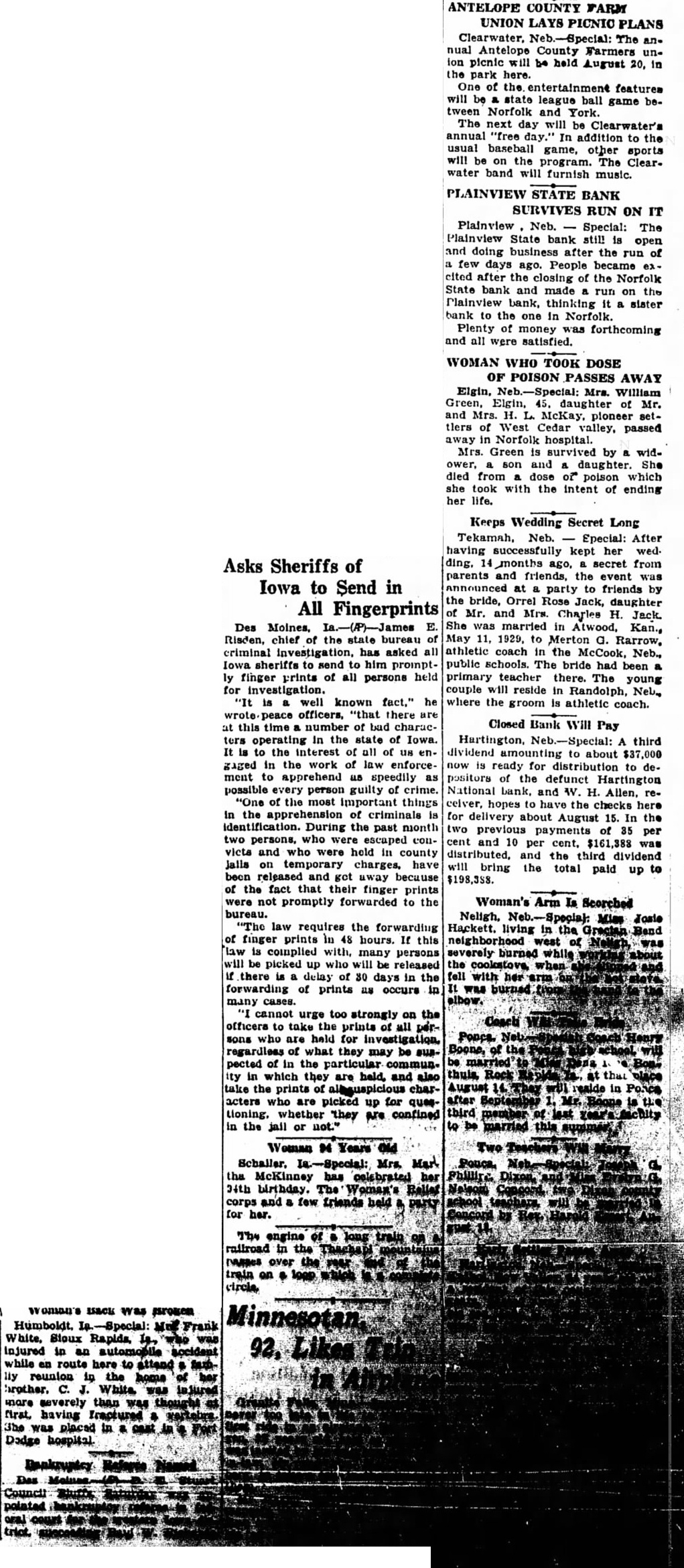 BANK RECEIVER NAMED The Hartington National bank, capital $40,000, deposits $350,000, closed Hartington, Cedar county, Tuesday last One deposits fund of collectpurpose of fighting The president the bank, the Hartington says as the positors fare getting their depend on the attitude the have the bank and who upon pay back. The that has with debt bank attitude. When bank because from borrowers failed. The bank fails large cent the borrowers begin fight claims against them, raising all sorts objections and ting imaginable sort claim. Very banks would they could collect the face value their notes. failure depositors would lose anything Those and berate the Nebraska guaranty should willing concede that the question has sides. The depositors Hartington National bank have protection. had been the the bank been great they under and addition they have guaranty There every believe that state banks get every dollar their deposits though greatly the certainty of payment. Bank Guaranty Attack. What written above might be proud the he rendered doubtful the Nebraska We to honor the supreme should hold the guar- the men who gave their fund lives. sentianticipated any than cept some knelt the what they could ground, on break There some badly that techniwounded, put thus, defect be found that would may long but without regret. levying assessThe which guaranty supreme motive Schantz, president of the triotism the There bank Omaha, leader willing mischief Nebraska state need for matters, heading need that spirit live. We need induce large now heed the time apply the the realm injunction state belief that American department Legion should lead in the spirit, special of should in the lead the line one cent that duty and service for law early have harmless December. doubt around now, those satisfied to along with the filed because long does not interfere their technical flaw in the us the story of the lady which much finally being found by to church. he to sleep. That would legislature he got the snoring snoring seem this shook courts will hold the to reply 'Leave me alone. would practically turn to get up. started guaranty unless the fire should of such that us are not could the legislasnoring not trycourts upset We guaranty unless very today task strong reason The bankers should go to legislature of they think the people state sugstand the law being killed. gested day the Milligan Picture Section. The Signal is presenting to its readers today devoted principally to Milligan pictures and personal torical matter. They pages eleven fourteen inclusive. Most from which the HaberFriend was largely preby except the reprint of the historical booklet published years ago, the authors of which the just course business hope readers find the section many pages and be found some statistics that might confuse does member that they years old. was stated that time that the average of county about $38. The pay of has since the beginning the world member statistics about the schools have no reference 1928. Rain Affects Graves. The rain that fell the earth more in the settle as feet. Joe Owens has been very filling in the graves We have engaged in newsbut heard which affected time. Some the fected much as three old. We hope has curred the that rain unusual depth Fillmore counfarm land also. About the Hadsells. from Hugh B. Hadsell Guide Rock proves that time Hugh realize that the Hadsell outfit gone eight years? Election day the Our be enjoy Signal The Signal