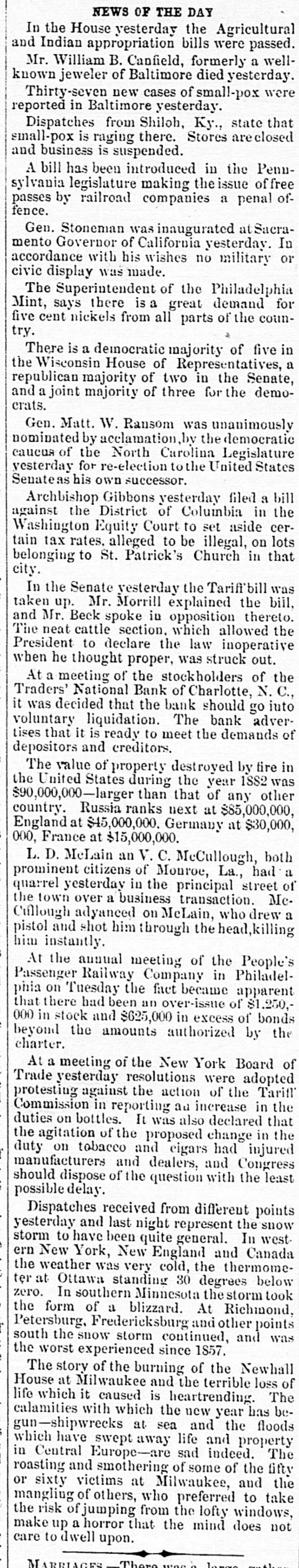 NEWS OF THE DAY In the House yesterday the Agricultural and Indian appropriation bills were passed. Mr. William B. Canfield, formerly a wellknown jeweler of Baltimore died yesterday. Thirty-seven new cases of small-pox were reported in Baltimore yesterday. from that Dispatches raging Shiloh, Stores Ky., state small-pox is there. areclosed and business is suspended. A bill has been introduced in the Pennsylvania legislature making the issue of free passes by railroad companies a penal offence. Gen. Stoneman was inaugurated at Sacramento Governor of California yesterday. In accordance with his wishes no military or civic display was made. The Superintendent of the Philadelphia Mint, says there is a great demand for five cent nickels from all parts of the country. There is a democratic majority of five in the Wisconsin House of Representatives, a republican majority of two in the Senate, and a joint majority of three for the democrats. Gen. Matt. W. Ransom was unanimously nominated by acclamation, by the democratic caucus of the North Carolina Legislature yesterday for re-election to the United States Senateas his own successor. Archbishop Gibbons yesterday filed a bill against the District of Columbia in the Washington Equity Court to set aside certain tax rates. alleged to be illegal, on lots belonging to St. Patrick's Church in that city. In the Senate yesterday the Tariff bill was taken up. Mr. Morrill explained the bill, and Mr. Beck spoke in opposition thereto. The neat cattle section. which allowed the President to declare the law inoperative when he thought proper, was struck out. At a meeting of the stockholders of the Traders' National Bank of Charlotte, N.C. it was decided that the bank should go iuto voluntary liquidation. The bank advertises that it is ready to meet the demands of depositors and creditors. The value of property destroyed by fire in the United States during the year 1882 was $90,000,000-Jarger than that of any other country. Russia ranks next at $85,000,000, England at $45,000,000. Gerinary at $30,000, 000, France at $15,000,000. L. D. McLain an V. C. McCullough, both prominent citizens of Mouroe, La., had a quarrel yesterday in the principal street of the town over a business transaction. Mc. Cilllough adyanced on McLain, who drew a pistol and shot him through the head, killing him instantly. At the annual meeting of the People's Passenger Railway Company in Philadelphia on Tuesday the fact became apparent that there had been an over-issue of $1.250,000 in stock and $625,000 in excess of bonds beyond the amounts authorized by the charter. At a meeting of the New York Board of Trade yesterday resolutions were adopted protesting against the action of the Tarifl Commission in reporting au increase in the duties on bottles. It was also declared that the agitation of the proposed change in the duty on tobacco and cigars had injured manufacturers and dealers, and Congress should dispose of the question with the least possible delay. Dispatches received from different points yesterday and last night represent the snow storm to have been quite general. In western New York, New England and Canada the weather was very cold, the thermometer at Ottawa standing 30 degrees below zero. In southern Minnesota the storm took the form of a blizzard. At Richmond, Petersburg, Fredericksburg and other points south the snow storm continued, and was the worst experienced since 1857. The story of the burning of the Newhall House at Milwaukee and the terrible loss of life which it caused is heartrending. The calamities with which the new year has begun-shipwrecks at sea and the floods which have swept away life and property in Central Europe-are sad indeed. The roasting and smothering of some of the fifty or sixty victims at Milwaukee, and the mangling of others, who preferred to take the risk of jumping from the lofty windows, make up a horror that the mind does not care to dwell upon. MARRIAGES