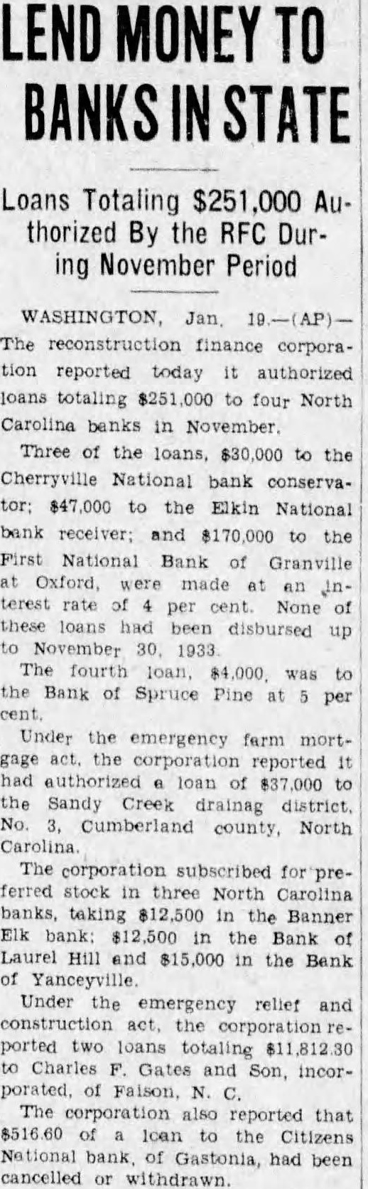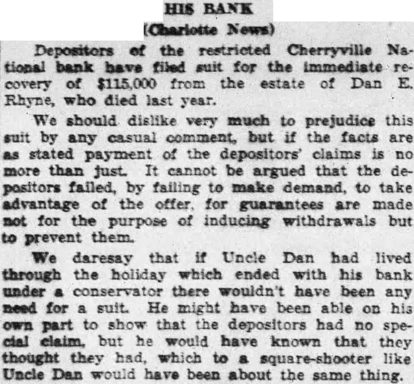 HIS BANK (Charlotte News) Depositors of the restricted Cherryville Na tional bank have filed for the immediate covery of $115,000 from the estate of Dan Rhyne, who died last year. We should dislike very much to prejudice this suit by any casual comment, the facts are stated payment of the depositors' claims no more than just. cannot be argued that the depositors failed, by failing make demand, take advantage of the offer. for guarantees made not for the purpose of inducing withdrawals but to prevent them. We daresay that if Uncle Dan had lived through the holiday which ended with his bank under conservator there wouldn't have been any need for suit. He might have been able his part show that the depositors no special claim. but would have known that they thought they which to square-shooter like Uncle Dan would have been about the same thing.