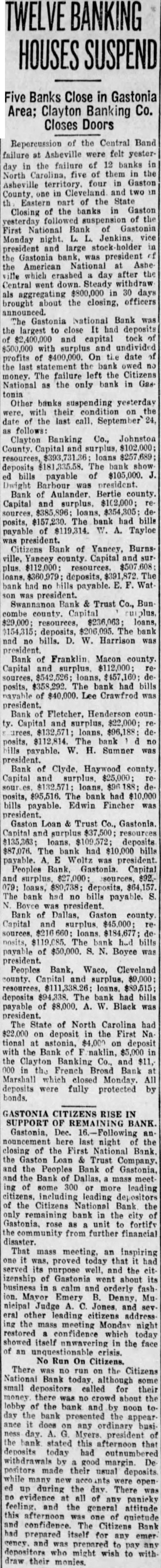 Five Banks Close in Gastonia Clayton Banking Co. Closes Doors of the Central Band Asheville were felt yesterfailure failure of banks North five them four Gaston Asheville Cleveland and Eastern the State the banks Gaston Closing the National Bank Gastonia First Monday night. president large the Gastonia bank, president American National Ashewhich crasbed day after the Central went down. Steady withdraw aggregating $800,000 about the closing, officers brought announced. Gastonia National Bank the largest to close deposits $2,400,000 and capital $500,000 surplus undivided profits $400,000. date last statement the bank owed The failure the Citizens money. National the only bank Gas Other banks suspending yesterday last call. September follows: Clayton Banking Co., Johnston County. The bills payable $105,000. Bank Bertie Capital and $157,230. had posits, Tayloe Bank of Yancey, Yancey Capital plus. deposits, bank payable. Bank Trust Bun county. $236,063 deposits, The nad bills. W. Harrison Bank Franklin Macon county. Capital and $112,000; posits, had bills $40,000. Lee president. Bank Fletcher. Henderson coun Capital $22,000; bank payable. H. Sumner president. Bank Clyde. county Capital $25,000; posits, $95,516. The bank had $10,000 bills payable. Edwin Fincher Gaston Loan Trust Capital bank $10,000 Woltz president. Peoples Gastonia Capital sources, $92. bank had bills payable. Gaston county Capital loans bank bills payable of $50,000. was president. Peoples Bank, Waco, Cleveland county. loans. deposits The had payable $8,000. W. Black was president. The State of North Carolina $22,000 deposit First Na on tional astonia, deposit Bank naklin, $5,000 the Clayton Banking Co., $11, French Broad Bank Marshall which closed Monday. All deposits were fully protected by bonds. GASTONIA RISE SUPPORT OF Dec. last night the closing of the First National Bank Loan Trust Company. the Bank the Bank of leading leading Citizens National Bank the bank rose unit fortify from further financial disaster. That mass meeting, Inspiring today served and the izenship Gastonia calm orderly nicipal Judge and citizens address the meeting Monday night restored confidence today showed itself face the No Run Citizens. There Citizens Bank small called for their there crowd about the lobby the bank and day appear any ordinary busipresident stated this deposits today had outnumbered margin. De positors during the There evidence panicky feeling. the general quietude Citizens Bank itself any depositors might wish their monies.