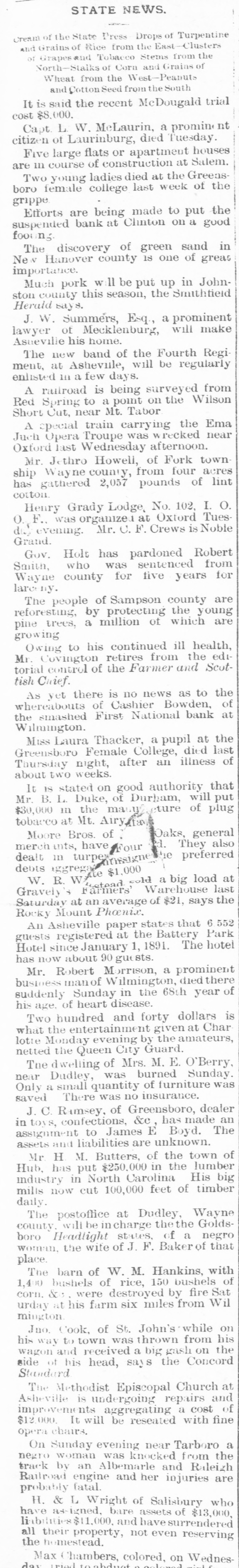 Cream of the State Press Drops of Turpentine and Grains of Rice from the East-Clusters of Grapes &nd Tobacco Stems from the North-Stalks of Corn and Grains of Wheat from the West-Peanuts and Cotton Seed fromtheSouth It is said the recent McDougald trial $8,000. Capt. L. W. McLaurin, a promine nt citizen of Laurinburg, died Tuesday. Five large flats or apartment houses are in course of construction at Salem. Two young ladies died at the Greensboro female college last week of the grippe Efforts are being made to put the suspended bank at Clinton on a good fooung The discovery of green sand in New Hanover county is one of great importance. Much pork W 11 be put up in Johnston county this season, the Smithfield Herald say J. W. Summers, Esq., a prominent lawyer of Mecklenburg, will make Asneville his home. The new band of the Fourth Regiment, at Ashevile, will be regularly enlisted In a few days. A railroad is being surveyed from Red Spring to a point on the Wilson Short Cut, near Mt. Tabor A special train carrying the Ema Juch Opera Troupe was recked near Oxford last Wednesday afternoon. Mr. Jethro Howell, of Fork township Wayne county, from four acres has gathered 2,057 pounds of lint cotton. Henry Grady Lodge. No. 102, I. O. 0. F., was organized at Oxford Tuesdul evening. Mr. U. F. Crews is Noble Grand. Gov. Holt has pardoned Robert Smith, who was sentenced from Wayne county for five years for lare ny. The people of Sampson county are reforesting, by protecting the young pine trees, a million of which are growing Owing to his continued ill health, Mr. Covington retires from the editorial control of the Farmer and Scottish Chief. As yet there is no news as to the whereabouts of Cashier Bowden, of the smashed First National bank at Wilmington. Miss Laura Thacker, a pupil at the Greensboro Female College, died last Thursday night, after an illness of about two weeks. It is stated on good authority that Mr. B. L. Duke, of Durham, will put $30,000 in the many ture of plug tobacco at Mt. Airy tave Oaks, general Moore Bros. of merch ints, have Four Pd. They also dealt in turper he preferred debts aggrega W. R. used Ate $1,000 cold a big load at Gravely S Farmers Warehouse last Saturday at an average of $21, says the Rocky Mount Phoenix. An Asheville paper states that 6 552 guests registered at the Battery Park Hotel since January 1, 1891. The hotel has now about 90 guests. Mr. Robert Morrison, a prominent business manof Wilmington, died there suddenly Sunday in the 68th year of his age, of heart disease. Two hundred and forty dollars is what the entertainment given at Char lotte Monday evening by the amateurs, netted the Queen City Guard. The dwelling of Mrs. M. E. O'Berry, near Dudley, was burned Sunday. Only a small quantity of furniture was saved There was no insurance. J. C. Ramsey, of Greensboro, dealer in toys, confections, &c, has made an assignment to James E Boyd. The assets and liabilities are unknown. Mr H M. Butters, of the town of Hub, has put $250,000 in the lumber industry in North Carolina His big mills now cut 100,000 feet of timber daily. The postoffice at Dudley, Wayne county. will be incharge the the Goldsboro Headlight states, of a negro woman, the wite of J. F. Baker of that place. The barn of W. M. Hankins, with 1,400 bushels of rice, 150 bushels of corn. & were destroyed by fire Sat urday at his farm six miles from Wil mington. Jno. Cook, of St. John's while on his way to town was thrown from his wagon and received a big gash on the
