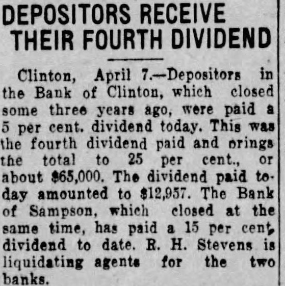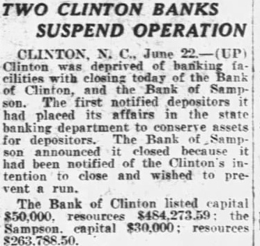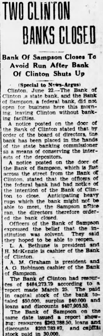Bank Of Closes To Sampson Avoid Run After Bank Of Clinton Shuts Up (Special to Bank of June Clinton state bank. and the Bank Sampson federal bank. did not open business here this morning. leaving Clinton without banking notice posted on the door of the Bank Clinton stated order of the board directors, the bank has been placed in the hands of the state banking conserving the interthe depositors. the door of notice posted on the Bank Sampson. which Just across the street from the Bank of be expressed belief that the insaid and and paid toand loans and discounts Bank Sampson on the The issued report showcapital