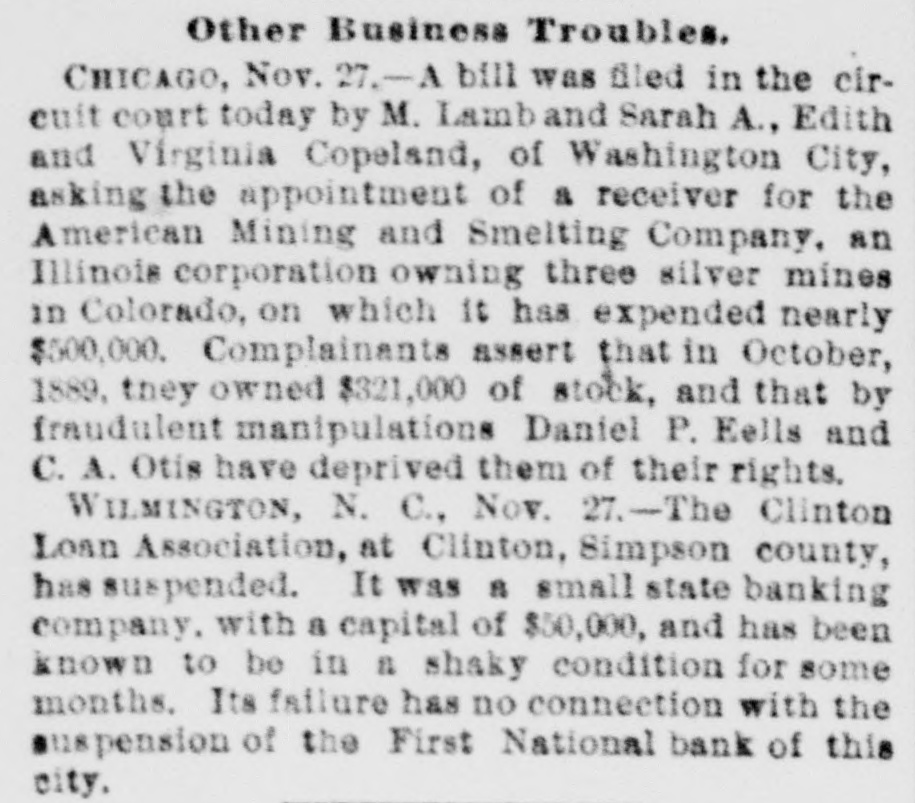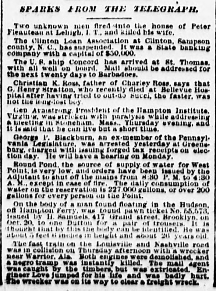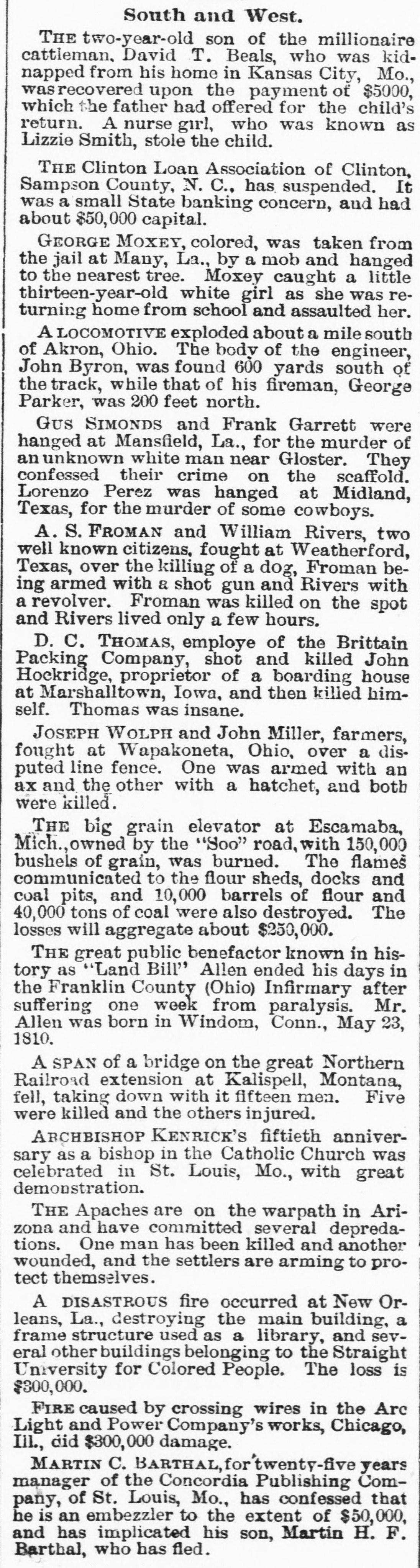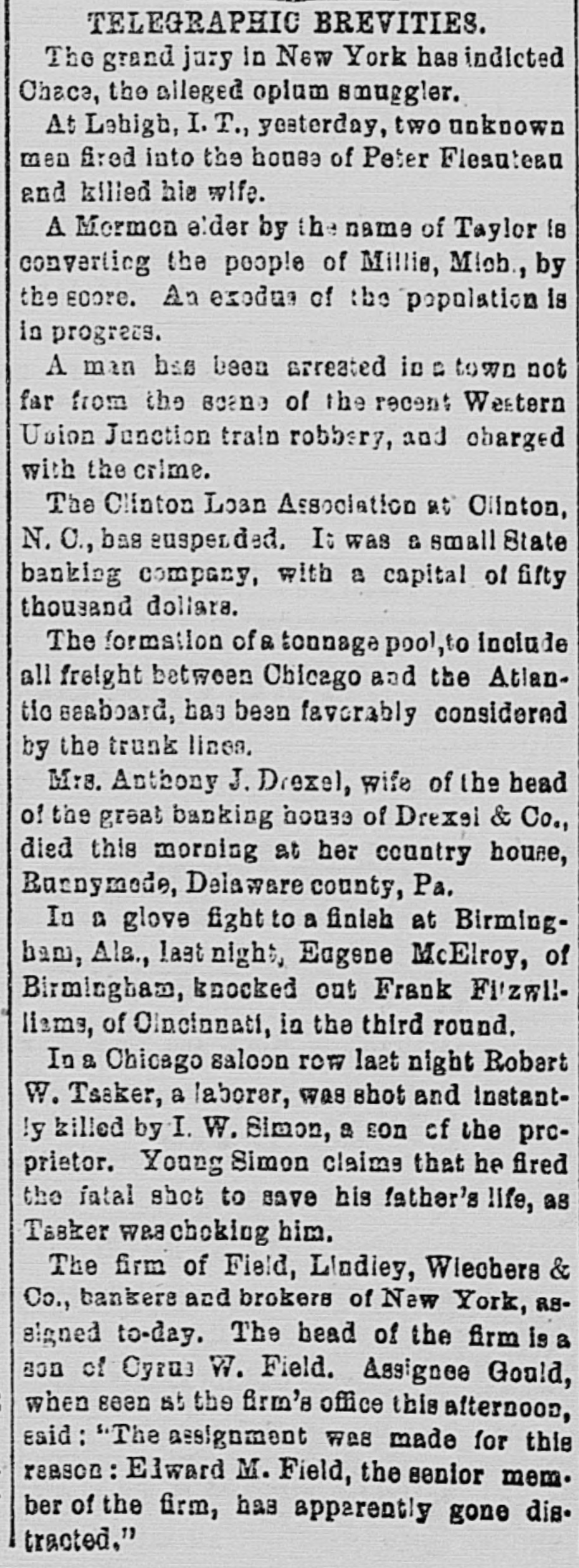 TELEGRAPHIC BREVITIES. The grand jury in New York has indicted Chace, the alleged oplum smuggler. At Lehigh, I. T., yesterday, two unknown men fired into the house of Peter Fleanteau and killed his wife. A Mormon elder by the name of Taylor Is converting the people of Millie, Mich, by the EDORE. An exedus of the population is in progress. A man bss been arreated in B town not far from the scane of the recent Western Union Junction train robbery, and charged with the crime. The Clinton Loan Association at Olinton, N. C., bas suspended. It was a small State banking company, with a capital of fifty thousand dollars. The formation of & tonnage pool, to include all freight between Chicago and the Atlantic seaboard, has been favorably considered by the trunk lines. Mrs. Anthony J. Drezel, wife of the head of the great banking house of Drexel & Co., died this morning at her country house, Bunnymode, Delaware county, Pa. In a glove fight to a finish at Birmingham, Ala., last night, Eugene McElroy, of Birmingham, knocked out Frank Fitzwilliams, of Cincinnati, in the third round. In a Chicago saloon row last night Robert W. Tasker, a laborer, was shot and instant!y killed by I. W. Simon, a son of the proprietor. Young Simon claims that he fired the fatal shot to save his father's life, as Tasker waschoking him. The firm of Field, Lindley, Wiechers & Co., bankers and brokers of New York, RSsigned to-day. The head of the firm is a son of Cyrus W. Field. Assignee Gould, when seen at the firm's office this afternoon, said: "The assignment was made for this reason: Elward M. Field, the senior mem. ber of the firm, has apparently gone dis. tracted."