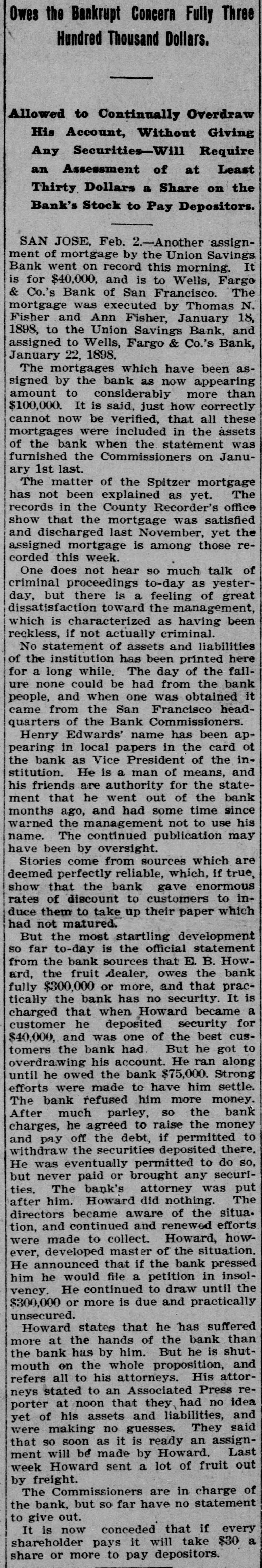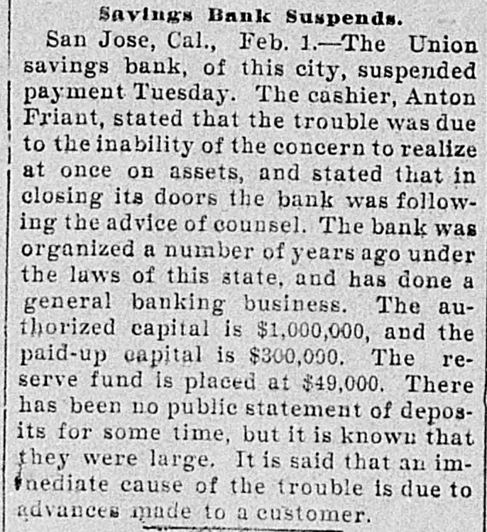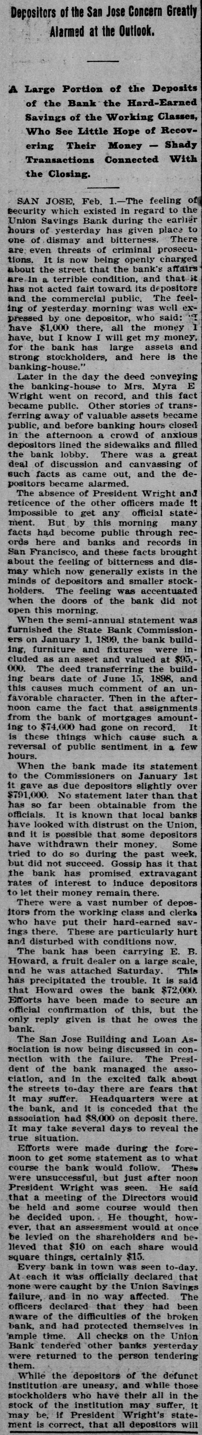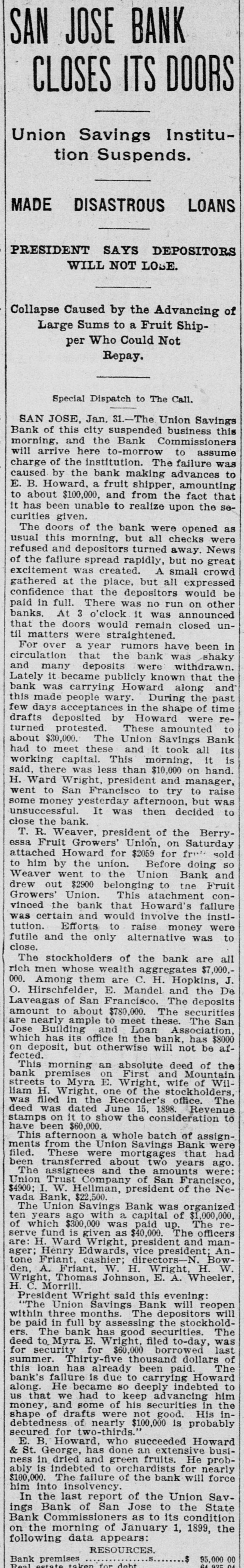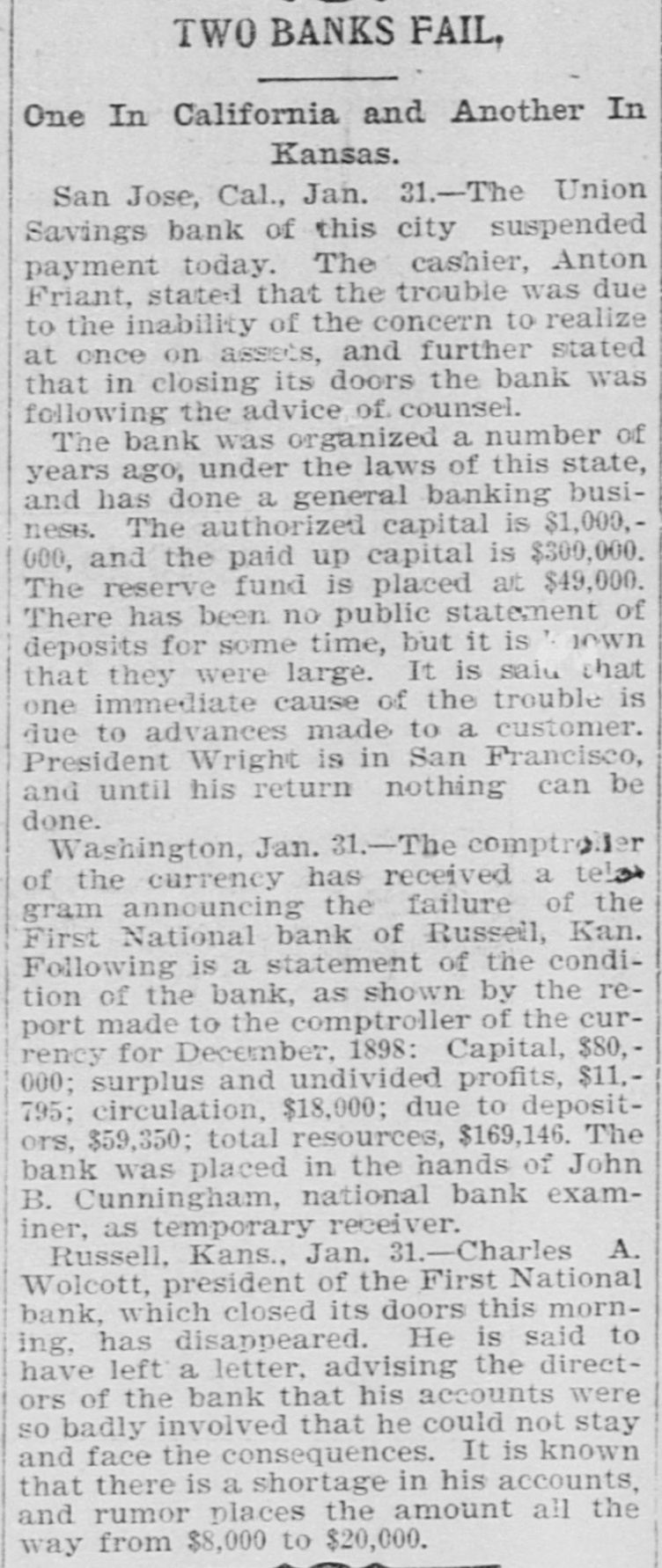 TWO BANKS FAIL, One In California and Another In Kansas. San Jose, Cal., Jan. 31.-The Union Savings bank of this city suspended payment today. The cashier, Anton Friant, stated that the trouble was due to the inability of the concern to realize at once on assets, and further stated that in closing its doors the bank was following the advice of counsel. The bank was organized a number of years ago, under the laws of this state, and has done a general banking business. The authorized capital is $1,000,000, and the paid up capital is $300,000. The reserve fund is placed at $49,000. There has been no public statement of deposits for some time, but it is T. town that they were large. It is saiu that one immediate cause of the trouble is due to advances made to a customer. President Wright is in San Francisco, and until his return nothing can be done. Washington, Jan. 31.-The comptroller of the currency has received a teles gram announcing the failure of the First National bank of Russell, Kan. Following is a statement of the condition of the bank, as shown by the report made to the comptroller of the currency for December, 1898: Capital, $80,000; surplus and undivided profits, $11.795; circulation, $18,000; due to depositors, $59,350; total resources, $169,146. The bank was placed in the hands of John B. Cunningham, national bank examiner, as temporary receiver. Russell. Kans., Jan. 31.-Charles A. Wolcott, president of the First National bank, which closed its doors this morning, has disappeared. He is said to have left a letter, advising the directors of the bank that his accounts were so badly involved that he could not stay and face the consequences. It is known that there is a shortage in his accounts, and rumor places the amount all the way from $8,000 to $20,000.
