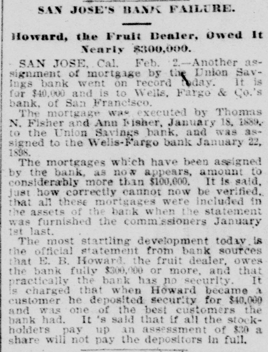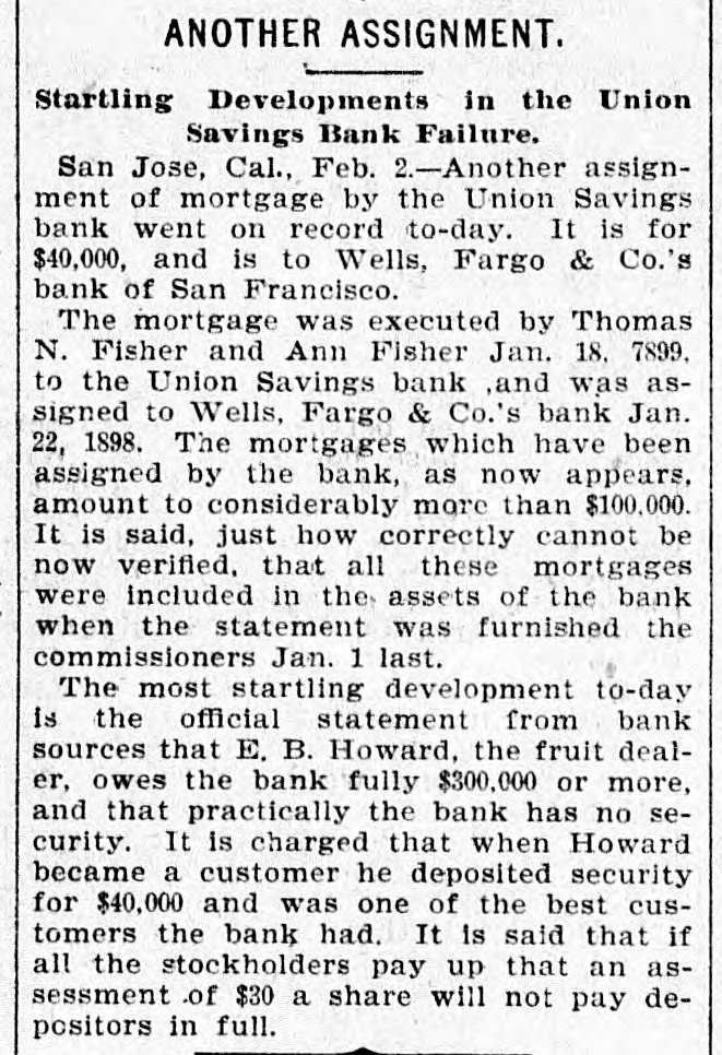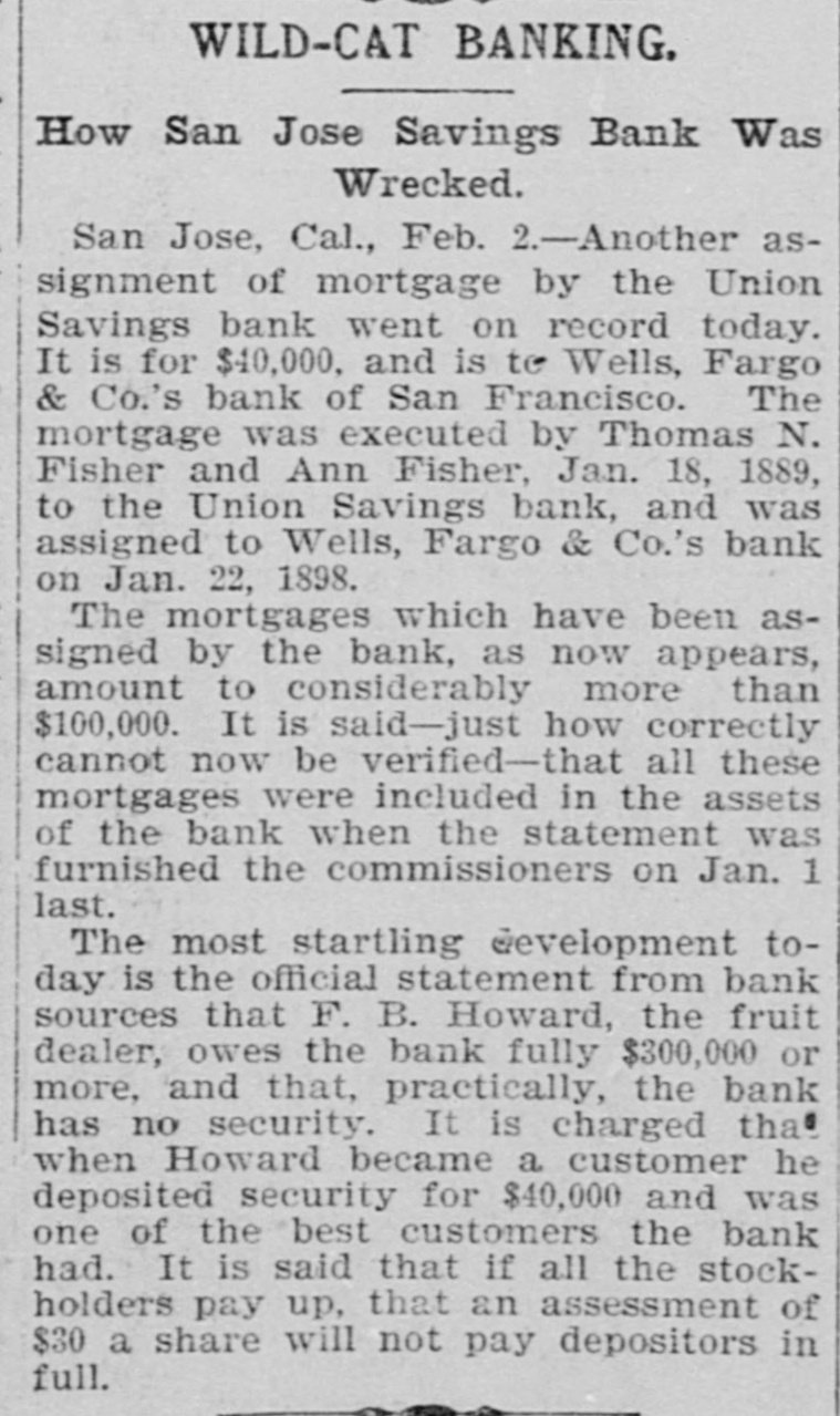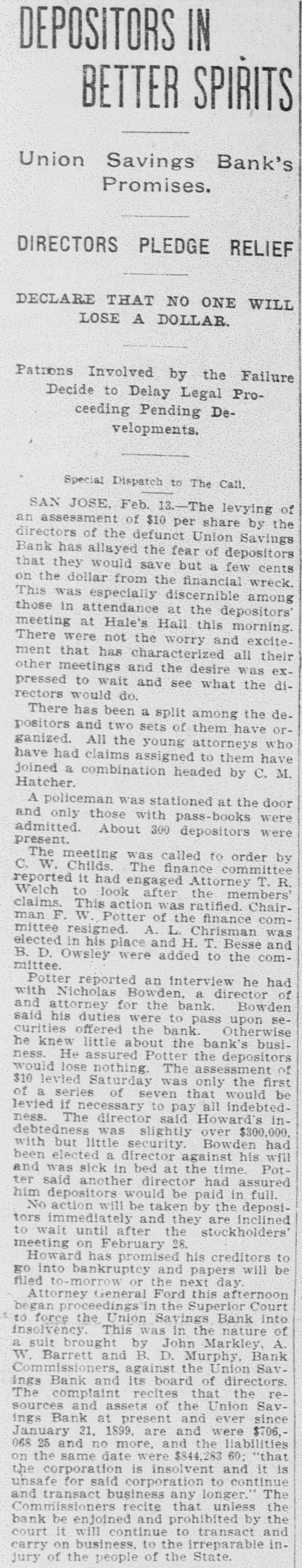 TWO BANKS FAIL, One In California and Another In Kansas. San Jose, Cal., Jan. 31.-The Union Savings bank of this city suspended payment today. The cashier, Anton Friant, stated that the trouble was due to the inability of the concern to realize at once on assets, and further stated that in closing its doors the bank was following the advice of counsel. The bank was organized a number of years ago, under the laws of this state, and has done a general banking business. The authorized capital is $1,000,000, and the paid up capital is $300,000. The reserve fund is placed at $49,000. There has been no public statement of deposits for some time, but it is T. town that they were large. It is saiu that one immediate cause of the trouble is due to advances made to a customer. President Wright is in San Francisco, and until his return nothing can be done. Washington, Jan. 31.-The comptroller of the currency has received a teles gram announcing the failure of the First National bank of Russell, Kan. Following is a statement of the condition of the bank, as shown by the report made to the comptroller of the currency for December, 1898: Capital, $80,000; surplus and undivided profits, $11.795; circulation, $18,000; due to depositors, $59,350; total resources, $169,146. The bank was placed in the hands of John B. Cunningham, national bank examiner, as temporary receiver. Russell. Kans., Jan. 31.-Charles A. Wolcott, president of the First National bank, which closed its doors this morning, has disappeared. He is said to have left a letter, advising the directors of the bank that his accounts were so badly involved that he could not stay and face the consequences. It is known that there is a shortage in his accounts, and rumor places the amount all the way from $8,000 to $20,000.