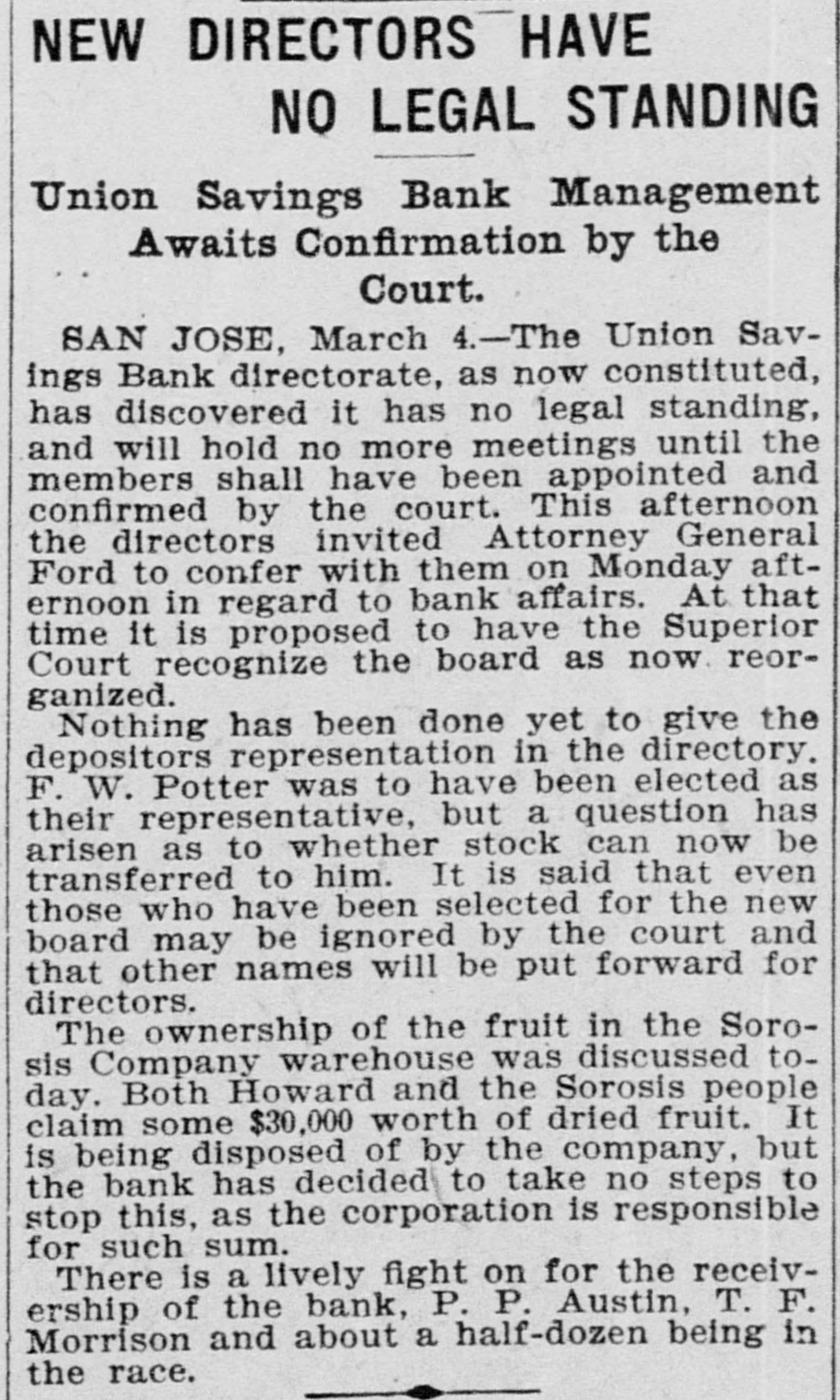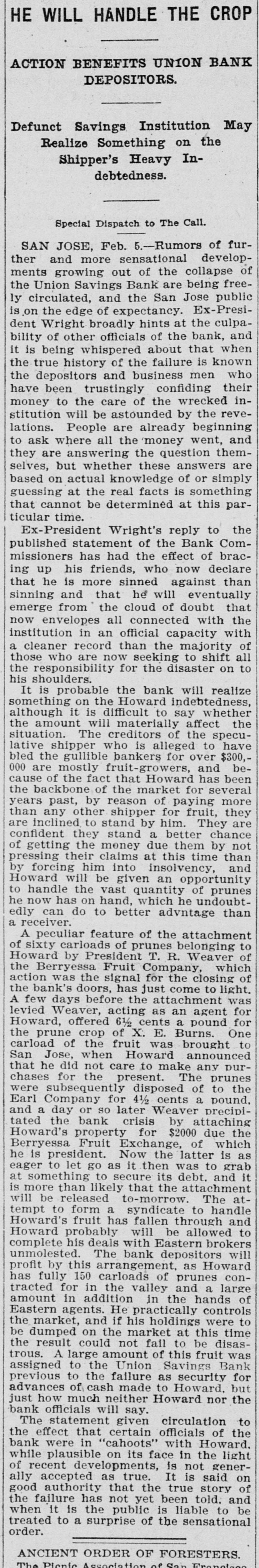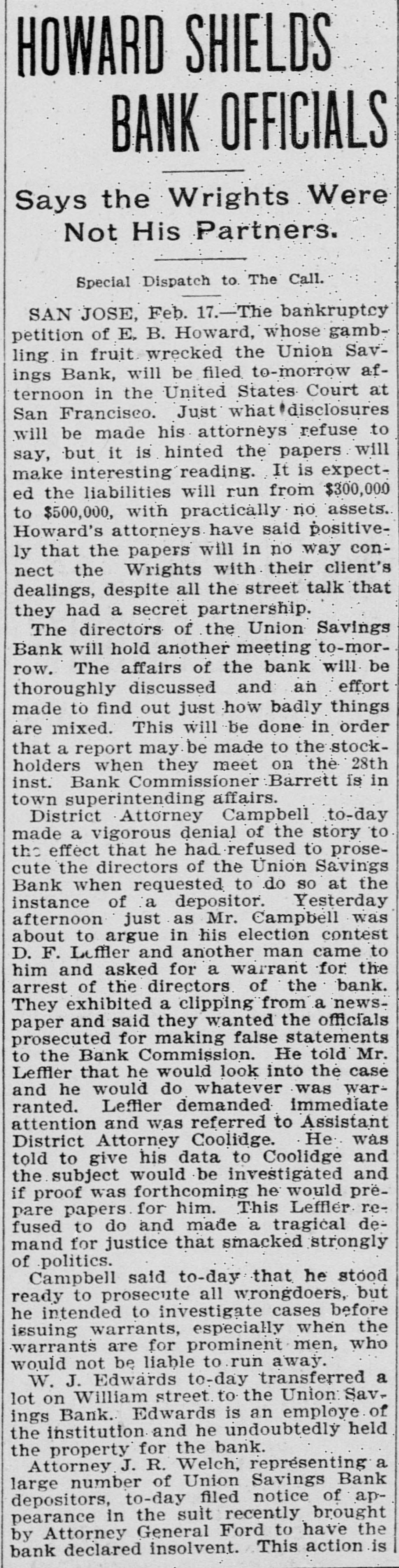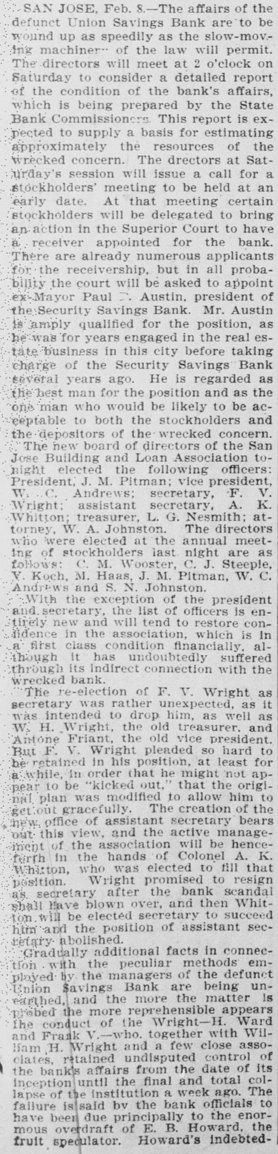 TWO BANKS FAIL, One In California and Another In Kansas. San Jose, Cal., Jan. 31.-The Union Savings bank of this city suspended payment today. The cashier, Anton Friant, stated that the trouble was due to the inability of the concern to realize at once on assets, and further stated that in closing its doors the bank was following the advice of counsel. The bank was organized a number of years ago, under the laws of this state, and has done a general banking business. The authorized capital is $1,000,000, and the paid up capital is $300,000. The reserve fund is placed at $49,000. There has been no public statement of deposits for some time, but it is T. town that they were large. It is saiu that one immediate cause of the trouble is due to advances made to a customer. President Wright is in San Francisco, and until his return nothing can be done. Washington, Jan. 31.-The comptroller of the currency has received a teles gram announcing the failure of the First National bank of Russell, Kan. Following is a statement of the condition of the bank, as shown by the report made to the comptroller of the currency for December, 1898: Capital, $80,000; surplus and undivided profits, $11.795; circulation, $18,000; due to depositors, $59,350; total resources, $169,146. The bank was placed in the hands of John B. Cunningham, national bank examiner, as temporary receiver. Russell. Kans., Jan. 31.-Charles A. Wolcott, president of the First National bank, which closed its doors this morning, has disappeared. He is said to have left a letter, advising the directors of the bank that his accounts were so badly involved that he could not stay and face the consequences. It is known that there is a shortage in his accounts, and rumor places the amount all the way from $8,000 to $20,000.