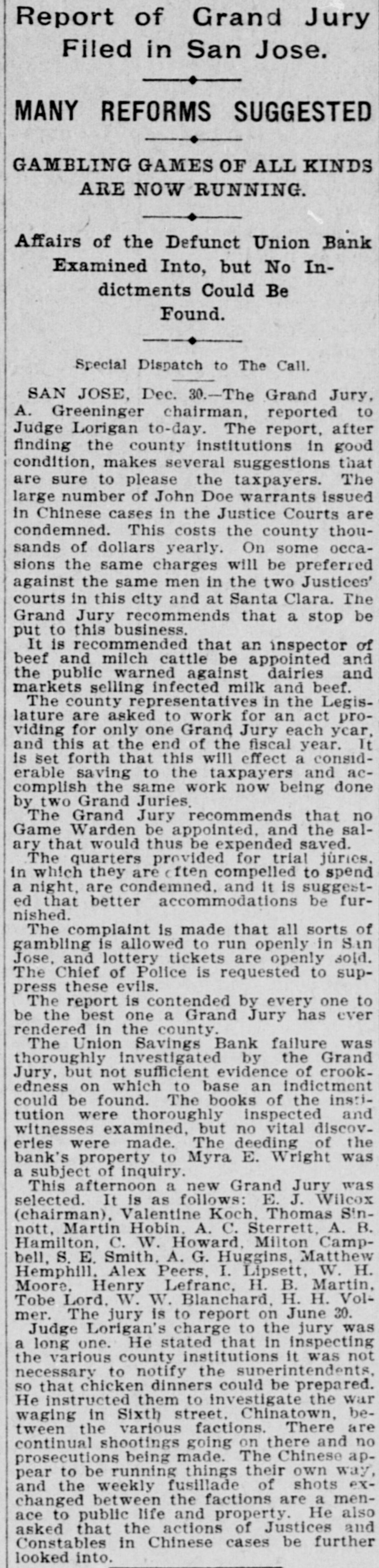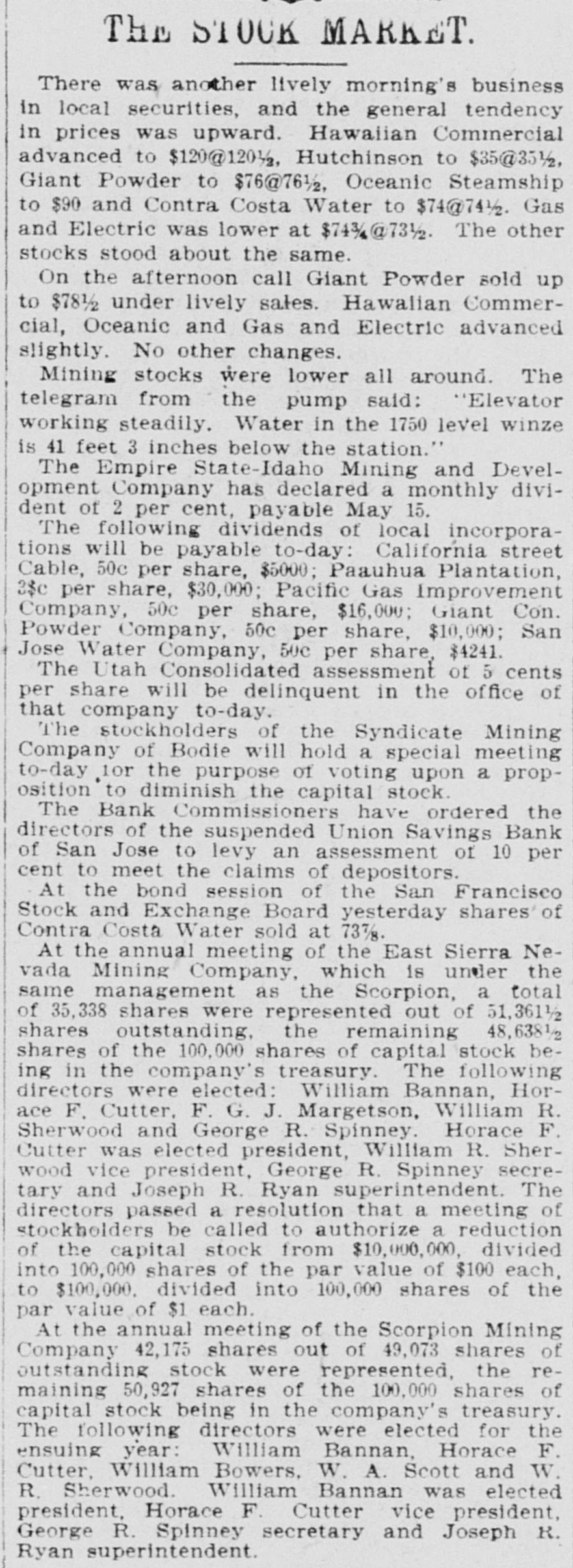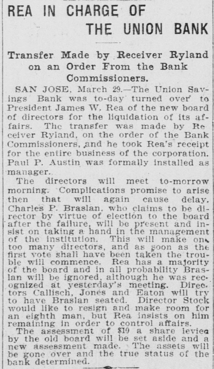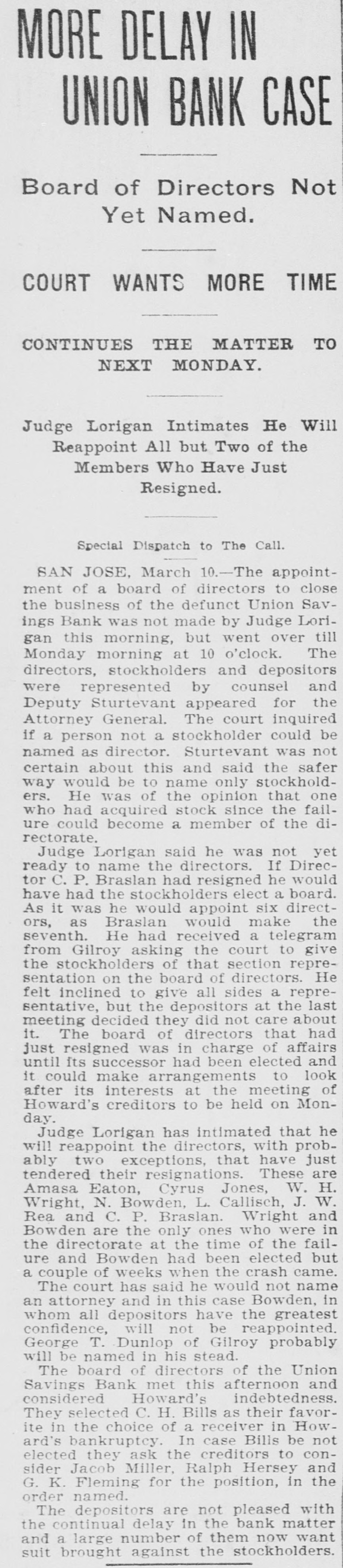TWO BANKS FAIL, One In California and Another In Kansas. San Jose, Cal., Jan. 31.-The Union Savings bank of this city suspended payment today. The cashier, Anton Friant, stated that the trouble was due to the inability of the concern to realize at once on assets, and further stated that in closing its doors the bank was following the advice of counsel. The bank was organized a number of years ago, under the laws of this state, and has done a general banking business. The authorized capital is $1,000,000, and the paid up capital is $300,000. The reserve fund is placed at $49,000. There has been no public statement of deposits for some time, but it is T. town that they were large. It is saiu that one immediate cause of the trouble is due to advances made to a customer. President Wright is in San Francisco, and until his return nothing can be done. Washington, Jan. 31.-The comptroller of the currency has received a teles gram announcing the failure of the First National bank of Russell, Kan. Following is a statement of the condition of the bank, as shown by the report made to the comptroller of the currency for December, 1898: Capital, $80,000; surplus and undivided profits, $11.795; circulation, $18,000; due to depositors, $59,350; total resources, $169,146. The bank was placed in the hands of John B. Cunningham, national bank examiner, as temporary receiver. Russell. Kans., Jan. 31.-Charles A. Wolcott, president of the First National bank, which closed its doors this morning, has disappeared. He is said to have left a letter, advising the directors of the bank that his accounts were so badly involved that he could not stay and face the consequences. It is known that there is a shortage in his accounts, and rumor places the amount all the way from $8,000 to $20,000.