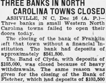 ELEVEN BANKS CLOSE RALEIGH, Dec. Eleven banks in North Carolina closed their doors today. Four banks in Gaston four Asheville area Western North Carolina. one Cleveland one county and one Bertie county shut their doors. The First National Bank of Gastonia was the largest the The Peoples Bank of Waco in Cleveland with capital of $111,shut its doors. The ClayBanking Company of Clayton. capitalized with resources did not The Bank Aulander Bertie with capital and also did not open. BANK OF CLOVER CLOSES Dec. The Bank Clover, York counclosed its doors today. Robinson, president of the First National Bank of Gastonia, failed to open this morning. also president of the Clover BUNCOMBE BANK CLOSES Dec. Swannanoa Bank and Trust Company oa, in Buncombe failed open doors this the board of directors taking this precautionary measure to protect the bank's assets. In its statement of tion, Swannanoa Bank and Trust Company reported deposliability of with tal stock and surplus and profits amounting $9,040. FRANKLIN BANK SHUT Bank Franklin closed morning leaving the town Franklin, Macon counwithout financial action taken the board of directors protect the deposiface threatened withdrawals today. The Citizens bank, during the financial with the Bank Franklin. BANK FAILS Dec. Bank Clyde, Clyde this morning by order of its board of directors, explained the tion taken "protect the positors. The bank heavy withdrawals yesterday. FLETCHER BANK CLOSES FLETCHER, Dec. Bank Fletcher, Henderson county, o'clock this in face heavy attributed the caused the closing other banks this closed deposit liability cording to the last statement. has surplus undivided profits $21,500. and Rhodes, cashier of the bank.
