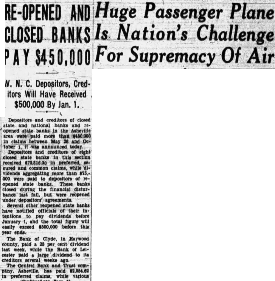 RE-OPENED AND Huge Passenger Plane CLOSED BANKS Is Nation's Challenge For Supremacy Of Air PAY $450,000 W. N. C. Depositors, Creditors Will Have Received $500,000 By Jan. 1. Depositors and creditors of closed state and national banks and reopened state banks the Asheville area were paid more than $450,000 in claims May 28 and was today. and creditors of eight closed state in this received in preferred, cured and common claims, while vidends more than 875.000 were to depositors of reopened state banks. These banks closed during the disturbance last fall. but were reopened Several other reopened banks have notified officials of their tentions dividends January the total figure will easily exceed $500,000 before this year ends. The Bank of Clyde, in Haywood per cent dividend last week. while the Bank cester paid large to its The Central and Trust pany, paid $2,054.62 in while various
