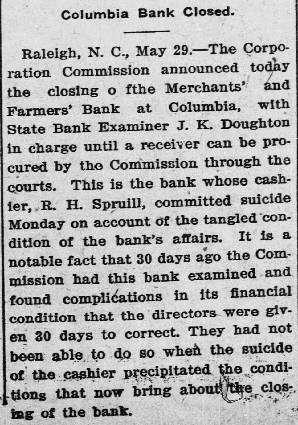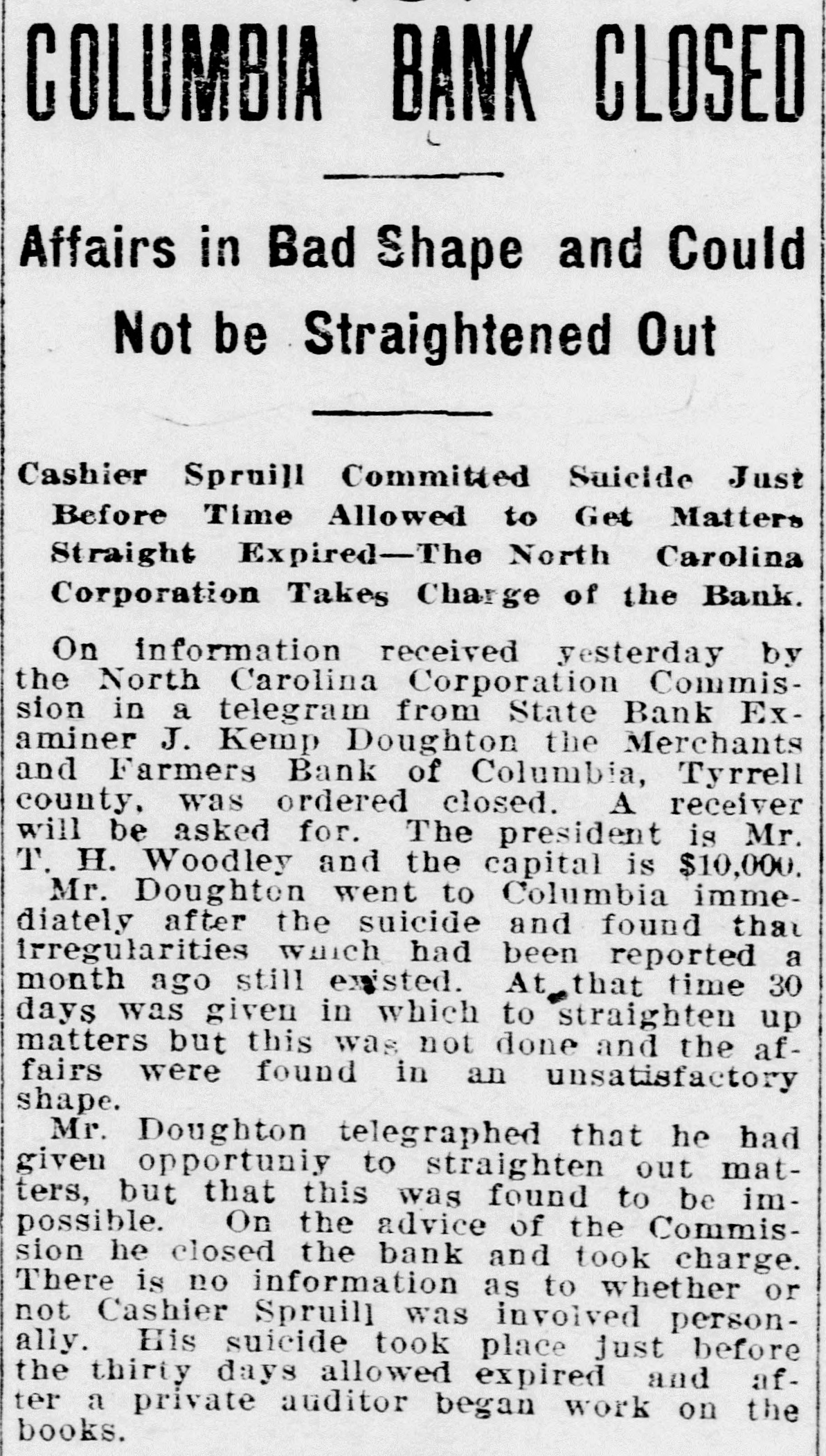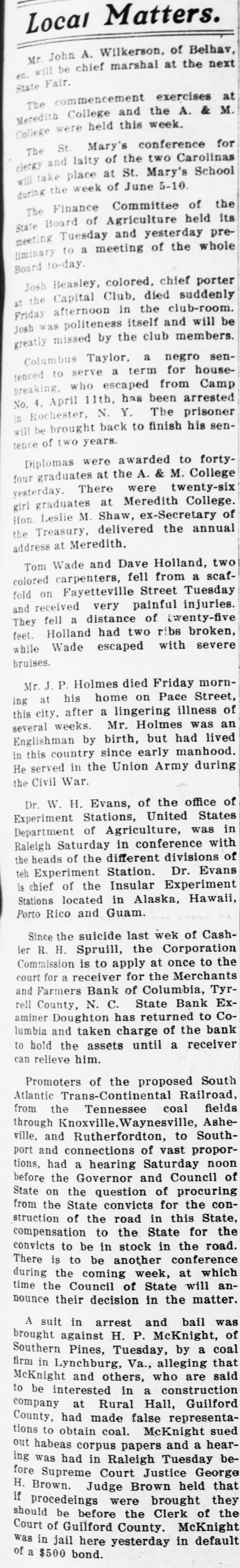 Local Matters. Mr. John A. Wilkerson, of Belhav, en. will be chief marshal at the next State Fair. The commencement exercises at Meredith College and the A. & M. College were held this week. The St. Mary's conference for clergy and lalty of the two Carolinas will take place at St. Mary's School during the week of June 5-10. The Finance Committee of the State Board of Agriculture held its meeting Tuesday and yesterday preliminary to a meeting of the whole Board to-day. Josh Beasley, colored, chief porter at the Capital Club, died suddenly Friday afternoon in the club-room. Josh was politeness itself and will be greatly missed by the club members. Columbus Taylor, a negro sentenced to serve a term for housebreaking, who escaped from Camp No. 4, April 11th, has been arrested in Rochester, N. Y. The prisoner will be brought back to finish his sentence of two years. Diplomas were awarded to fortyfour graduates at the A. & M. College yesterday. There were twenty-six girl graduates at Meredith College. Hon. Leslie M. Shaw, ex-Secretary of the Treasury, delivered the annual address at Meredith. Tom Wade and Dave Holland, two colored carpenters, fell from a scaffold on Fayetteville Street Tuesday and received very painful injuries. They fell a distance of twenty-five feet. Holland had two ribs broken, while Wade escaped with severe bruises. Mr. J. P. Holmes died Friday morning at his home on Pace Street, this city, after a lingering illness of several weeks. Mr. Holmes was an Englishman by birth, but had lived in this country since early manhood. He served in the Union Army during the Civil War. Dr. W. H. Evans, of the office of Experiment Stations, United States Department of Agriculture, was in Raleigh Saturday in conference with the heads of the different divisions of teh Experiment Station. Dr. Evans is chief of the Insular Experiment Stations located in Alaska, Hawaii, Porto Rico and Guam. Since the suicide last wek of Cashier R. H. Spruill, the Corporation Commission is to apply at once to the court for a receiver for the Merchants and Farmers Bank of Columbia, Tyrrell County, N. C. State Bank Examiner Doughton has returned to Columbia and taken charge of the bank to hold the assets until a receiver can relieve him. Promoters of the proposed South Atlantic Trans-Continental Railroad, from the Tennessee coal fields through Knoxville. Waynesville, Asheville, and Rutherfordton, to Southport and connections of vast proportions, had a hearing Saturday noon before the Governor and Council of State on the question of procuring from the State convicts for the construction of the road in this State, compensation to the State for the convicts to be in stock in the road. There is to be another conference during the coming week, at which