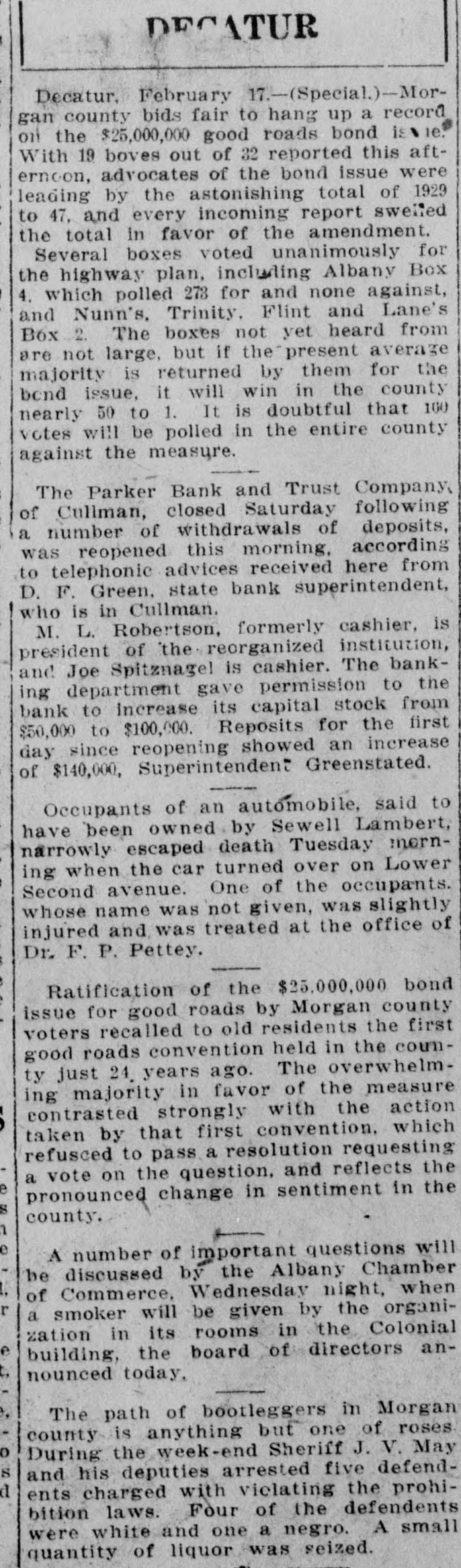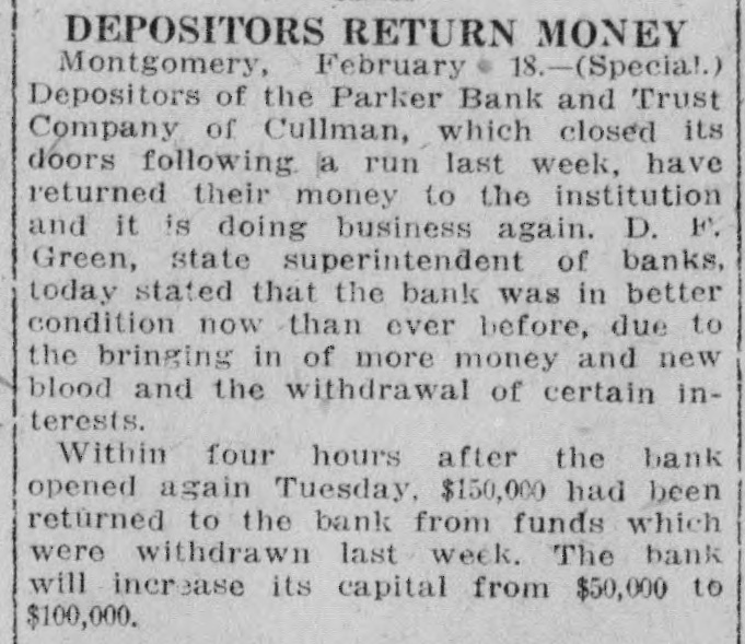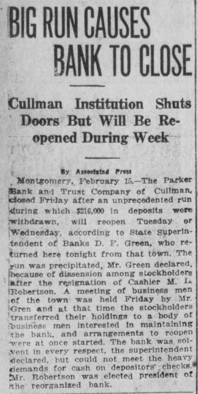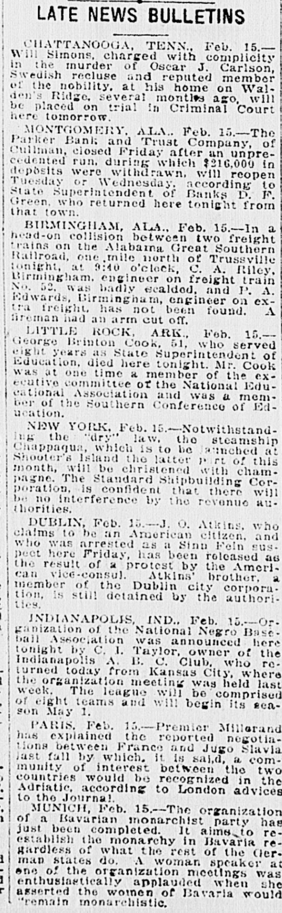 LATE NEWS BULLETINS CHATTANOOGA, TENN., Feb. 15.Will Simons, charged with complicity in the murder of Oscar J. Carlson, Swedish recluse and reputed member of the nobility. at his home on Walden's Ridge, several months ago, will be placed on trial in Criminal Court here tomorrow. MONTGOMERY. ALA. Feb. 15.-The Parker Bank and Trust Company, of Cullman, closed Friday after an unprecedented run, during which $216,000 in deposits were withdrawn, will reopen Tuesday or Wednesday, according to State Superintendent of Banks D. F. Green, who returned here tonight from that town. BIRMINGHAM, ALA., Feb. 15.-In a head-on collision between two freight trains on the Alabama Great Southern Railroad, one mile north of Trussville tonight, at 3:40 o'clock, C. A. Riley, Birmingham, engineer on freight train No. 52, was badly scalded, and P. A. Edwards, Birmingham, engineer on extra freight, has not been found. 1 fireman had an arm cut off. LITTLE ROCK, ARK., Feb. 15.-George Brinton Cook, 51, who served eight years as State Superintendent of Education, died here tonight. Mr. Cook was at one time a member of the executive committee or the National Educational Association and was a member of the Southern Conference of Education. NEW YORK, Feb. 15.-Notwithstanding the "dry" law, the steamship Chappaqua, which is to be Jannched at Shooter's Island the latter Part of this month, will be christened with champagne. The Standard Shipbuilding Corporation, is confident that there will be no interference by the revenue authorities. DUBLIN, Feb. 15.-J. O. Atkins, who claims to be an American citizen, and who was arrested as a Sinn Fein suspect here Friday, has been released as the result of a protest by the American vice-consul. Atkins' brother, a member of the Dublin city corporation, is still detained by the authorities. INDIANAPOLIS, IND., Feb. 15.-Organization of the National Negro Baseball Association was announced here tonight by C. I. Taylor, owner of the Indianapolis A. B. C. Club, who returned today from Kansas City, where the organization meeting was held last week. The league will be comprised of eight teams and will begin its season May 1. PARIS, Feb. 15.-Premier Millerand has explained the reported negotiations between France and Jugo Slavia last fall by which. it is sai,d, a community of interest between the two countries would be recognized in the Adriatic, according to London advices to the Journal MUNICH, Feb. 15.-The organization of a Bavarian monarchist party has just been completed. It aims to reestablish the monarchy in Bavaria regardless of what the rest of the Clerman states do. A woman speaker at one of the
