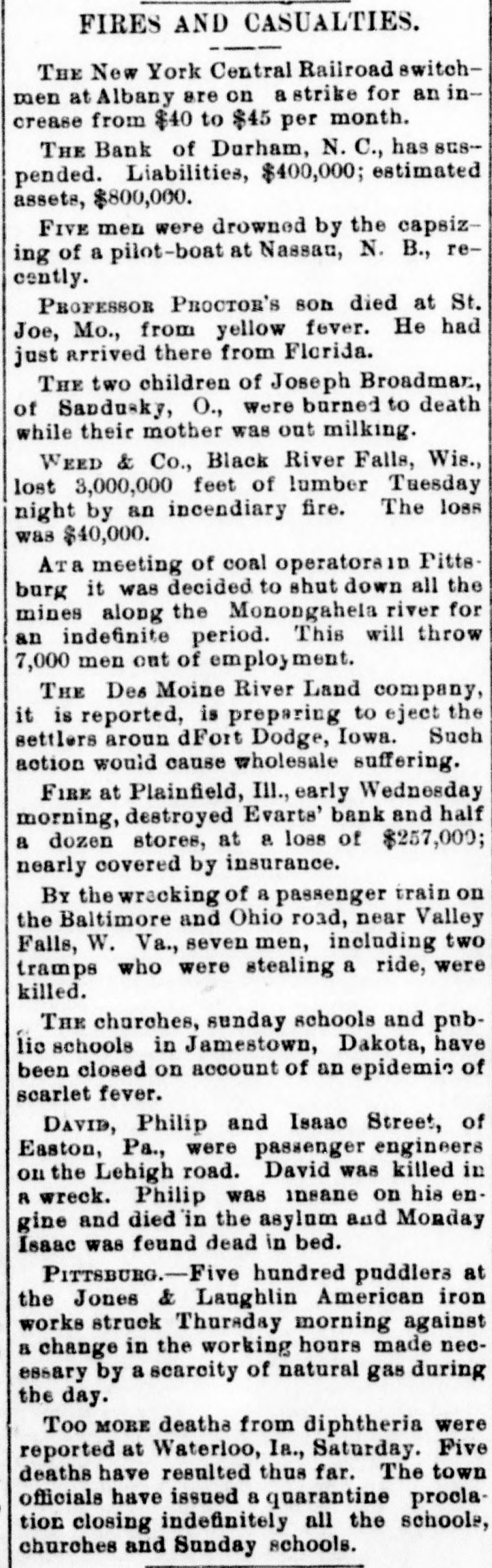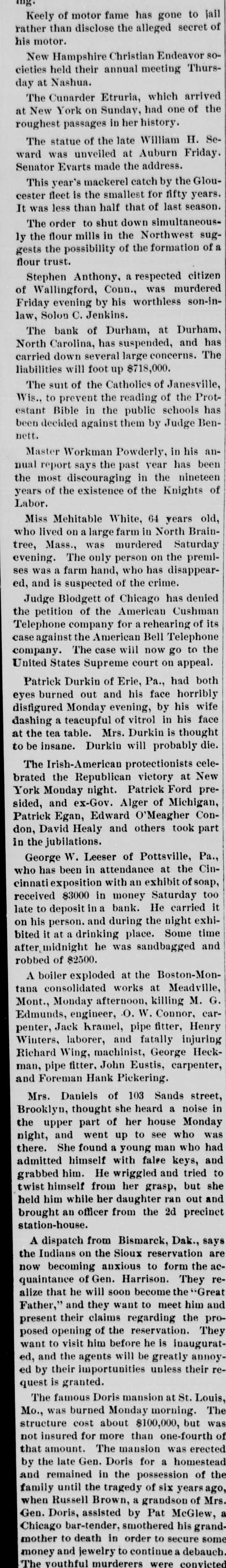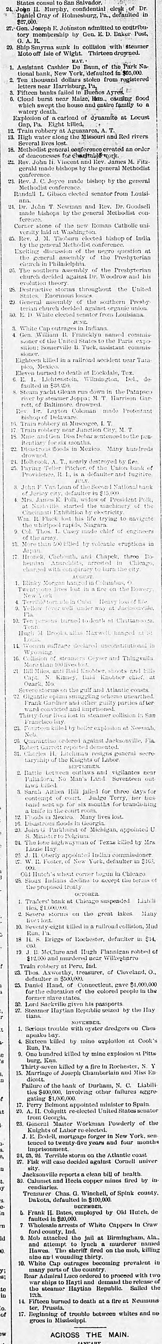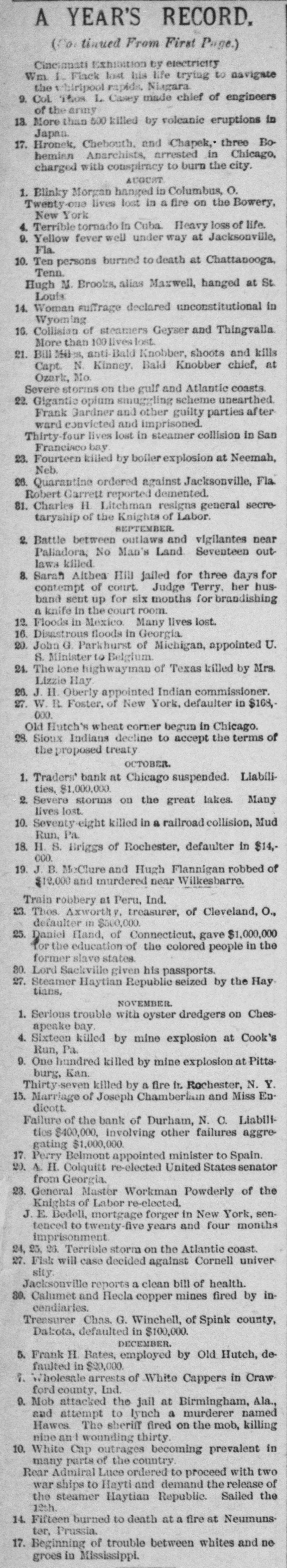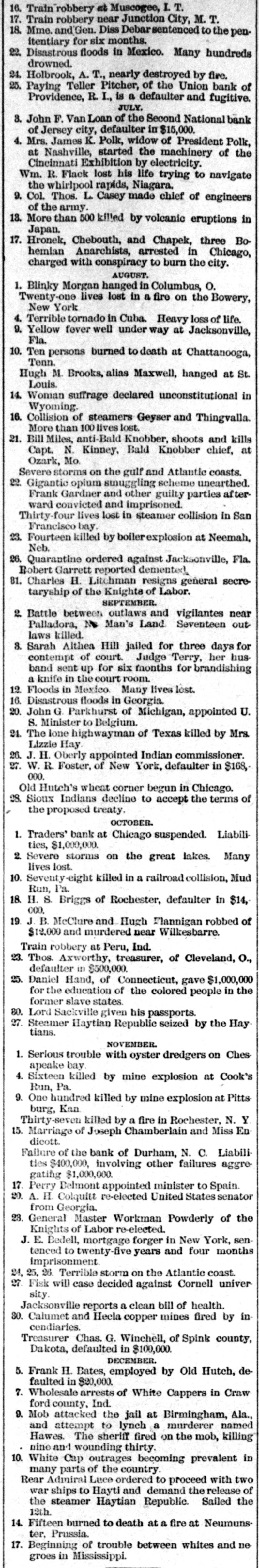 16. Train robbery at Muscogee, I. T. 17. Train robbery near Junction City, M. T. 18. Mme. and'Gen. Diss sentenced to the penitentiary for six months. 22. Disastrous floods in Mexico. Many hundreds drowned. 24. Holbrook, A. T., nearly destroyed by fire. 25. Paying Teller Pitcher, of the Union bank of Providence, R. I., is a defaulter and fugitive. JULY. 8. John F. Van Loan of the Second National bank of Jersey city, defaulter in $15,000. 4. Mrs. James K. Polk, widow of President Polk, at Nashville, started the machinery of the Cincinnati Exhibition by electricity. Wm. R. Flack lost his life trying to navigate the whirlpool rapids, Niagara. 9. Col. Thos. L. Casey made chief of engineers of the army. 18. More than 500 killed by volcanic eruptions in Japan. 17. Hronek, Chebouth, and Chapek, three Bohemian Anarchists, arrested in Chicago, charged with conspiracy to burn the city. AUGUST. 1. Blinky Morgan hanged in Columbus, O. Twenty-one lives lost in a fire on the Bowery, New York 4. Terrible tornado in Cuba. Heavy loss of life. 9. Yellow fever well under way at Jacksonville, Fla. 10. Ten persons burned to death at Chattanooga, Tenn. Hugh M. Brooks, alias Maxwell, hanged at St. Louis. 14. Woman suffrage declared unconstitutional in Wyoming. 16. Collision of steamers Geyser and Thingvalla. More than lives lost. 21. Bill Miles, anti-Bald Knobber, shoots and kills Capt. N. Kinney, Bald Knobber chief, at Ozark, Mo. Severe storms on the gulf and Atlantic coasts. 22. Gigantic opium smuggling scheme unearthed. Frank Gardner and other guilty parties afterward convicted and imprisoned. Thirty-four lives lost in steamer collision in San Francisco bay. 23. Fourteen killed by boiler explosion at Neemah, Neb. 26. Quarantine ordered against Jacksonville, Fla. Robert Garrett reported demented B1. Charles H. Litchman resigns general secretaryship of the Knights of Labor. SEPTEMBER. 2. Battle between outlaws and vigilantes near Palladora, No Man's Land Seventeen outlaws killed. 8. Sarah Althea Hill jailed for three days for contempt of court. Judge Terry, her husband sent up for six months for brandishing a knife in the court room. 12. Floods in Mexico. Many lives lost. 16. Disastrous floods in Georgia. 20. John G. Parkhurst of Michigan, appointed U. S. Minister to Belgium. 24. The lone highwayman of Texas killed by Mrs. Lizzie Hay 26. J. H. Oberly appointed Indian commissioner. 27. W. R. Foster, of New York, defaulter in $168, 000. Old Hutch's wheat corner begun in Chicago. 28. Sioux Indians decline to accept the terms of the proposed treaty. OCTOBER. 1. Traders' bank at Chicago suspended. Liabilities, $1,000,000. 2. Severe storms on the great lakes. Many lives lost. 10. Seventy-eight killed in a railroad collision, Mud Run, Pa. 18. H. S. Briggs of Rochester, defaulter in $14, 000. 19 J B. McClure and Hugh Tlannigan robbed of $12,000 and murdered near Wilkesbarre. Train robbery at Peru, Ind. 23. Thos. Axworthy, treasurer, of Cleveland, O., defaulter in $500,000. 25. Daniel Hand, of Connecticut, gave $1,000,000 for the education of the colored people in the former slave states. 30. Lord Sackville given his passports. 27. Steamer Haytian Republic seized by the Hay tians. NOVEMBER. 1. Serious trouble with oyster dredgers on Chesapeake bay 4. Sixteen killed by mine explosion at Cook's Run, Pa. 9. One hundred killed by mine explosion at Pitts burg, Kan Thirty-seven killed by a fire in Rochester, N. Y 15. Marriage of Joseph Chamberlain and Miss En dicott. Failure of the bank of Durham, N. C. Liabilities $400,000, involving other failures aggregating $1,000,000. 17. Perry Belmont appointed minister to Spain 20. A. H. Colquitt re-elected United States senator from Georgia. 23. General Master Workman Powderly of the Knights of Labor re-elected. J. E. Bedell, mortgage forger in New York, sentenced to twenty-five years and four months imprisonment 24, 25, 26. Terrible storm on the Atlantic coast. 27 Fisk will case decided against Cornell university. Jacksonville reports a clean bill of health. 30. Calumet and Hecla copper mines fired by in cendiaries. Treasurer Chas. G. Winchell, of Spink county, Dakota, defaulted in $100,000. DECEMBER. 5. Frank H. Bates, employed by Old Hutch, defaulted in $20,000. 7. Wholesale arrests of White Cappers in Craw ford county, Ind. 9. Mob attacked the jail at Birmingham, Ala., and attempt to lynch a murderer named Hawes. The sheriff fired on the mob, killing nine and wounding thirty. 10. White Cap outrages becoming prevalent in many parts of the country. Rear Admiral Luce ordered to proceed with two war ships to Hayti and demand the release of the steamer Haytian Republic. Sailed the 12th. 14. Fifteen burned to death at a fire at Neumunster, Prussia. 17. Beginning of trouble between whites and negroes in Mississippi.