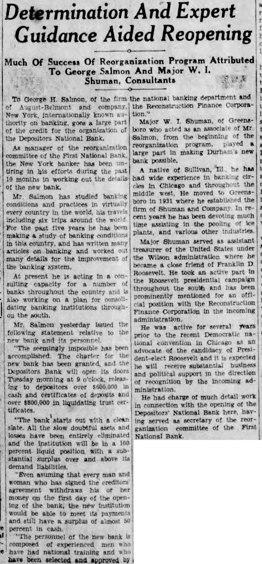 DEPOSITORS NEW ERA NATIONAL HERALDS CITY'S NEW BANK WILL OPEN DOORS TUESDAY MORNING Is Chartered And Approved By Comptroller To Have Strong Personnel 0. WILDE IS PRESIDENT Comes To New Banking Institution With Long And Valuable Experience Chartered and approved by the comptroller of the currency based on sound financial structure, the Depositors National Bank Durham open its doors for business Tuesday morning the building formerly occupled by the old First National at West Corcoran streets. The opening destined bring new to financial circles. The formal opening will climax months hard work and dogged determination on the part the organization committee the old First National will present people of and neighboring towns and cities the soundest and best named, not largest, banking institutions in the country. Group Enterprise The Depositors National has capital of $200,000 and $100,000. The depositors First National will receive percent of their deposits on the opening and assurance subsequent payments, the total amount not less than 50 percent amounts to made in certificates deposit payable every four All deposits of less than will be paid in The capital and surplus were subscribed and paid in by of the closed bank, while 90 percent more of depositors signed the creditors' agreement. allowing bank begin operation with sizeable amount deposits. Wilde Is President The president the Depositors National bank Wilde, wide banking experience, both with large banking houses and with the government. comes to Durhighly recommended by his associates and by the U. treasury department. Other officers Judge R. Syses, president, and Scovill Wannamaker cashier. Judge Sykes needs introduction here Mr Wannamaker native of South Carolina has been engaged the banking business for many years. For sometime he was with the Charlotte office of the Reconstruction nance Corporation The Directors hammer resounding throughout The board directors of the the preparations are being positors National bank composed made for program R. Otto that far W. Fassett, George Dr. that carried out during 1932. M. Briggs, C. Council and figures, last week by the chamber of show great reorganization of the closed The in the status First National into the new Deposiof the city the form of increased National was brought about only business. are hard and deterafter months handled in an effective way mined work on the part of the comhas been reheaded by Judge Sykes. mittee celved from officials charge extensive was the working structure the distribution loan the closed bank and wide of for extension of relief. the committee field kinds are operating upon good was forced overcome many obschedules. some of which at times stacles, Durham, to Newthreatened reorganization movesom, county manager, ment with failure. The committee the cities of assisted by 100 or more public the state and nation in the stability spirited citizens and business leaders industry and His opinin reopening program found echo other an opportunity to the people heard their view munity's and financial life. yesterday the city and the executive agent the commitThe year that has George H. Salmon New itself. coveted York directed the reorganization gained through the ability of men contributed months of tireless and and finance keep works and thought toward the success head the rising tide of the He ably assisted economic which unby Major W. Shuman of Greensemployment people boro. through the nation and stagnation to addition to Judge Sykes and many While other secMr. Salmon the was comof country were in of Dr. W. Fassett, posed throes apparently Briggs, B. was headed economic ruin, the Council, Council, C. B. Sherpeople Durham were able man and K. Rand. that tide and those