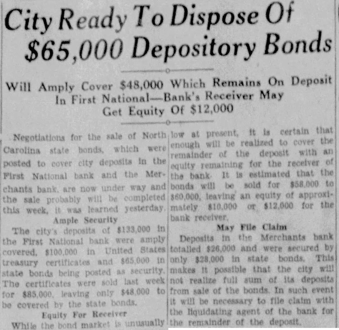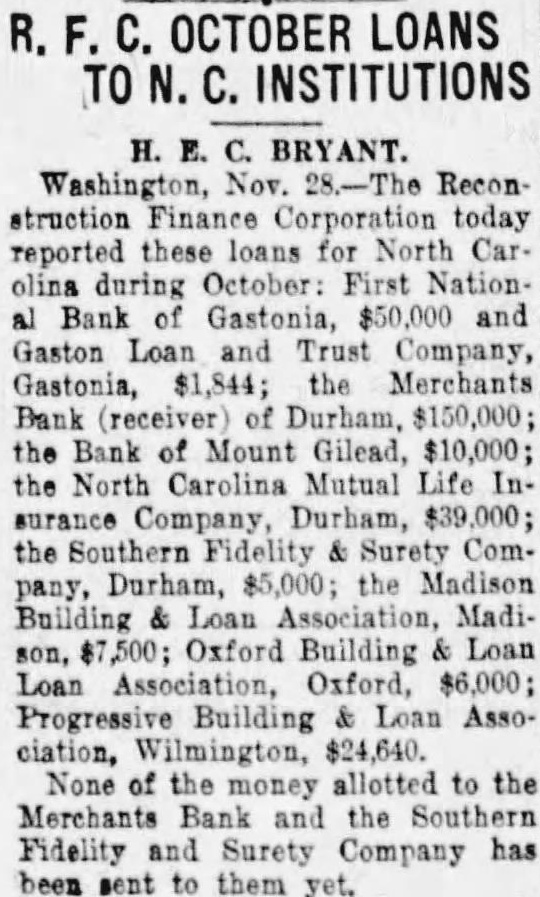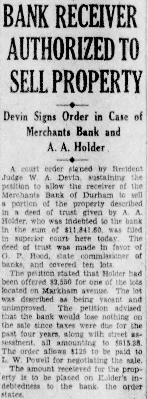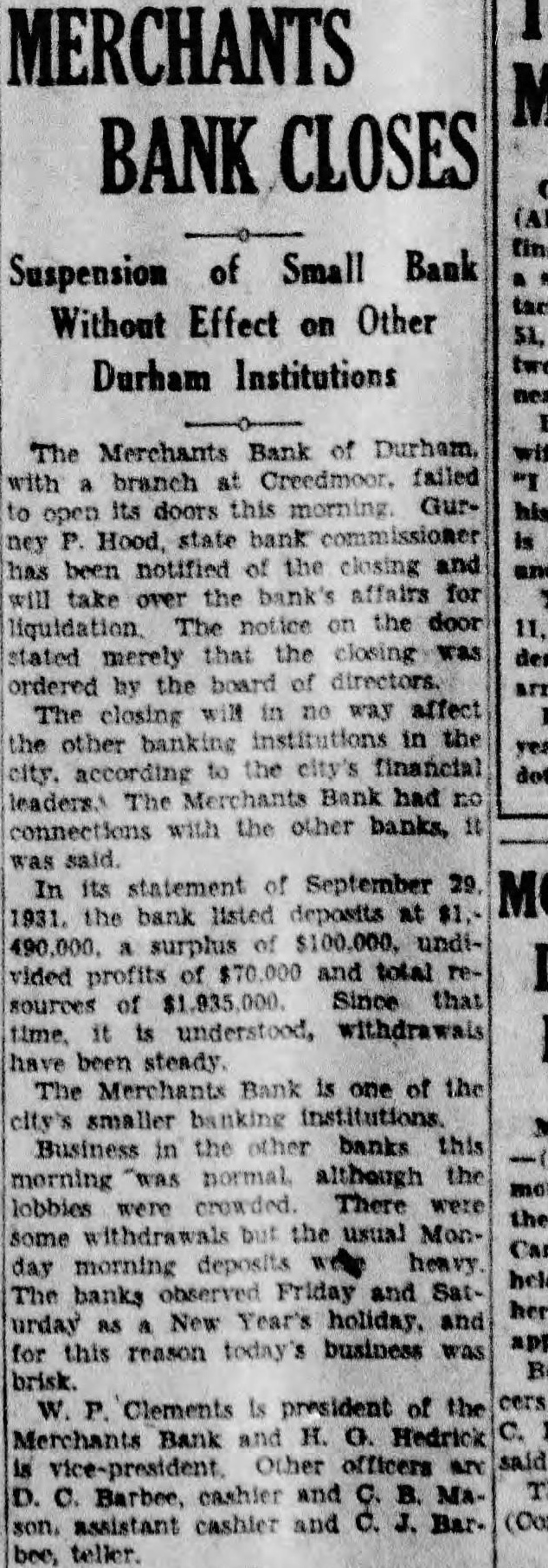 Close helped them break into the red and locked home. convene Raleigh, Saturday, attend the Fifteenth Annual Meeting of the North Carolina Society Engineers to be held the Sir Walter Subjects statewide interest and importance will be taken up. drive secure typographical vey of the state to supplement the control survey which now way will be initiated: plans for the formulation of new building code for North Carolina will be discussed and the report of the comthat subject will be heard Officers the Society are Geo. Syme of Raleigh president: Becton of Wilmington ident: and Summie Whitener, State College, secretary and treasurer. Miss Nebrasta Williams, James Hatch, Miss Eveline and little Jessie Edward Darden Mrs. Ella Bunn who has been duty out of town for the weeks home again Prof. LeRoy Borden, Prof. A Check, Prof Brick Junior Mrs. Brimmery and Miss Norfleet Hertford were visitors Mrs. Martha Borden of School street. BANK IS CLOSED Raleigh. Jan. Merchants Bank of Durham with branch at Creedmore did not open for business today. Gurney Hood state bank examiner, was notified. The bank listed deposits of in its statement of September 29, last. It was capitalized reported surplus undivided profits of and resources of $1,935,000.
