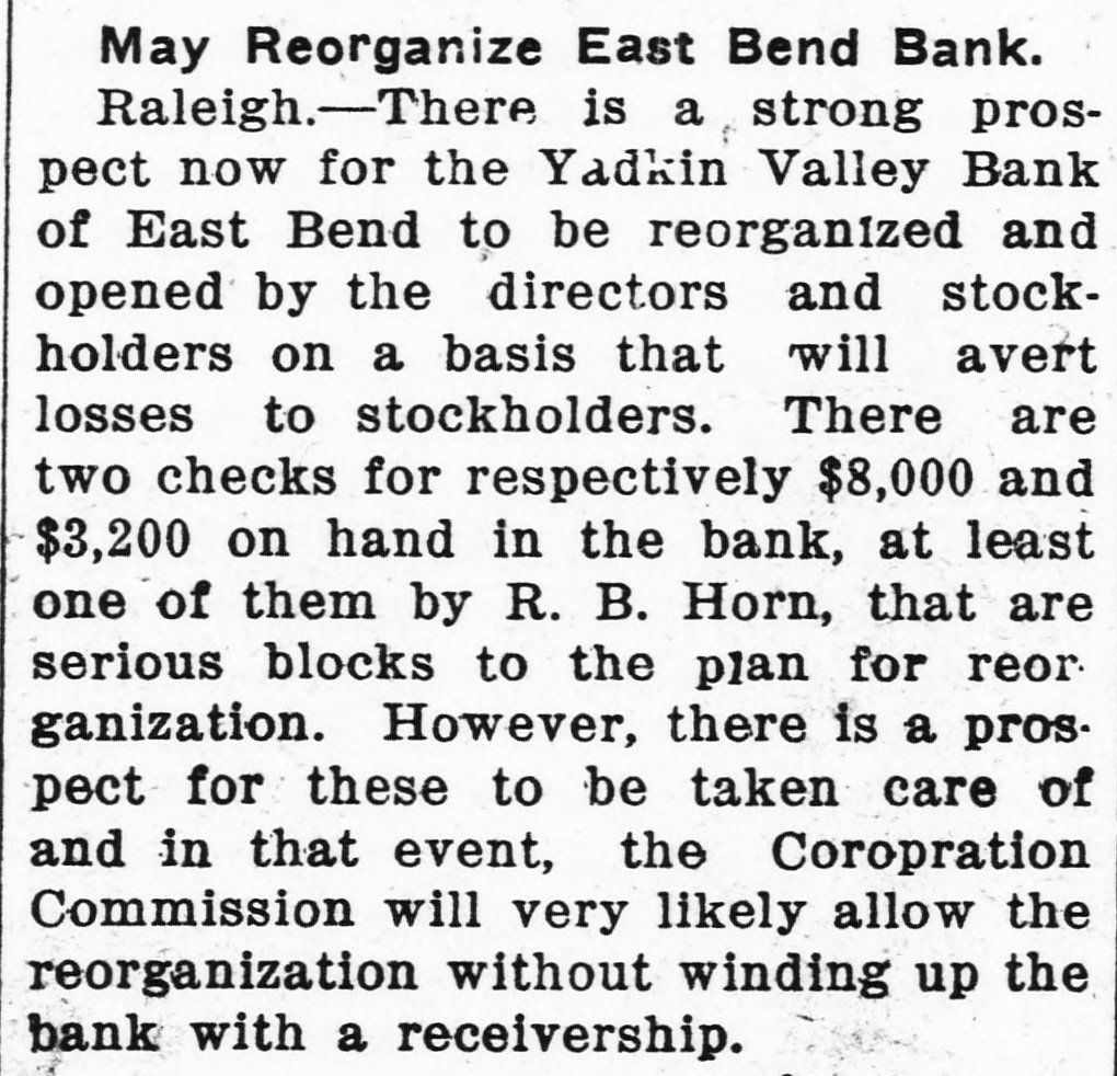 May Reorganize East Bend Bank. Raleigh.-There is a strong prospect now for the Yadkin Valley Bank of East Bend to be reorganized and opened by the directors and stockholders on a basis that will avert losses to stockholders. There are two checks for respectively $8,000 and $3,200 on hand in the bank, at least one of them by R. B. Horn, that are serious blocks to the plan for reor ganization. However, there is a prospect for these to be taken care of and in that event, the Coropration Commission will very likely allow the reorganization without winding up the bank with a receivership.