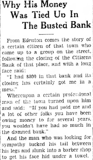 Coal Coal dumpings at Hampton Roads piers from midnight Thursday midnight Chesapeake Ohio, tons. Norfolk & 24,885 tons. Prevailing prices coal Hampton are: to $4.60; high volatile, $4.20 $4.50. BANK DIRECTORS PROTECT DEPOSITORS N. Dec. Citizens Bank of Edenton was closed today by order of the board of rectors, "for the protection of depositors. The bank capitalized at $100,000 of and resources of $599.- CHARGES SLAVERY are being by Australian cattlemen, "Darkie" Rowe, workers' union organizer, charges. Rowe, called "Darkie" because his terest the aboriginals, says they forced watch cattle during He says rations are scanty and flogging is common. RELIEVES COUGH If troubled coughing at night, mix togethere equal parts and then add few drops of lemon juice. Take troubled coughing and see if it does not bring relief. DOOR KNOBS Door knobs sould be washed once along with the general there youngsters the home the door knobs are great deal of punishment and really need this attention. There are approximately 100,000 deer about are killed annually by hunters.
