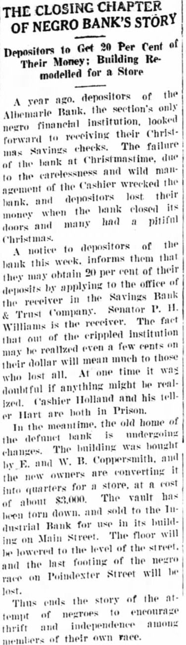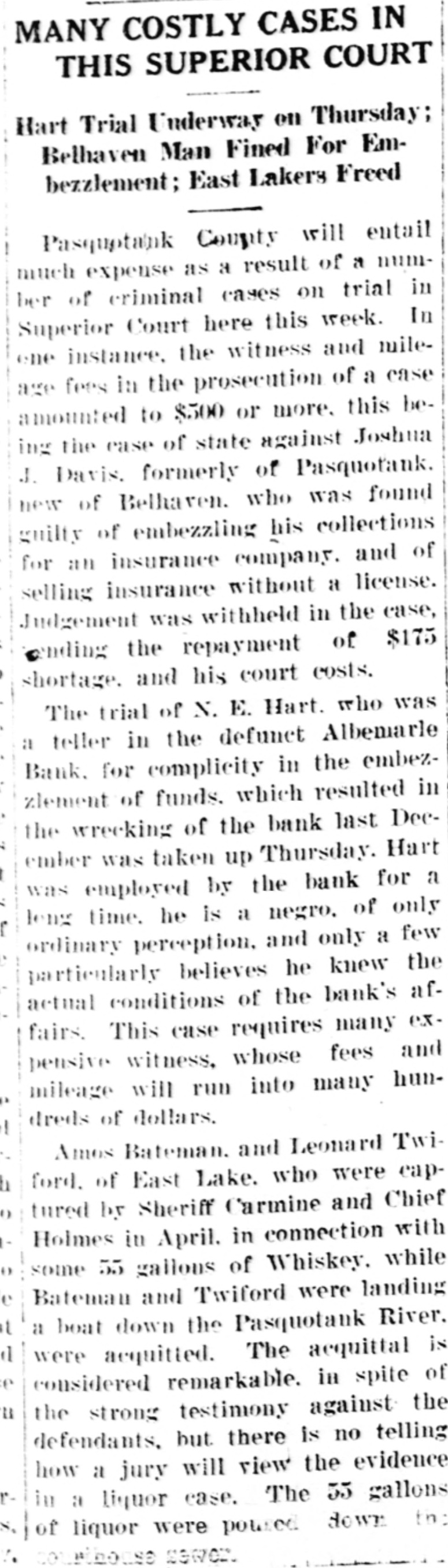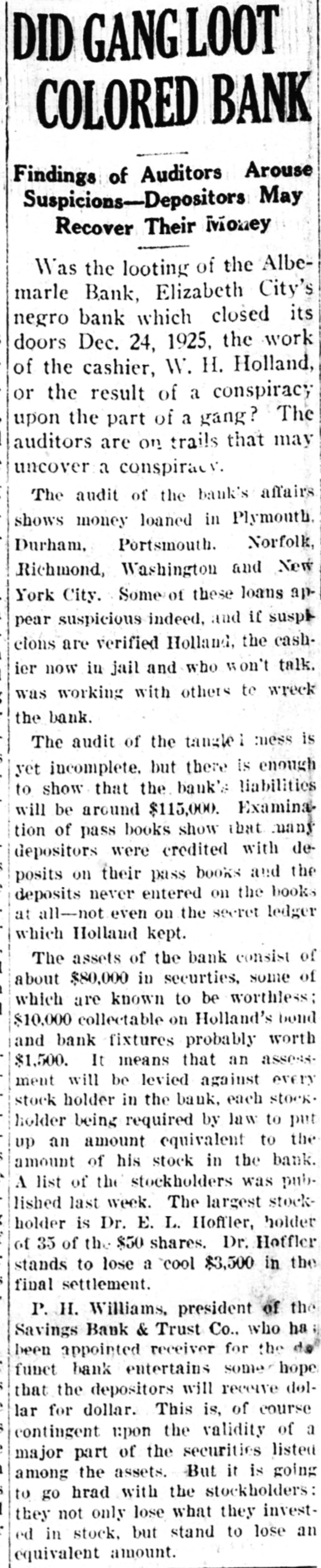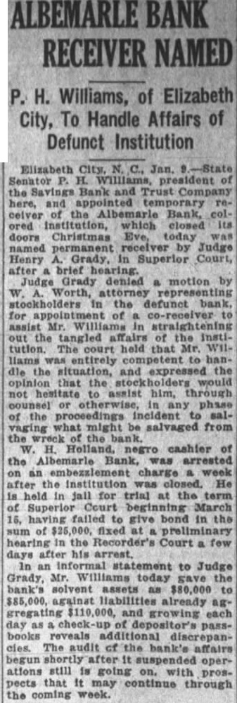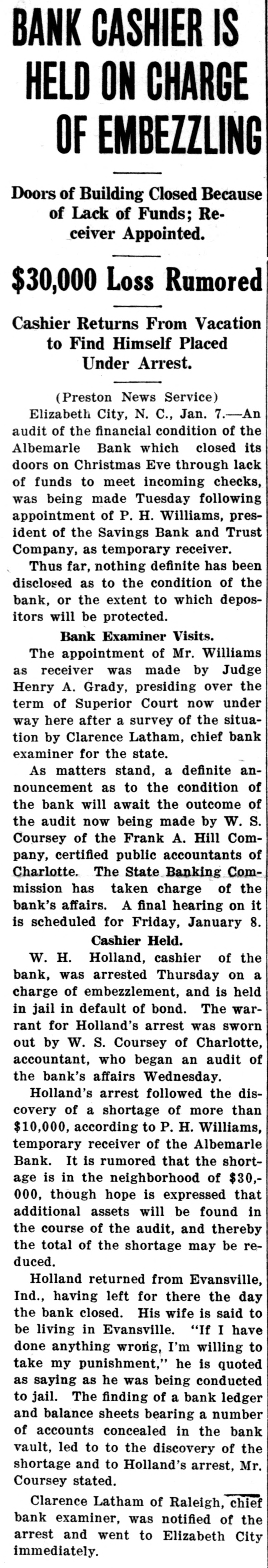 BANK CASHIER IS HELD ON CHARGE OF EMBEZZLING Doors of Building Closed Because of Lack of Funds; Receiver Appointed. $30,000 Loss Rumored Cashier Returns From Vacation to Find Himself Placed Under Arrest. (Preston News Service) Elizabeth City, N. C., Jan. 7.-An audit of the financial condition of the Albemarle Bank which closed its doors on Christmas Eve through lack of funds to meet incoming checks, was being made Tuesday following appointment of P. H. Williams, president of the Savings Bank and Trust Company, as temporary receiver. Thus far, nothing definite has been disclosed as to the condition of the bank, or the extent to which depositors will be protected. Bank Examiner Visits. The appointment of Mr. Williams as receiver was made by Judge Henry A. Grady, presiding over the term of Superior Court now under way here after a survey of the situation by Clarence Latham, chief bank examiner for the state. As matters stand, a definite announcement as to the condition of the bank will await the outcome of the audit now being made by W. S. Coursey of the Frank A. Hill Company, certified public accountants of Charlotte. The State Banking Commission has taken charge of the bank's affairs. A final hearing on it is scheduled for Friday, January 8. Cashier Held. W. H. Holland, cashier of the bank, was arrested Thursday on a charge of embezzlement, and is held in jail in default of bond. The warrant for Holland's arrest was sworn out by W. S. Coursey of Charlotte, accountant, who began an audit of the bank's affairs Wednesday. Holland's arrest followed the discovery of a shortage of more than $10,000, according to P. H. Williams, temporary receiver of the Albemarle Bank. It is rumored that the shortage is in the neighborhood of $30,000, though hope is expressed that additional assets will be found in the course of the audit, and thereby the total of the shortage may be reduced. Holland returned from Evansville, Ind., having left for there the day the bank closed. His wife is said to be living in Evansville. "If I have done anything wrong, I'm willing to take my punishment," he is quoted as saying as he was being conducted to jail. The finding of a bank ledger and balance sheets bearing a number of accounts concealed in the bank vault, led to to the discovery of the shortage and to Holland's arrest, Mr. Coursey stated. Clarence Latham of Raleigh, chief bank examiner, was notified of the arrest and went to Elizabeth City immediately.