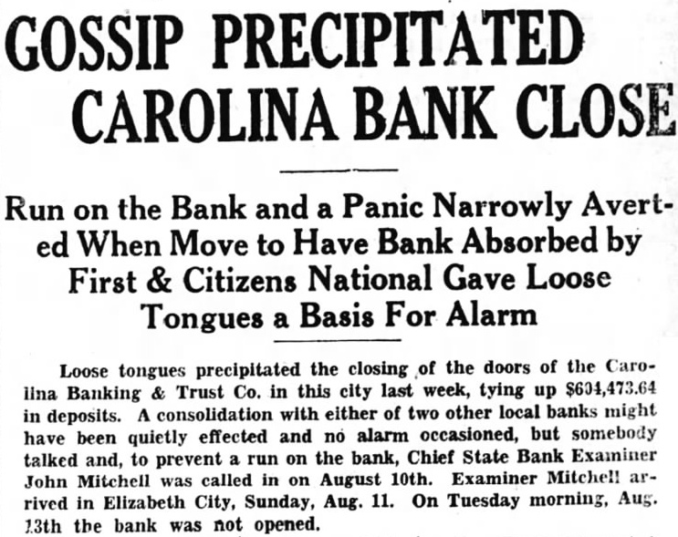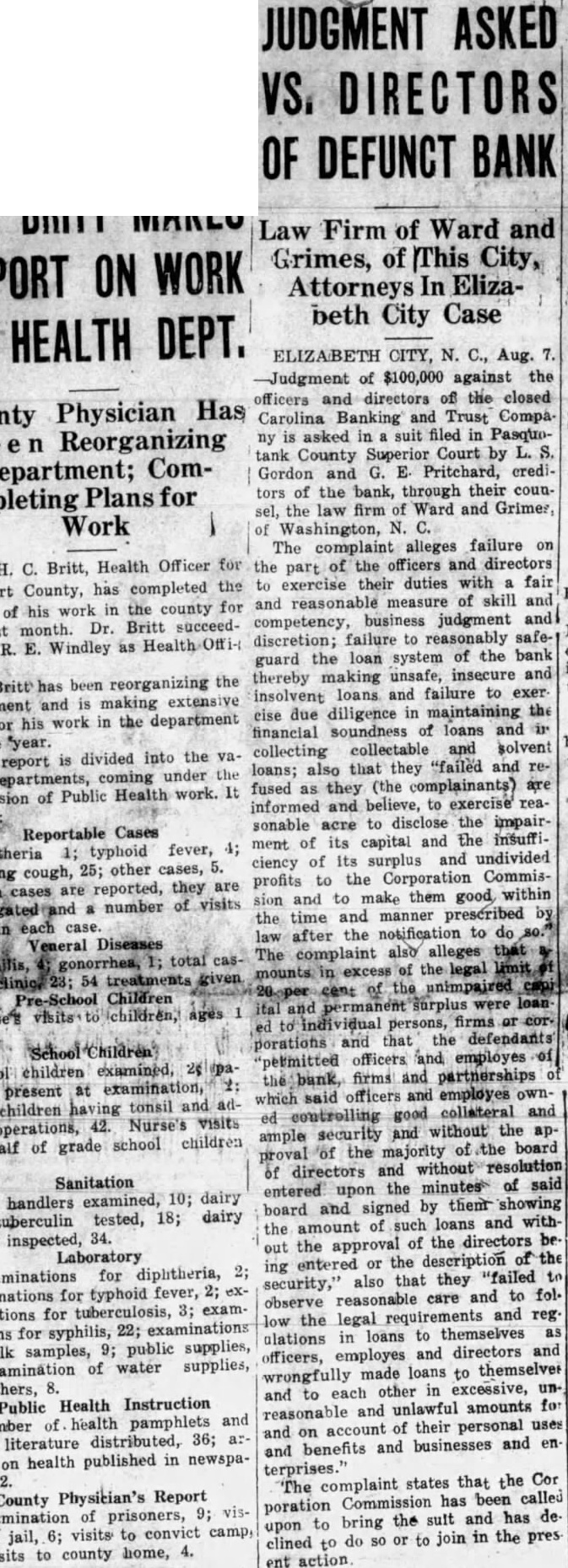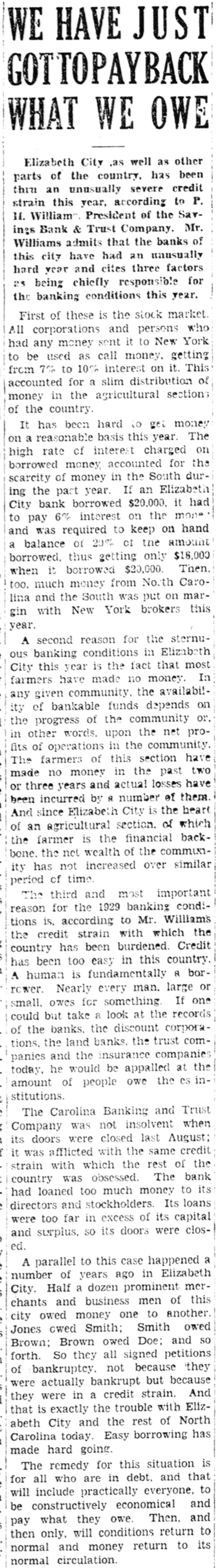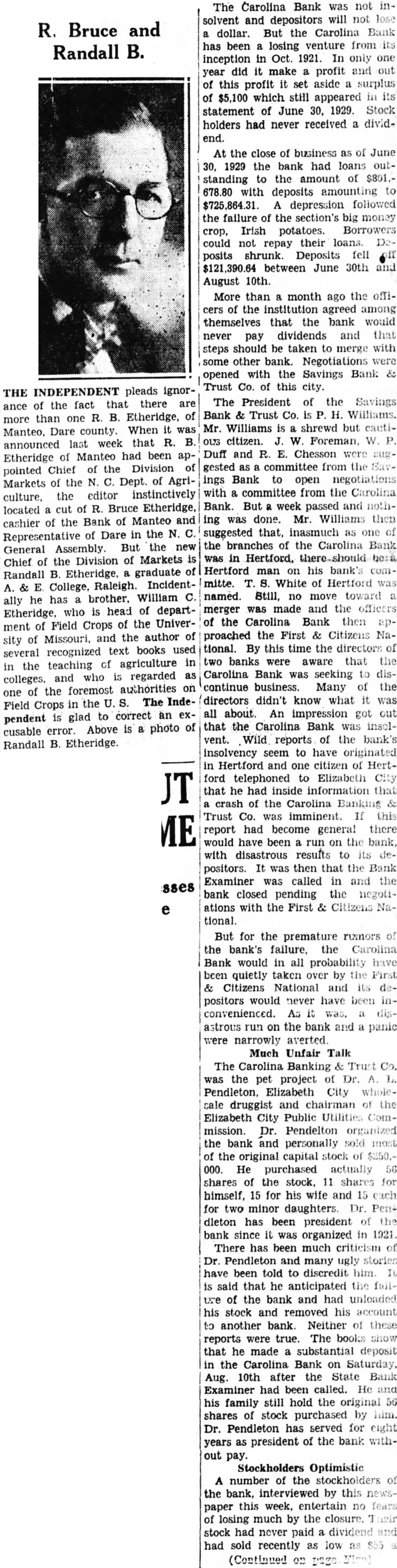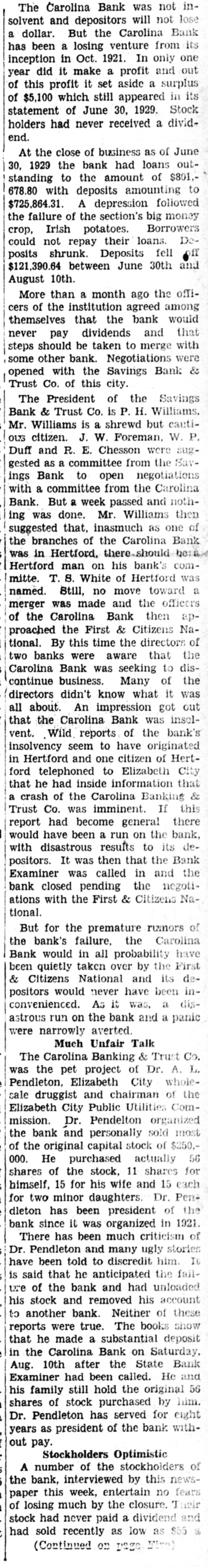The Carolina Bank was not insolvent and depositors will not lose dollar. But the Carolina Bank has a been a losing venture from its inception in Oct. 1921. In only one out did it make a profit and year of this profit it set aside a surplus its of $5,100 which still appeared in statement of June 30, 1929. Stock holders had never received a dividend. At the close of business as of June 1929 the bank had loans out30, standing to the amount of $801.- to 678.80 with deposits amounting $725,864.31. A depression followed the failure of the section's big money Irish potatoes. Borrowers Decrop, could not repay their loans. ff posits shrunk. Deposits fell é $121,390.64 between June 30th and August 10th. More than a month ago the officers of the institution agreed among themselves that the bank would never pay dividends and that steps should be taken to merge with some other bank. Negotiations were opened with the Savings Bank & Trust Co. of this city. The President of the Savings Bank & Trust Co. is P. H. Williams. Mr. Williams is a shrewd but cautiour citizen. J. W. Foreman, W. P. Duff and R. E. Chesson were suggested as a committee from the Savings Bank to open negotiations with a committee from the Carolina Bank. But a week passed and nothing was done. Mr. Williams then suggested that, inasmuch as one of the branches of the Carolina Bank was in Hertford, here-should be: Hertford man on his bank's committe. T. S. White of Hertford was named. Still, no move toward a merger was made and the officers of the Carolina Bank then approached the First & Citizens National. By this time the directors of the two banks were aware that Carolina Bank was seeking to discontinue business. Many of the directors didn't know what it was all about. An impression got out that the Carolina Bank was insolvent. Wild reports of the bank's insolvency seem to have originated Hertford and one citizen of Hertto inside in that ford he telephoned had information Elizabeth that City a crash of the Carolina Banking & Trust Co. was imminent. If this report had become general there would have been a run on the bank, dewith disastrous results to its positors. It was then that the Bank Examiner was called in and the bank closed pending the negotiations with the First & Citizens National. But for the premature rumors of the bank's failure, the Carolina Bank would in all probability have been quietly taken over by the First & Citizens National and its depositors would never have been dis- inconvenienced. As it was. a astrous run on the bank and a panic were narrowly averted. Much Unfair Talk The Carolina Banking & Trust was the pet project of Dr. A. Elizabeth City wholeand Pendleton, sale druggist chairman Utilities of Com- the Elizabeth City Public mission. Dr. Pendelton organized the bank and personally sold most of the original capital stock of $250.000. He purchased actually 56 shares of the stock, 11 shares for himself, 15 for his wife and 15 each for two minor daughters. Dr. Pendleton has been president of the bank since it was organized in 1921. There has been much criticism of Dr. Pendleton and many ugly stories It have been told to discredit him. is said that he anticipated the failure of the bank and had unloaded his stock and removed his account to another bank. Neither of these reports were true. The books show that he made a substantial deposit in the Carolina Bank on Saturday, Aug. 10th after the State Bank Examiner had been called. He and his family still hold the original 56 shares of stock purchased by him. Dr. Pendleton has served for eight years as president of the bank without pay. Stockholders Optimistic A number of the stockholders of the bank, interviewed by this newspaper this week, entertain no fears of losing much by the closure. I heir stock had never paid a dividend and had sold recently as low as $55 (Continued on page