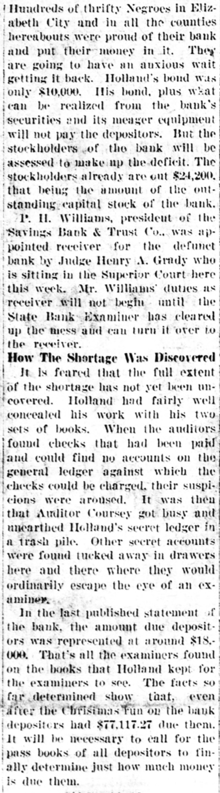 Hundreds of thrifty Negroes in Elizabeth City and in all the counties hereabouts were proud of their bank and put their money in it. They are going to have an auxious wait getting it back. Holland's bond was only $10,000. His bond, plus what can be realized from the bank's securities and its meager equipment will not pay the depositors. But the stockholders of the bank will be assessed to makeinp the deficit. The stockholders already are out $24,200. that being the amount of the outstanding capital stock of the bank. P. 11. Williams, presideut of the Savings Bank & Trust Co., was appointed receiver for the defunet bank by Judge Henry A. Grady who is sitting in the Superior Court here this week. Mr. Williams duties as receiver will not beglu until the State Bank Examiner has cleared up the miss and can turn if over to the receiver. How The Shortage Was Discovered It is feared that the full extent of the shortage has not yet been uncovered. Holland had fairly well concealed his work with his two sets of books. When the auditors found checks that had been paid and could find no accounts on the general ledger against which the checks could be charged. their suspicions were aroused. It was then that Auditor Coursey got busy and unearthed Holland's secret ledger in a trash pile. Other secret accounts were found tucked away in drawers here and there where they would ordinarily escape the eye of an examiner. In the last published statement of the bank, the amount due depositors was represented at around $18.000. That's all the examiners found on the books that Holland kept for the examiners to see. The facts so far determined show that, even after the Christmas run on the bank depositors had $77,117.27 due them. It will be necessary to call for the pass books of all depositors to finally determine just how much money is due them.